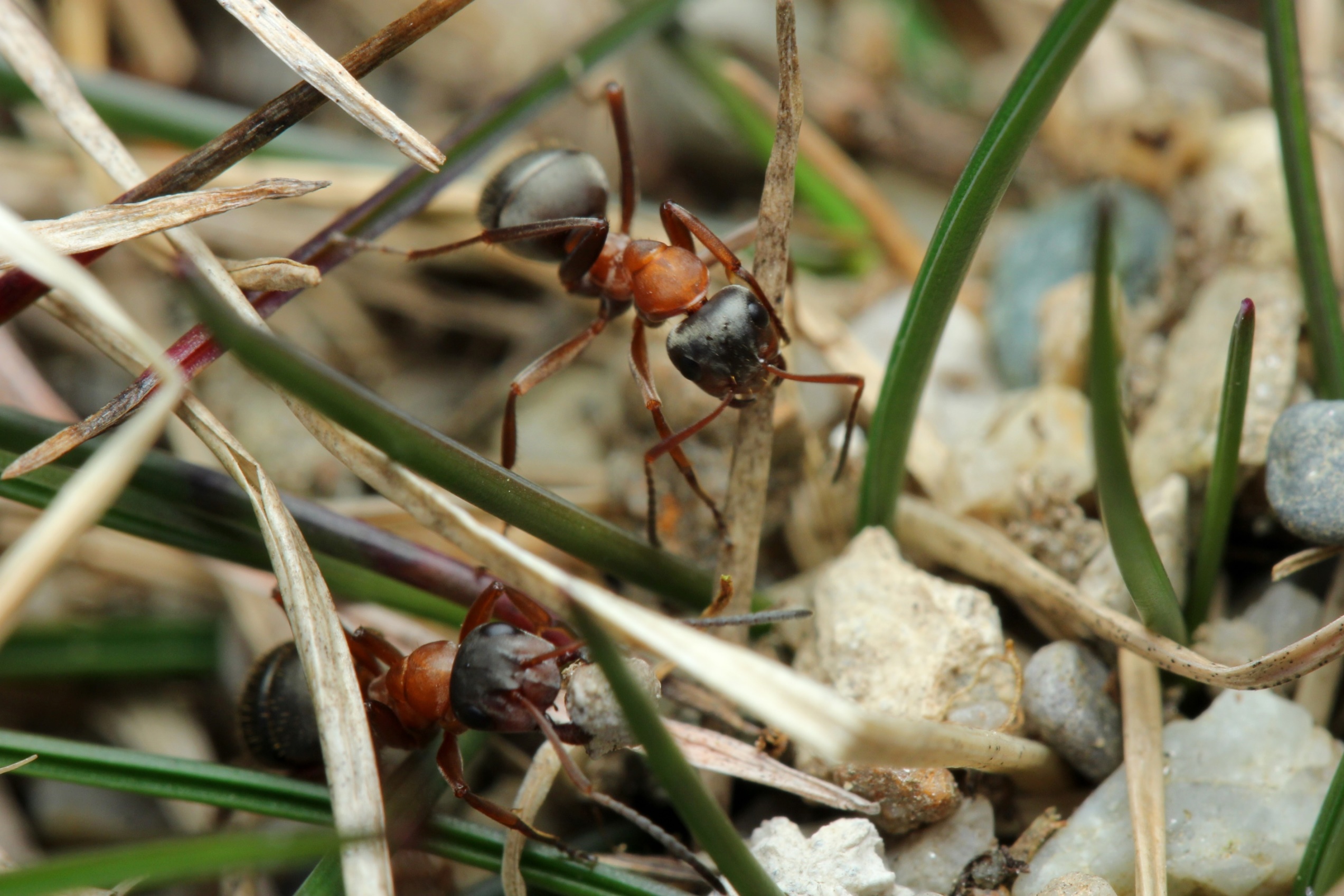 11. Noch einmal F. rufibarbis? Nein, das ist Formica (Raptiformica) sanguinea, die beiden Arten könnte man u. U. verwechseln! Auf den 2. Blick gibt es aber Unterschiede: Meist andere Neststruktur, im Nest selbst fast immer mit Hilfsameisen anzutreffen, in der Morphologie - abgesehen v. Clypeus-Vorderrand, den man mit freiem Auge kaum erkennen kann - eine etwas "kräftigere" Statur: Eine Spur größer, der Kopf etwas breiter, die Gaster meist etwas rundlicher....