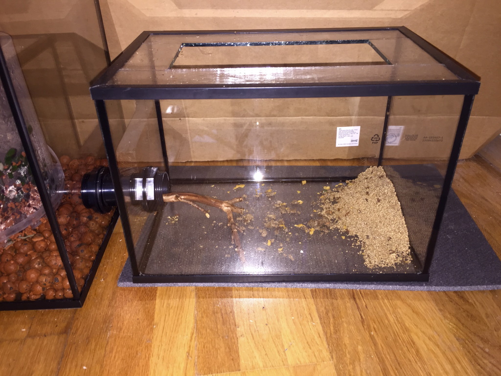 Erst dachte ich, dass evtl. der Deckel nicht richtig auflag und sie zwischen Deckel und Rand durchgequetscht hatten. Hab dann aber die Ausbruchsstelle lokalisiert: Die Hälterungsbox hat eine Anschlussstelle für einen Schlauch um daran ein Futter und Abfallbecken anzuschließen. Derzeit ist nichts angeschlossen und ich hab das Loch mit fest gerollten Küchenrollenblättern verschlossen. …da haben sie sich durchgearbeitet.