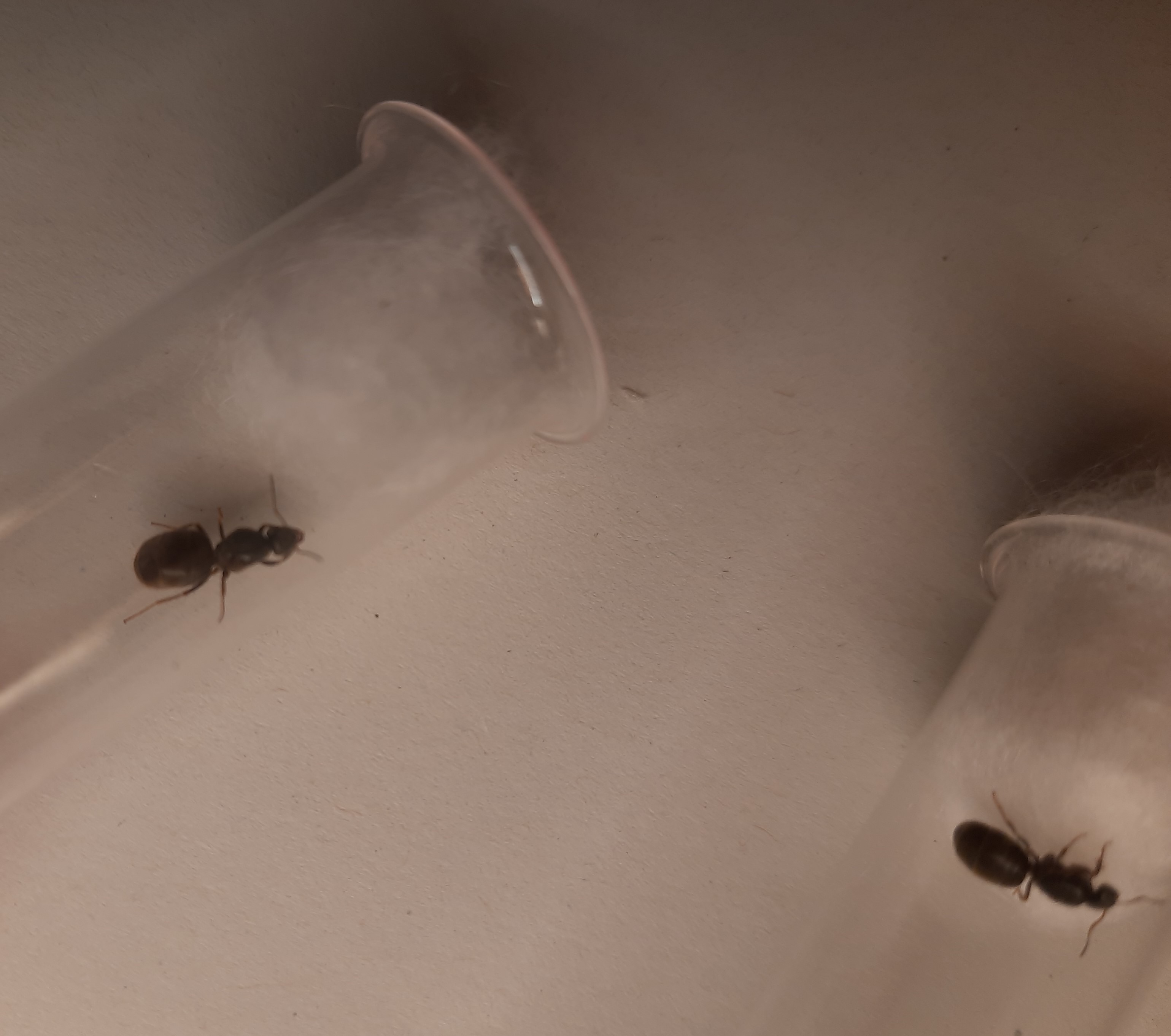In einem Reagenzglas hat sich ein Wassertropfen vor der Watte gebildet. Ich wĂŒrde ein neues machen, bei dem die Watte dicht genug ist und die Ameise nochmals umsiedeln.