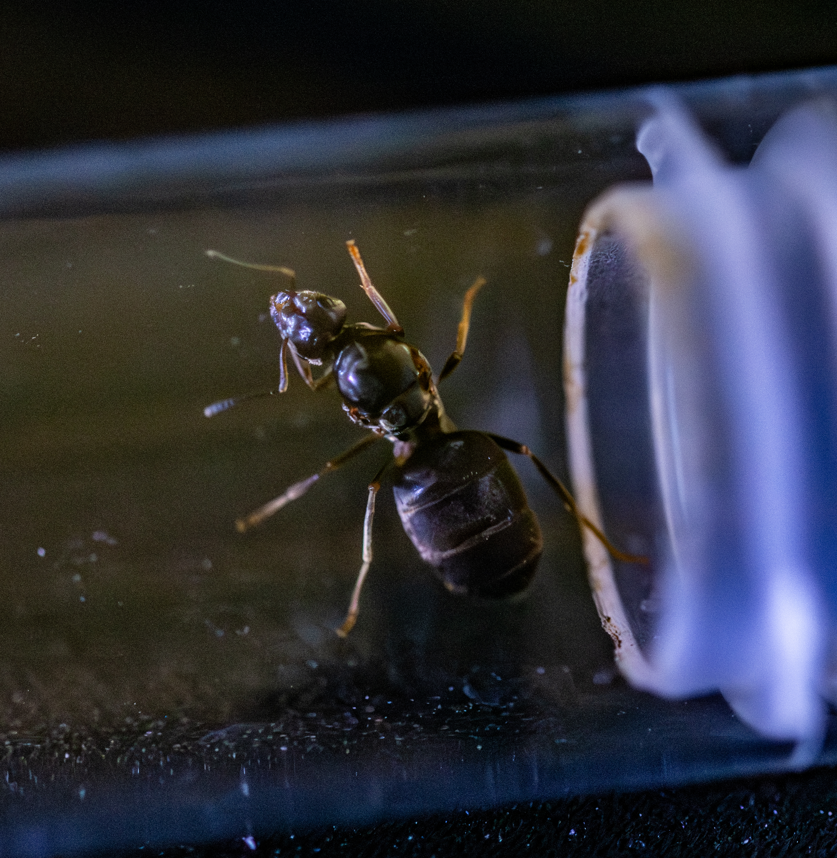 Ich habe mit dem Makroobjektiv versucht, so gut es geht, mit zusätzlicher Lichtquelle Fotos zu machen. Rumpf scheint etwas grösser und ich bilde mir auch ein, Ansätze von abgeworfenen Flügeln zu sehen.