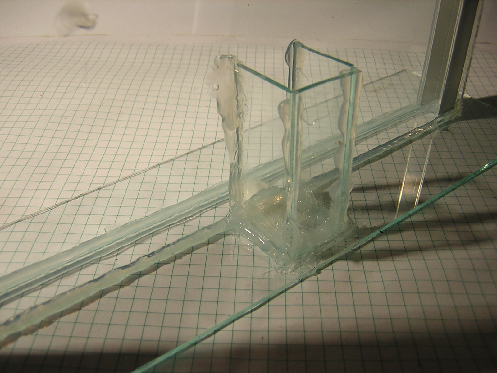 Statt noch ein Loch zur Bewässerung in das U-Profil oder Glas zu bohren, habe ich ein kleines Stück Watte zwischen der Rückseite der Farm und dem Glasboden gelegt. Und anschließend alles mit Silikon verklebt. Für den Wassertank habe ich mir kleine Scheibenstücke zurecht gebrochen und nachträglich befestigt. Ach so! Und den Deckel(plus (Belüftung)) habe ich einfach vergessen. Deswegen muss jetzt erstmal ein zurecht gebrochener Glasstreifen als Deckel dienen.