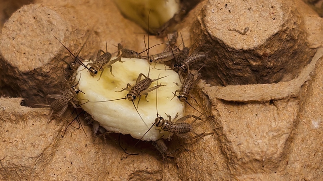 Zusätzlich habe ich zwei kleine Dosen mit jeweils etwa 50 Heimchen gekauft und diese in ein Plastikbecken mit Eierkartons etc. gesetzt.
