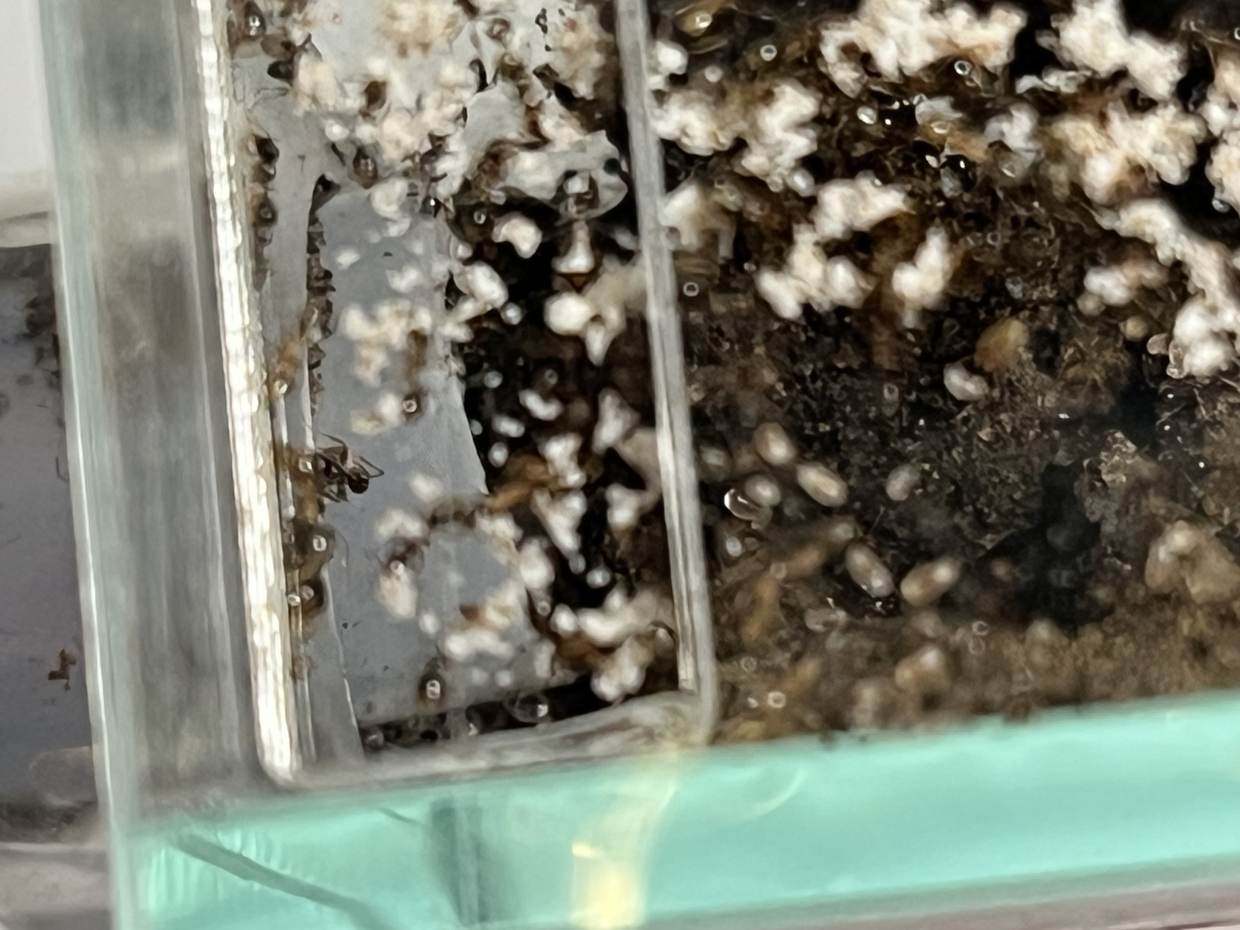 Vor etwa einer Woche habe ich das Gipsnest vorerst wieder entfernt, da es aus meiner Sicht nicht wirklich angenommen wurde. Sie haben dort kaum Aktivitäten gezeigt, vermutlich weil das Reagenzglas recht groß ist und ihnen noch ausreichend Platz bietet.