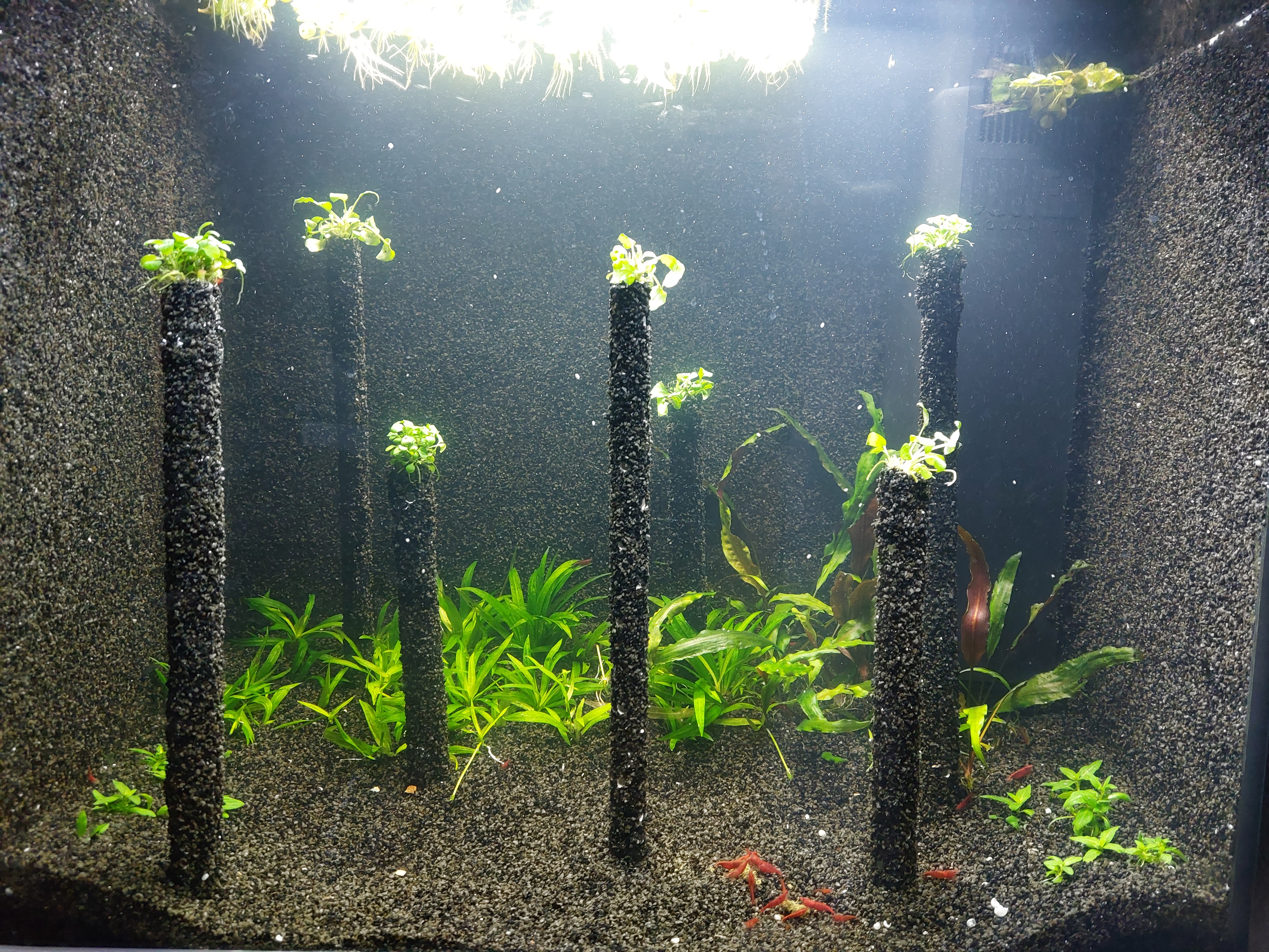 Bild des 120l "Cube": Mach ich nicht mehr, bin fast abgekratzt, weil der verstrichene Aquarien-Silikon mit dem ich den Kies an die Scheiben geklebt hab, zu viel Essigsäuredämpfe produziert hat und ich mich damit vergiftet hab...