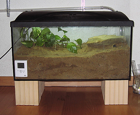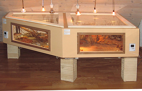 und besseren Einblick, an der Frontseite zwei Glasscheiben angebracht. Die Grundfläche beträgt etwa 1 Quadratmeter. Der Bodengrund ist besteht aus einem Sand- Lehmgemisch, der auch in der Terraristik verwendet wird.
