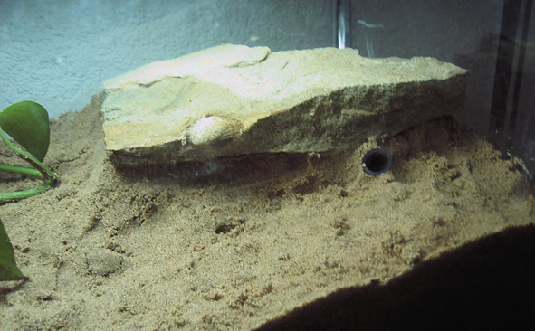 Als Farm habe ich mich für ein Glasbecken mit etwa 50l-Fassungsvermögen entschieden. Die Einsicht erfolgt, wenn überhaupt nur über den Boden.