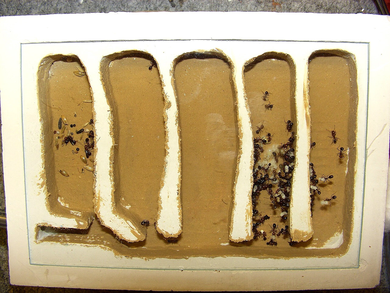 Das kann zum einen eine eigene Ameiseninsel mit festem Untergrund sein, in dem Ameisen nicht buddeln können (z.B. Gips), oder ein Behälter (Terrarium, Plastikbecken),