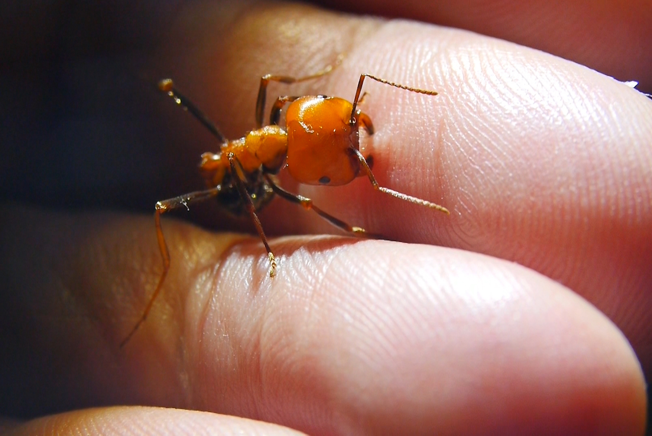 Messor cephalotes Major beißt in Finger 4
