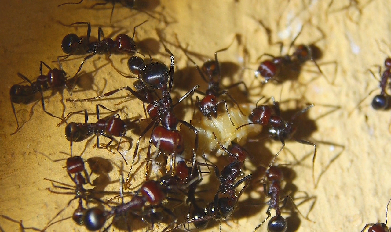 Messor cephalotes zerlegen Mehlkäferpuppe