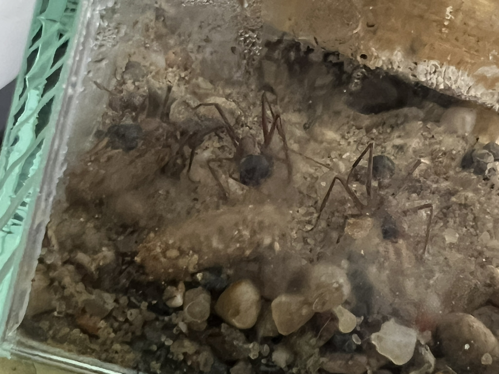 Zwei verpuppte Larven die aus dem Nest in die Arena getragen wurden. Es sind jedoch immer eine oder zwei Arbeiterinnen bei diesen.