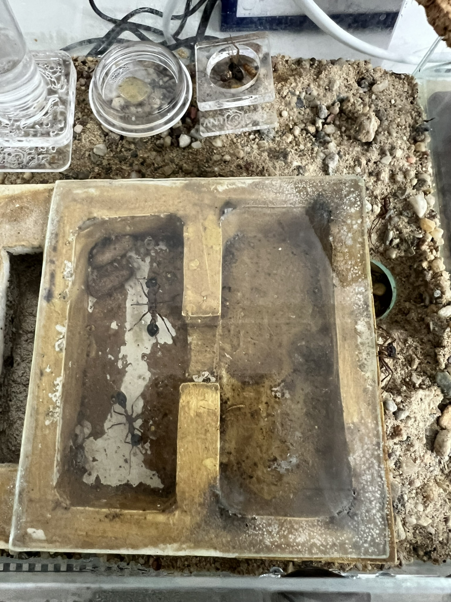 Blick ins aktuelle Nest. 2 Puppen und circa 10 Larven. Insgesamt sind leider nur noch 4 Arbeiterinnen samt Königin übrig.
