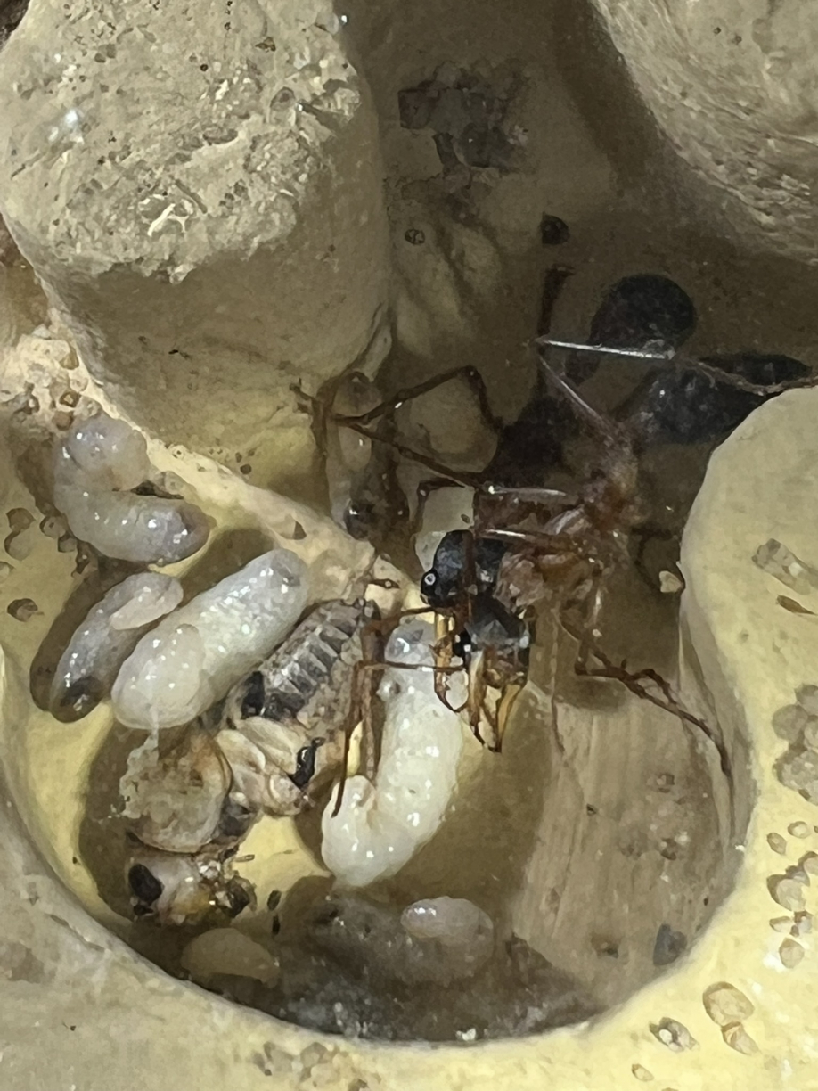 Larven im Nest samt Steppengrille als Futter.