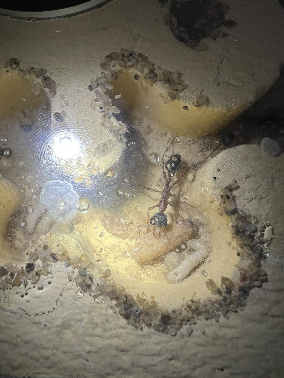 Eine Puppe und drei Larven im unteren Teil des Nestes.