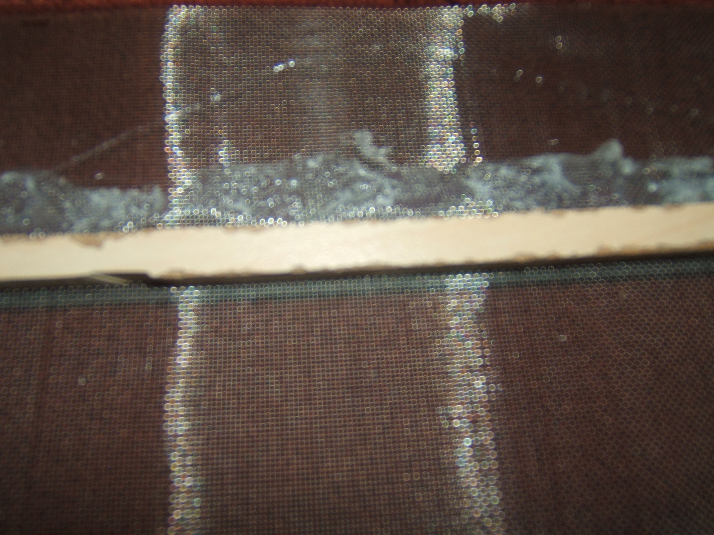 Nun kam mir die Idee,mit kleinen Holzlatten die ich zusÀtzlich am Rand anklebe,Die Gaze dicht am Glas zu halten.