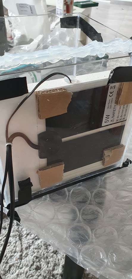 und darauf dann die 18,5x19 Platte drauf und diese mit Silikon eingeklebt und beschwert damit sie an Ort und Stelle bleibt