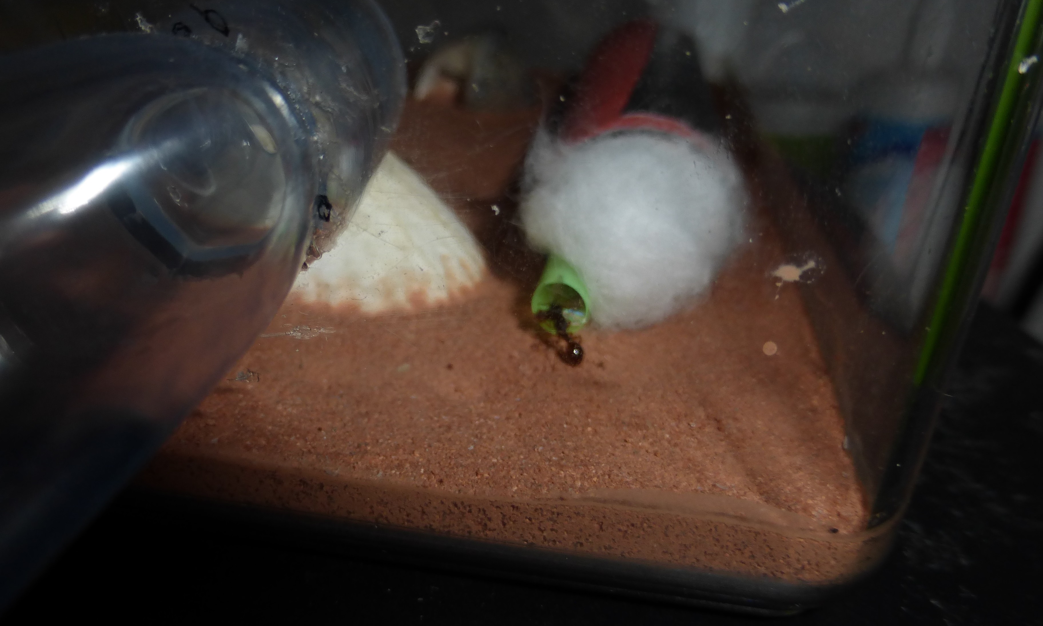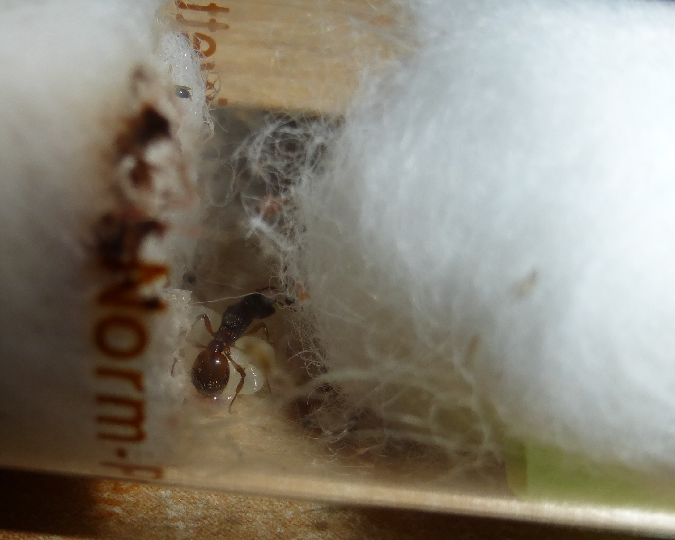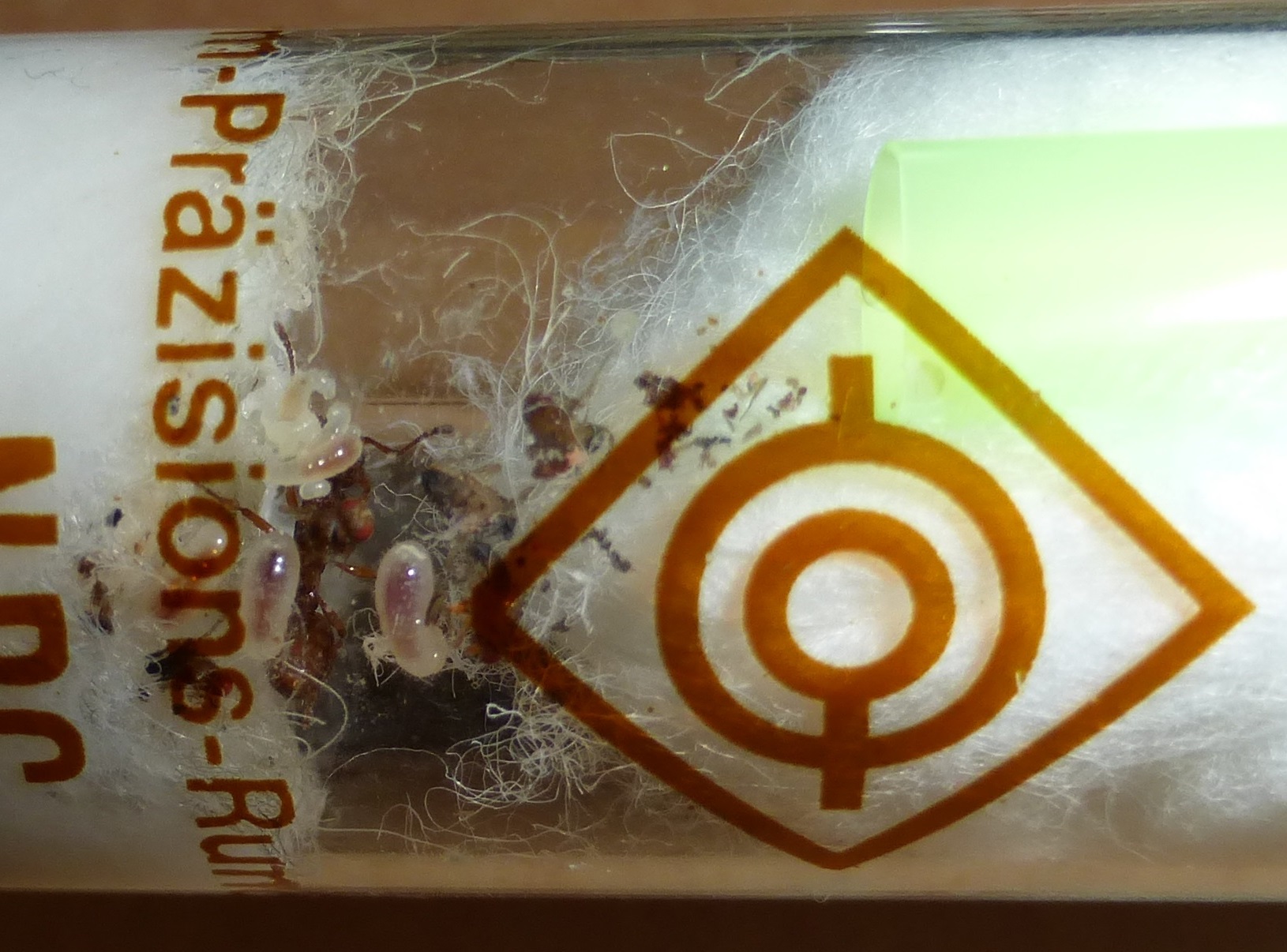 Sie isst weiterhin fleißg ihre Fruchtfliegen und hat sogar noch ein paar Eier gelegt. :-) Zudem scheint sie eine entspannte Ameisenkönigin zu sein und macht beim Fotografieren eine gute Figur! Ganz links an der Watter könnte womöglich schon eine Larve sein, aber das ist bisher schwer zu sagen.