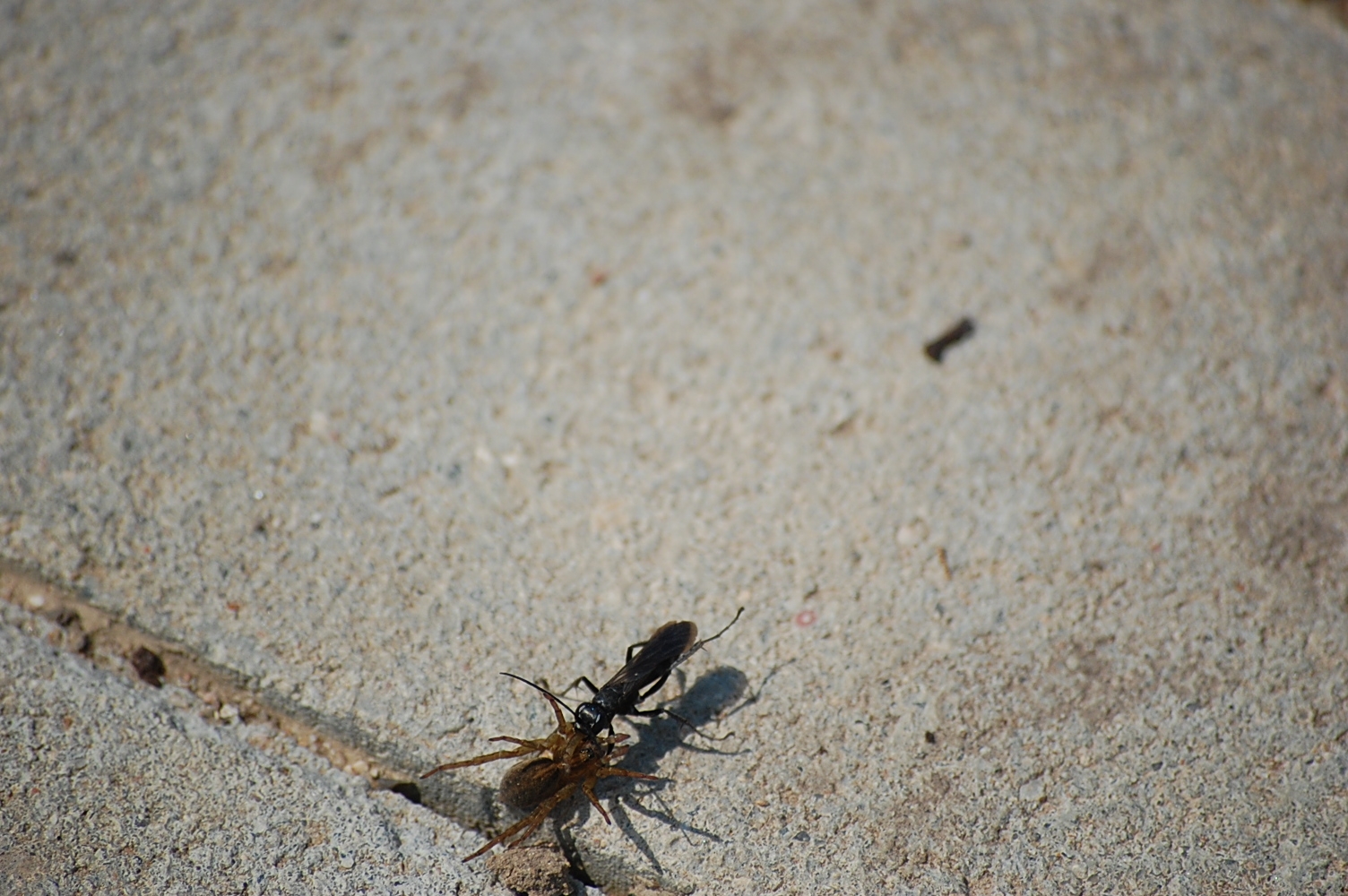 ein Kollege von mir hat kĂŒrzlich einige Fotos gemacht und meinte es handelt sich um eine Ameise, die eine Spinne wegschleppt.
