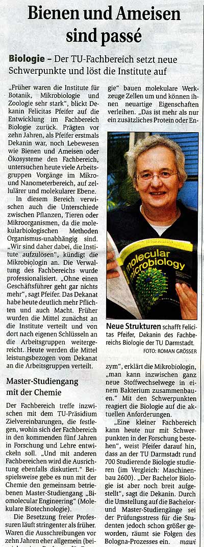 [font=Times New Roman]Es geht um den Fachbereich Biologie der Technischen UniversitÀt Darmstadt. Den Artikel habe ich unten einkopiert, das 2. Bildchen enthÀlt einen kleinen Abschnitt, der unten an dem Haupttext abgeschnitten werden musste. Wahrscheinlich ist der Artikel in wenigen Tagen auch online bei [/font][font=Times New Roman]www.echo-online.de[/font][font=Times New Roman] .[/font]