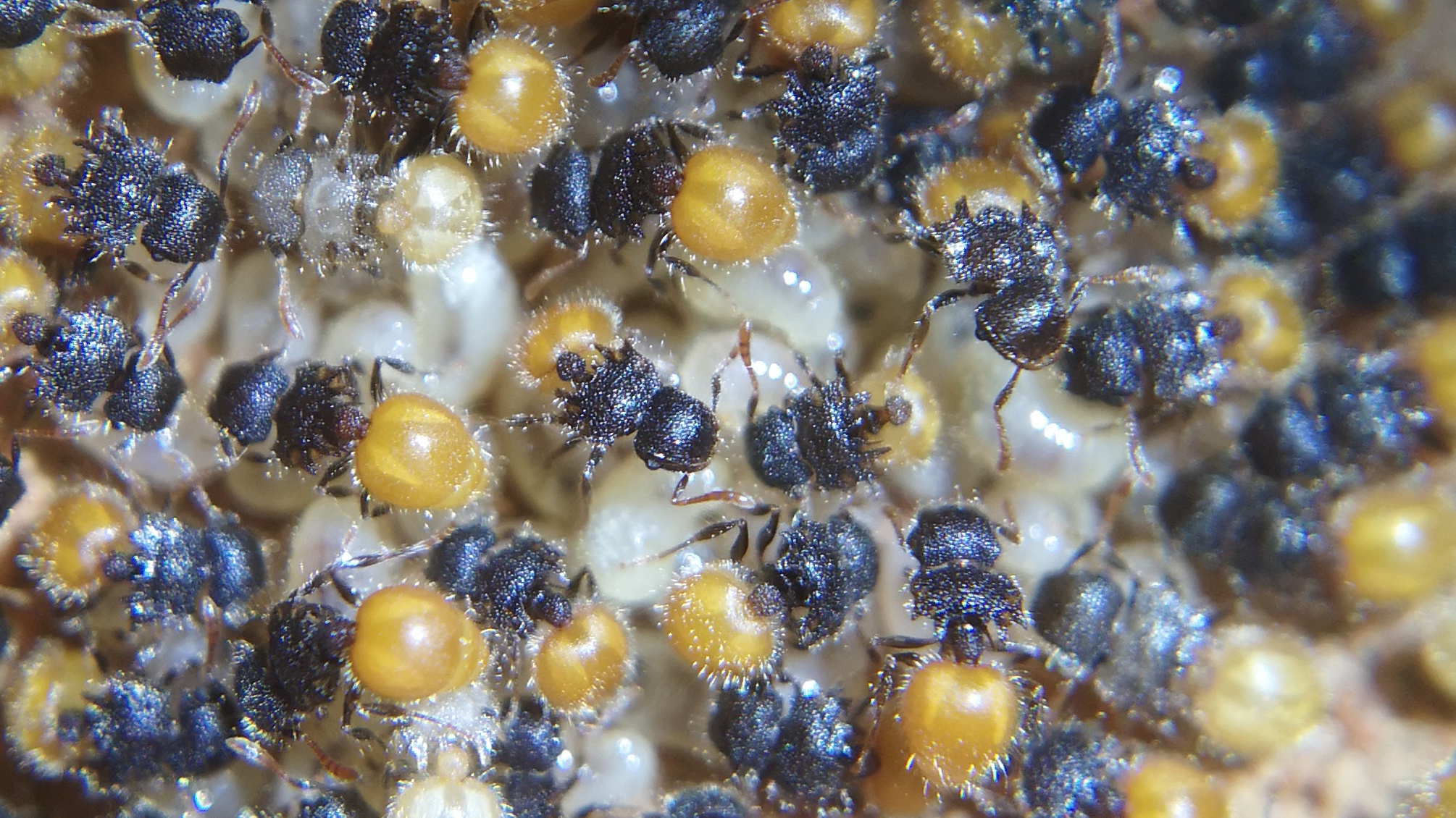 Camponotus brasiliensis - obwohl das Nest verschiedene Temperatur- und Feuchtigkeitsbereiche bietet, wird die gesamte Brut in der selben Kammer gelagert.