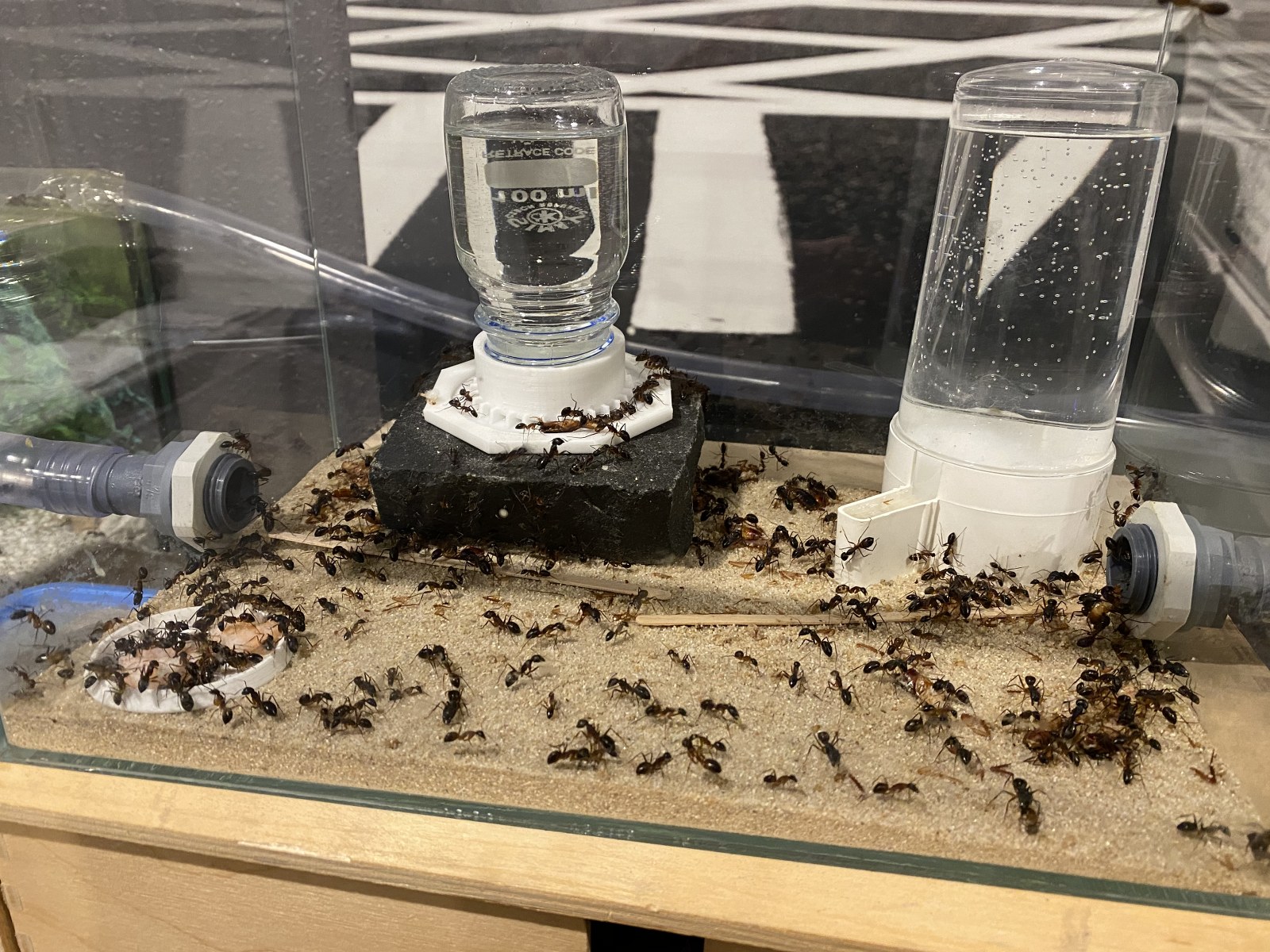 Hier mal Bilder vom kleinen Futterbecken der C. Fellah Anlage (Lebendfutter, Futter, Wasser & Kohlehydrate) mit der neuen Tränke nach byFormica Art - so kann ich auf je 2 Tränken verteilt 500 ml Invertzuckerlösung und 1 Liter Wasser anbieten und habe eine Weile Ruhe.