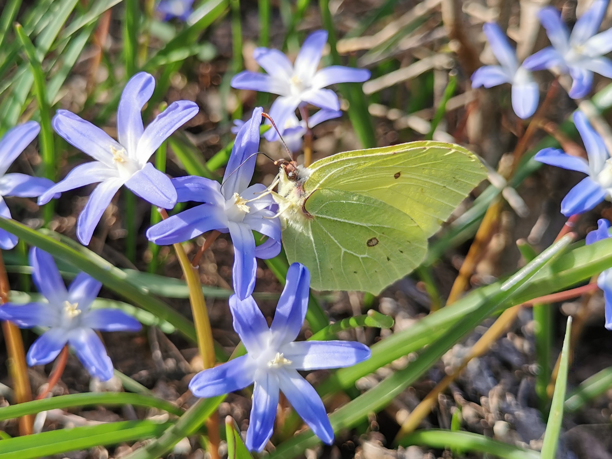 Ein schönes Bild ist mir von Gonepterxy rhamni auf einem Blauen Schneeglanz (Scilla forbesii) gelungen.