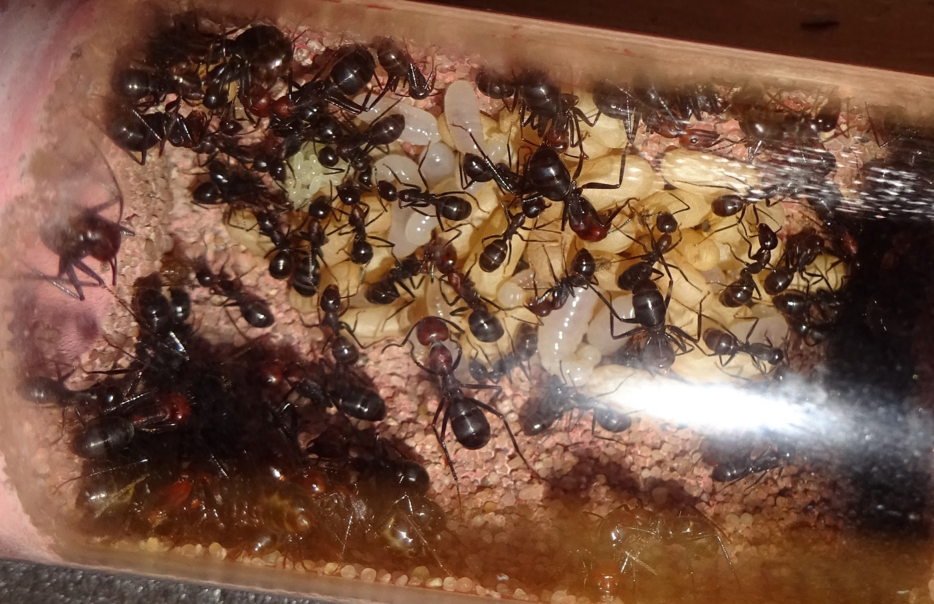 ein Volk der Schwarzen Wegameise unter einer Steinplatte: