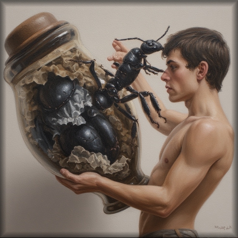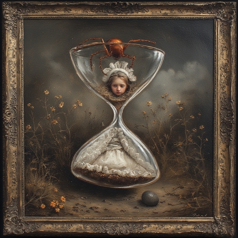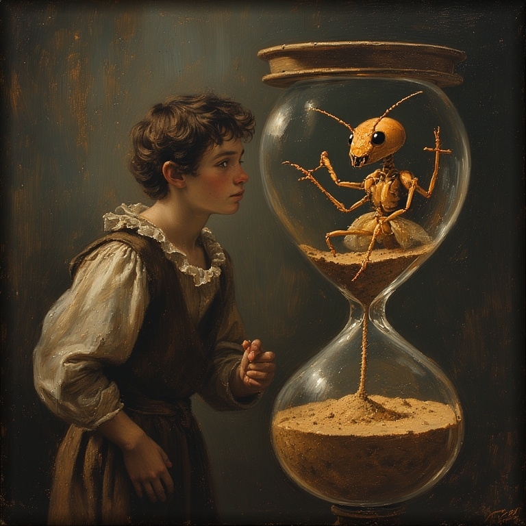 Er lockt die JĂĽnglinge mit seiner blassen Hand. "Schau her!", ruft er, "die Jungfrau in dem Glas",