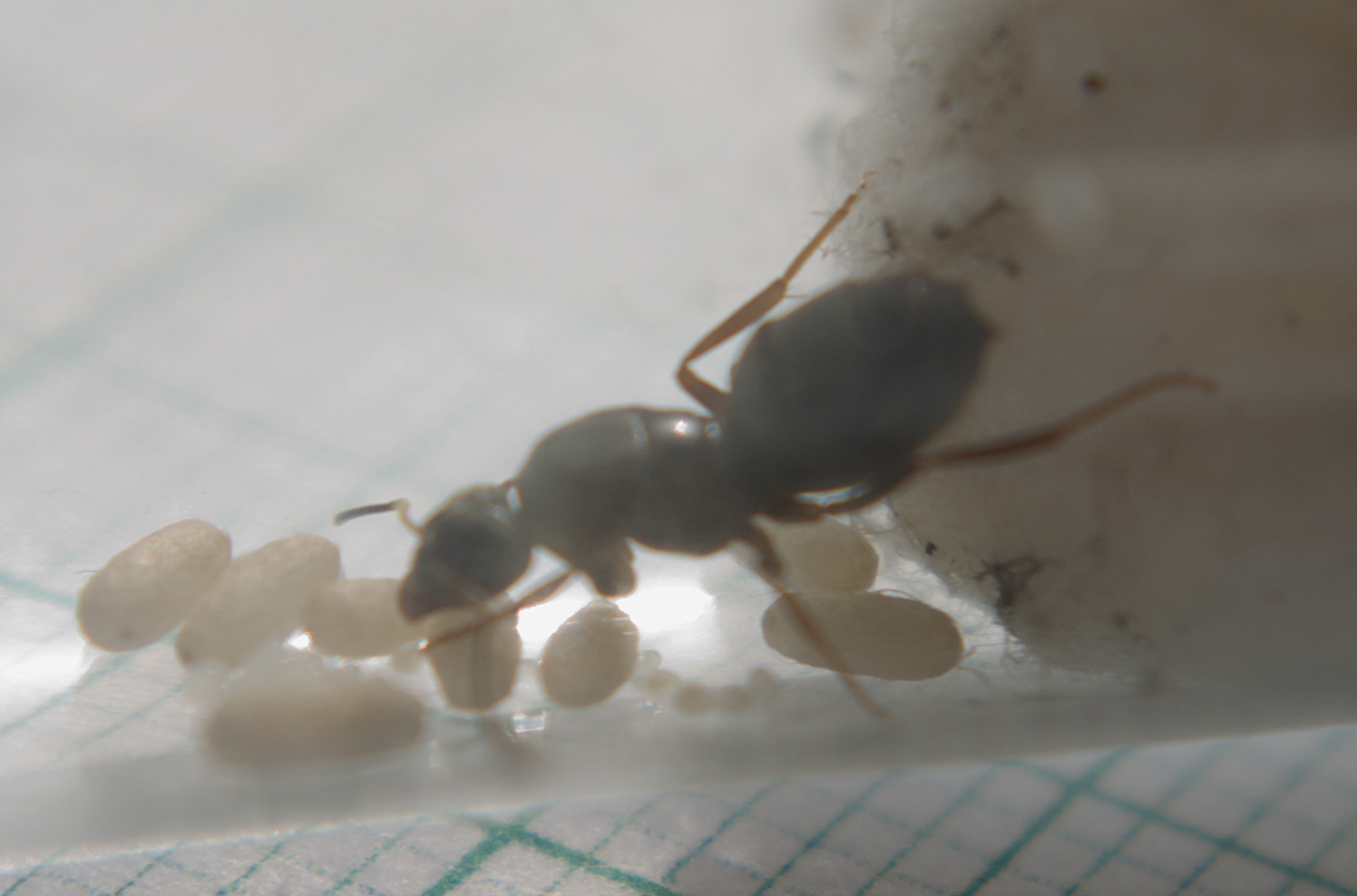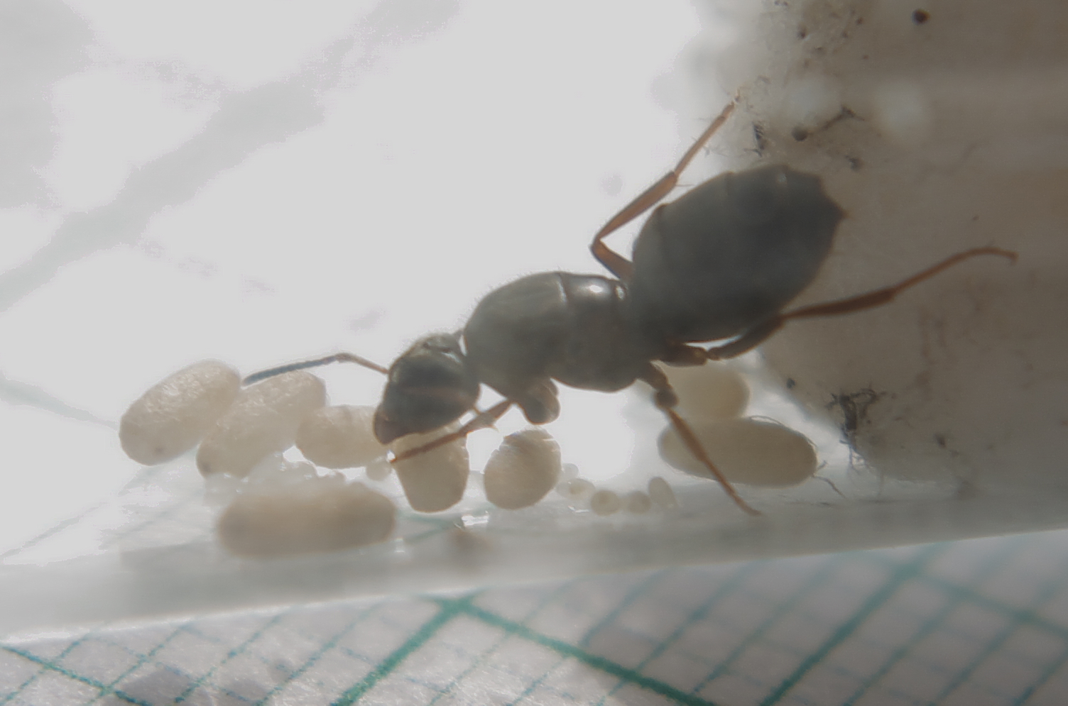 Ich würde sagen, vom Habitus her gesehen Lasiussp ., aber sicher nicht Lasius niger. Dafür ist der Rücken zu flach u. der Thorax zu lang gestreckt. Wenn man die Länge mit 8/9mm festlegen könnte, wäre es vielleicht Lasius brunneus. Da ist die Gyne etwas kleiner, zarter gebaut als L. niger u. weist eine geringere Krümmung der dorsalen Seite des Thorax auf. Hier hab ich einmal eine derartige Gyne fotografiert: