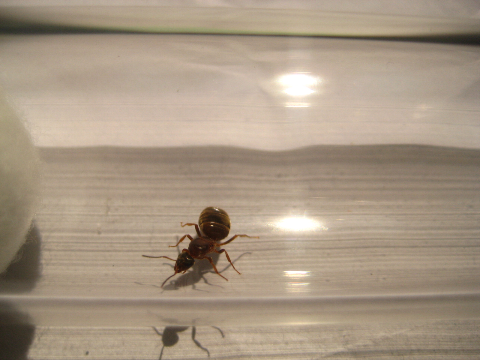 Gyne an sich ist 1,2cm groß (etwas größer also als die Anderen) und weißt im Gegensatz zu den anderen gefunden Lasius cf. niger Gynen eine wesentlich höheren Braunanteil auf welcher bei starkem Licht ein wenig beim