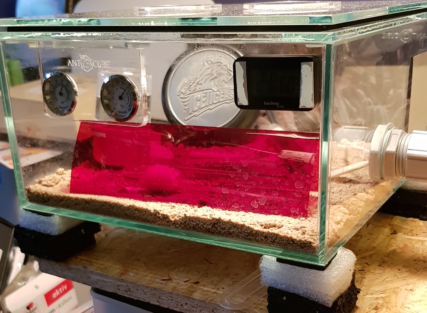 An Futter das verderben kann ist nur noch ein bisschen befeuchtetes Insektenprotein vom Antstore drin (nehm ich morgen raus), ansonsten nur Minor-Körnermischung und Wassertränke.