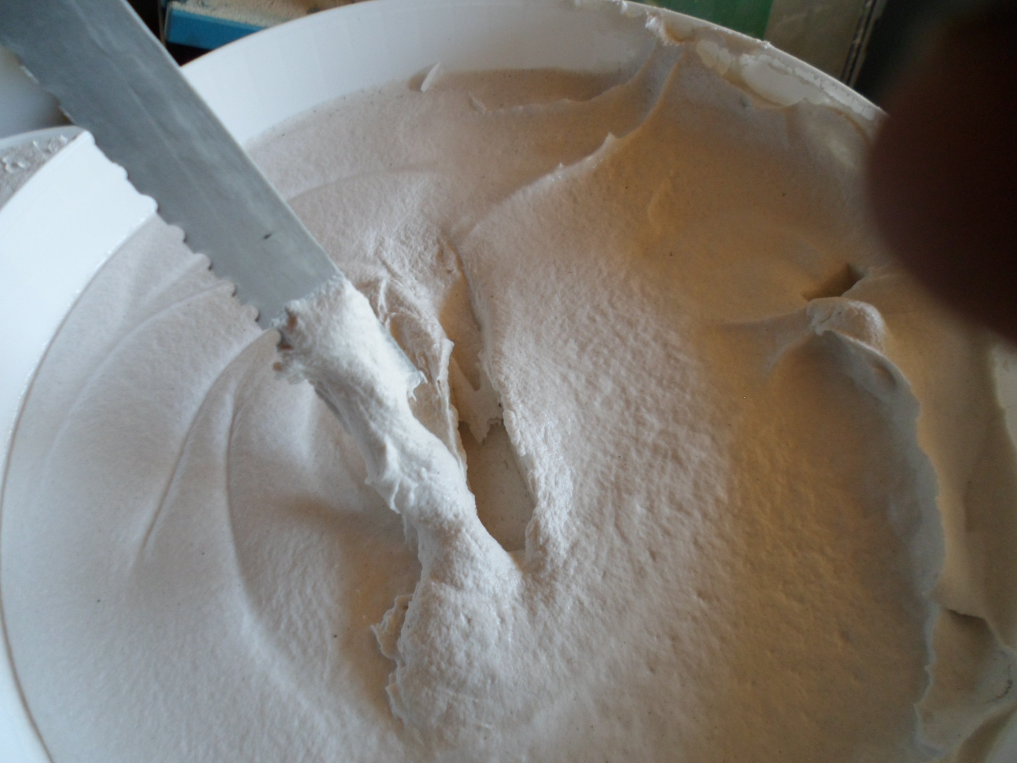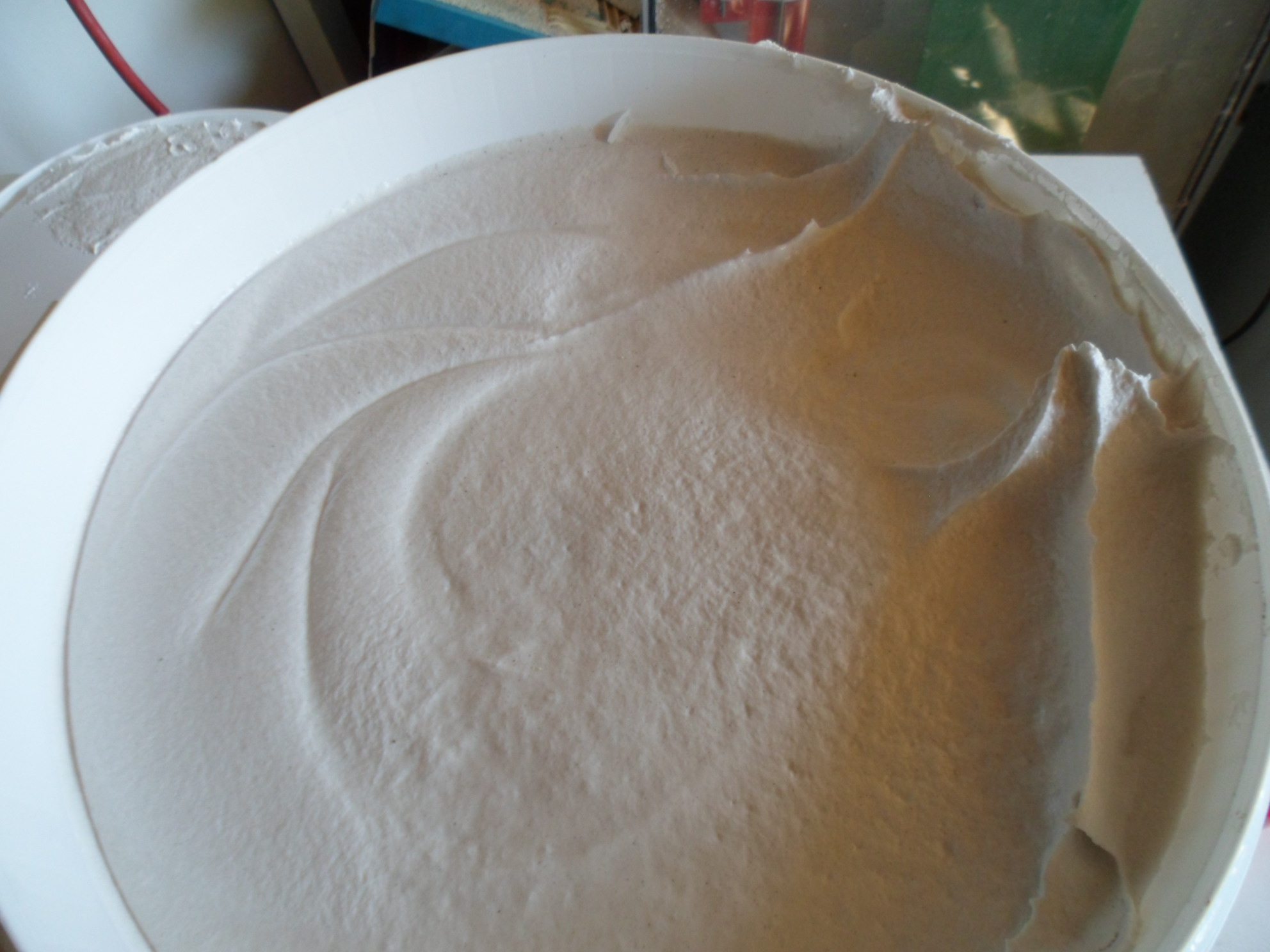 Als nÀchster Schritt wurden exakt 2,5 kg des Materials mit einem Liter Wasser gemischt, es dauert ungefÀhr 2-3 Minuten und man merkt wie das Bindemittel reagiert und das Material Plastisch wird.