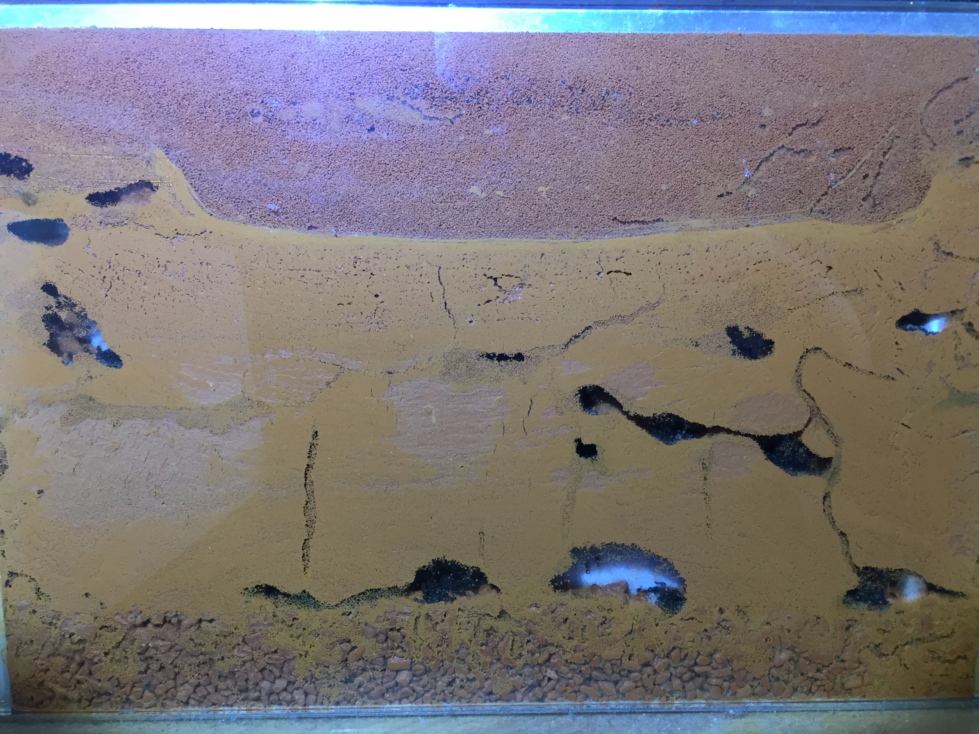 Das Granulat im Nestboden ist bereits frisch gewässert, damit nichts vertrocknet. Über den Sommer ist einiges verdunstet. Zum Glück habe ich schon vor bezug des Nestes ein mit Watte verschlossenes Bewässerungsrohr verlegt. So ging das ganze mit relativ geringen Flucht-Verlusten über die Bühne.