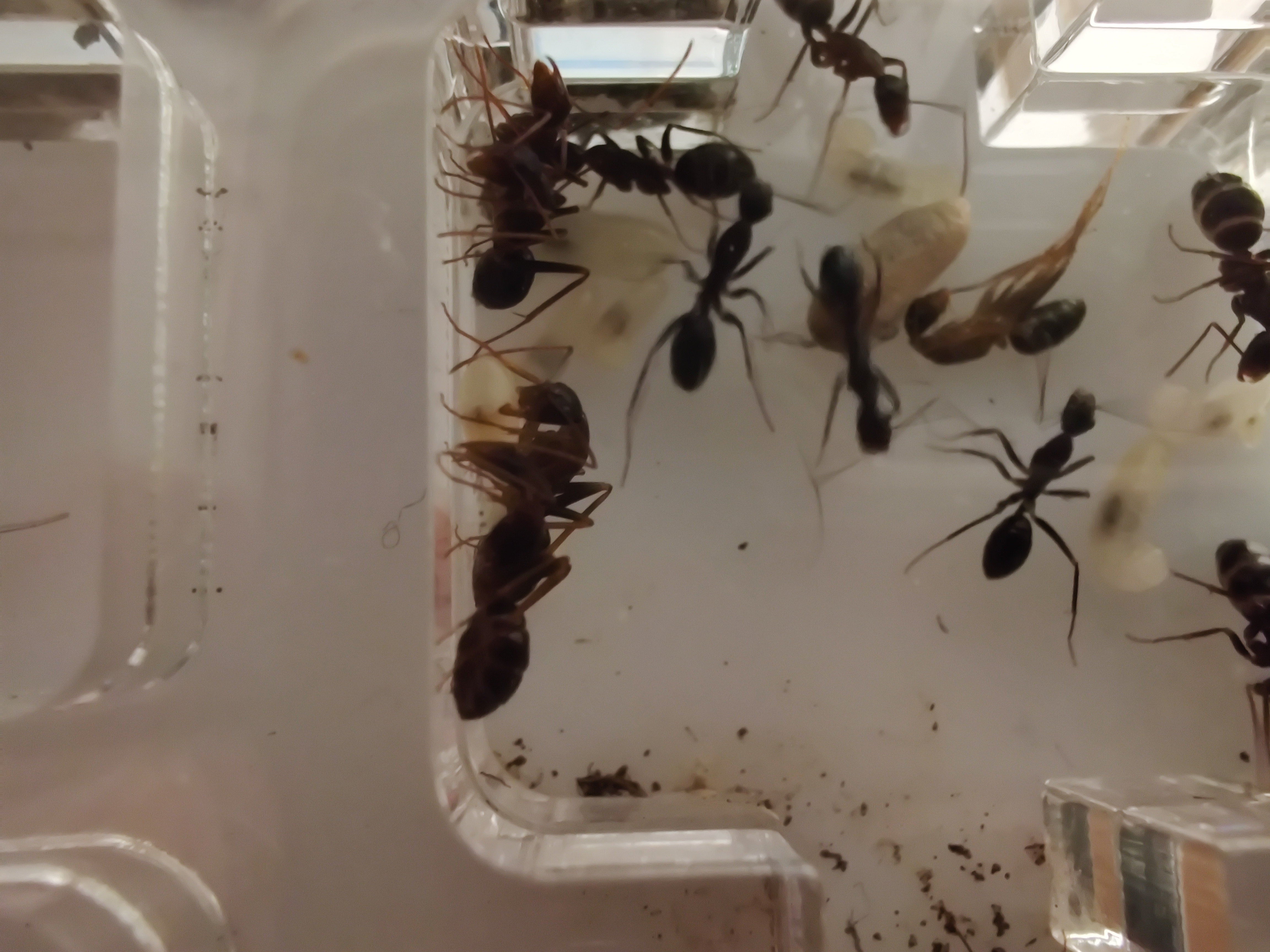 Ich wollte schon vor einer Weile ein Update geben, hatte es aber nicht geschafft. Die Kolonie entwickelt sich recht gut (in meinen Augen) und ist über den Sommer ordentlich gewachsen. Es sind nun insgesamt 18 Arbeiterinnen. Eine ist leider gestorben, aber es könnte sein, dass diese zu den Pygmäen gehört hat (die ja bekanntlich nicht so lange leben). Hier mal ein kleiner Überblick über die Aufteilung in den Kammern.