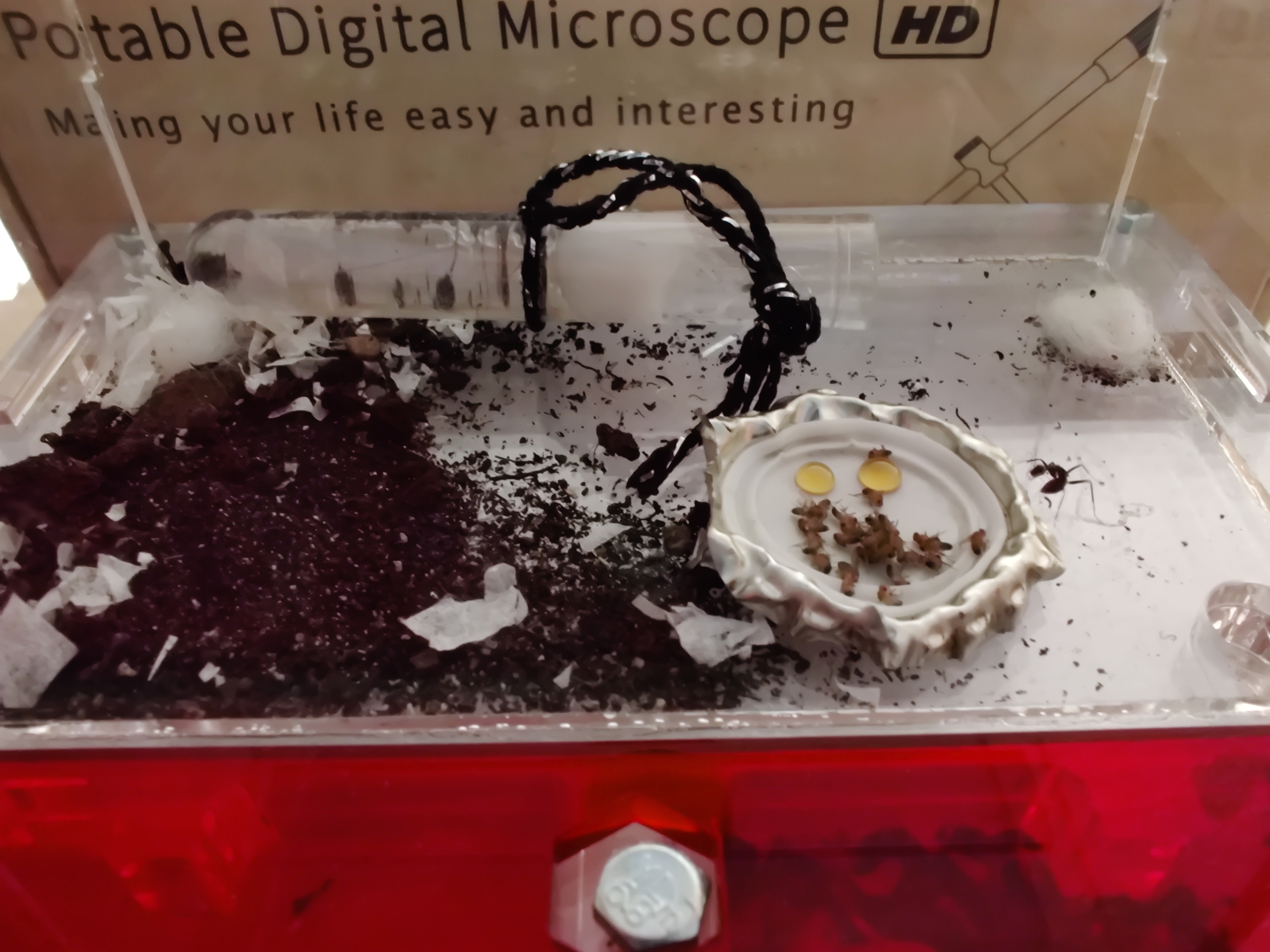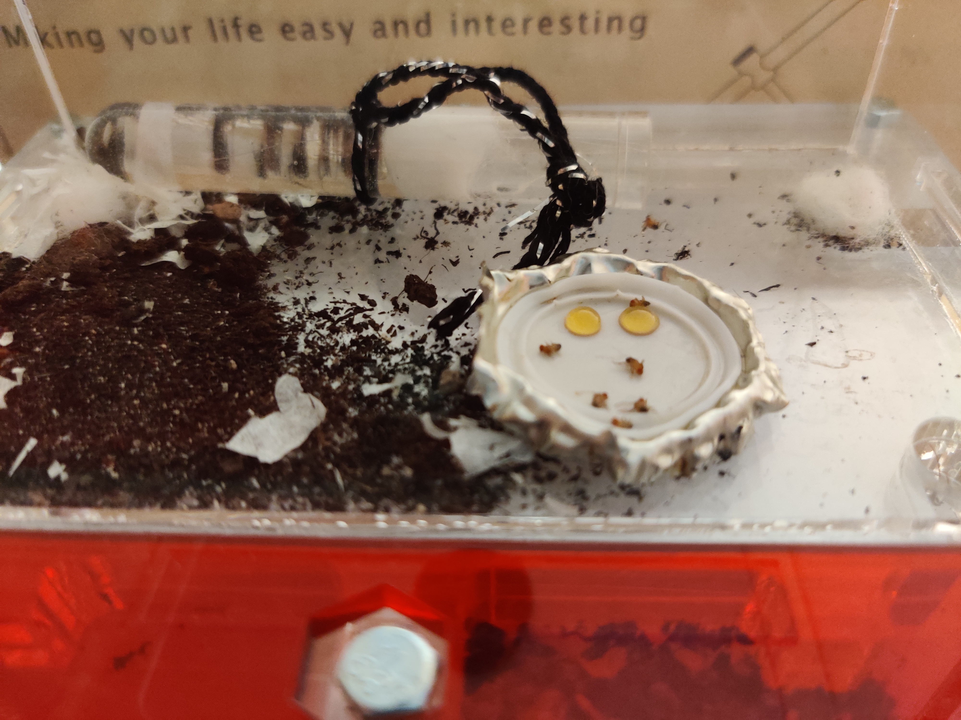 Heute habe ich den kleinen Bewohnern noch mal ein letzes Festmahl mit kleinen Drosophila und zwei Tropfen Ahornsirup angeboten. Ebenfalls habe ich das Zuckerwasser erneuert.