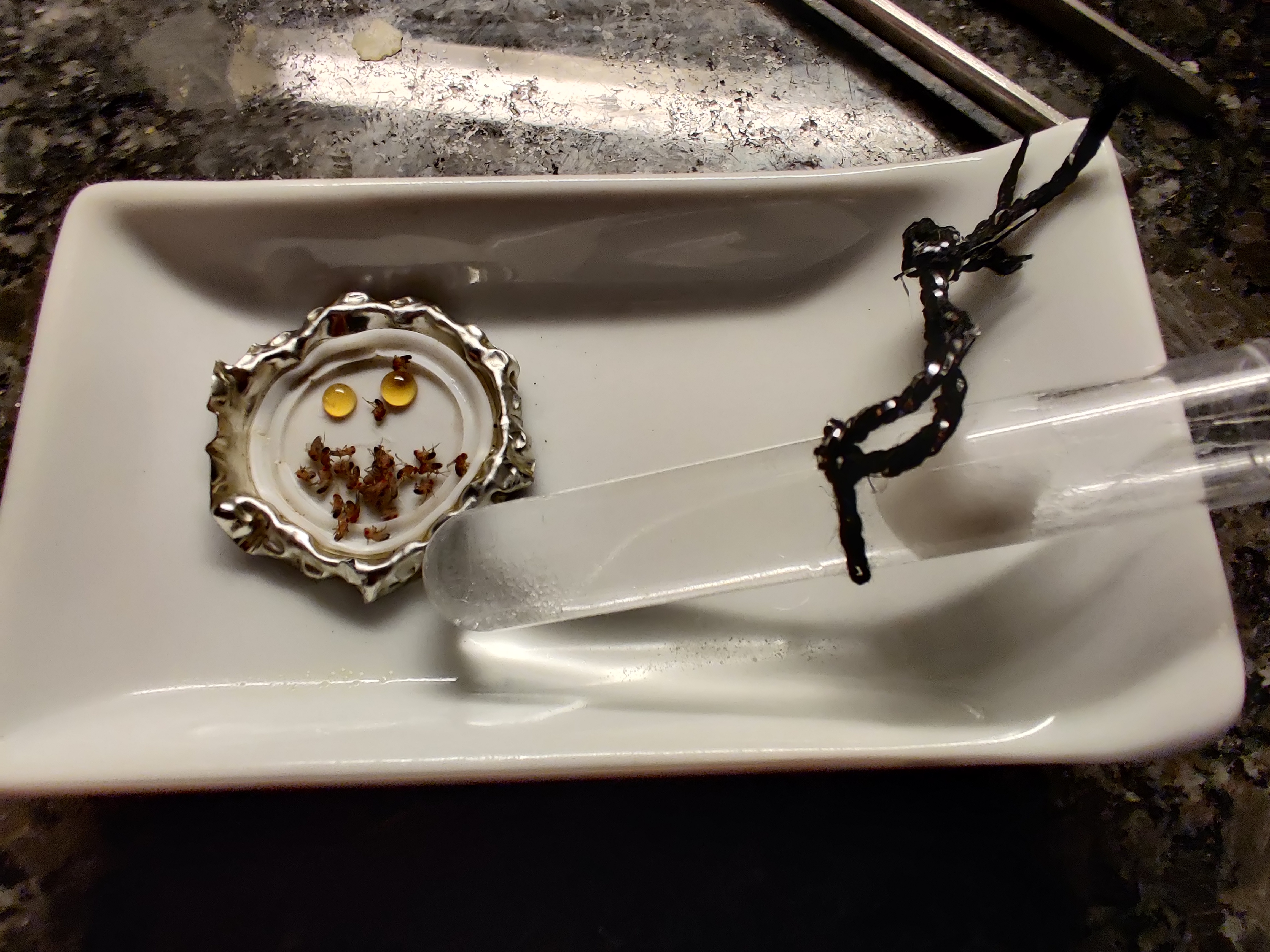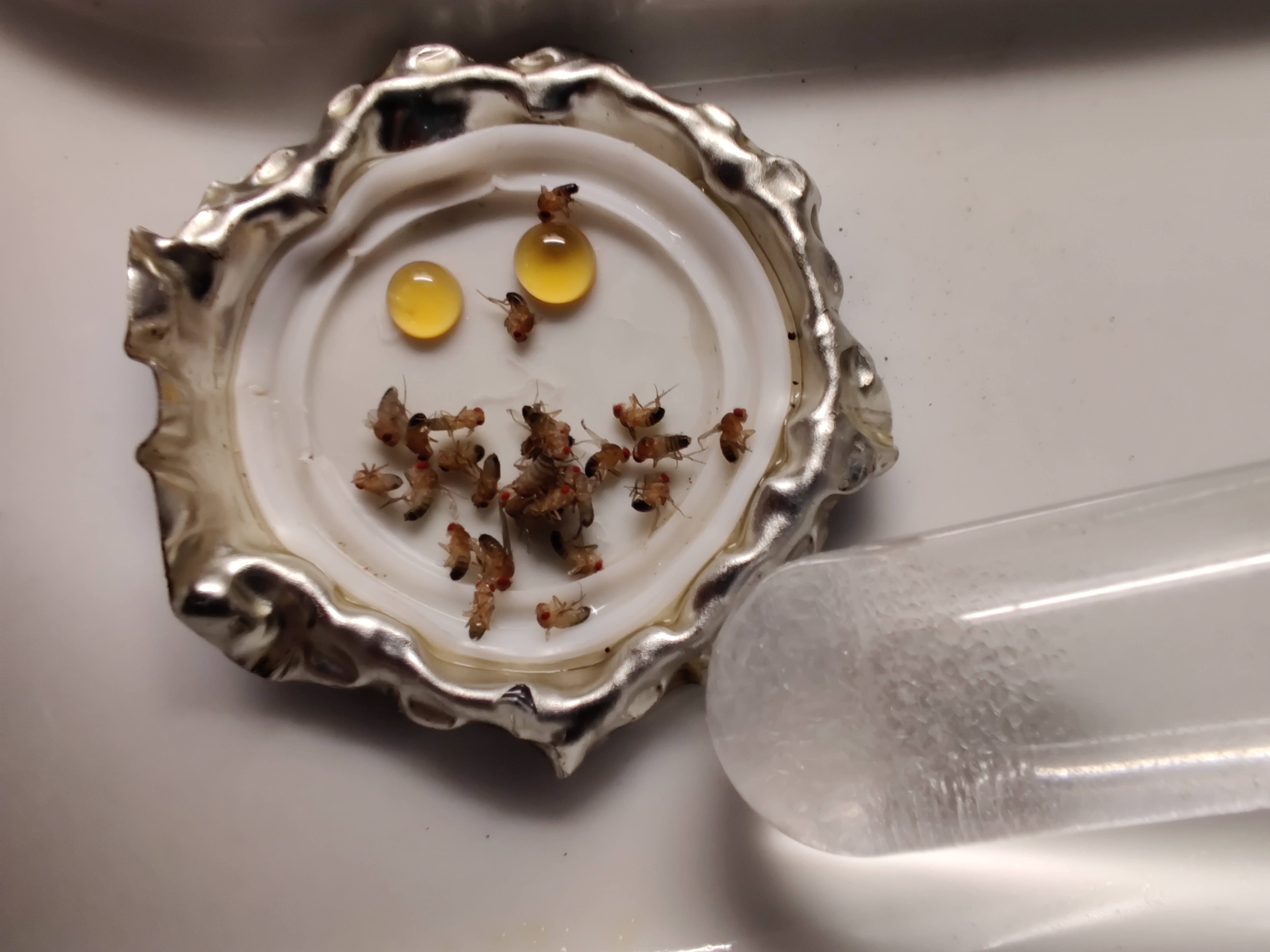 Nach einiger Zeit sah das ganze so aus: Den Ahornsirup haben sie nicht wirklich angerührt. Einige Drosophila haben sie ins Nest gebracht. Generell sind die