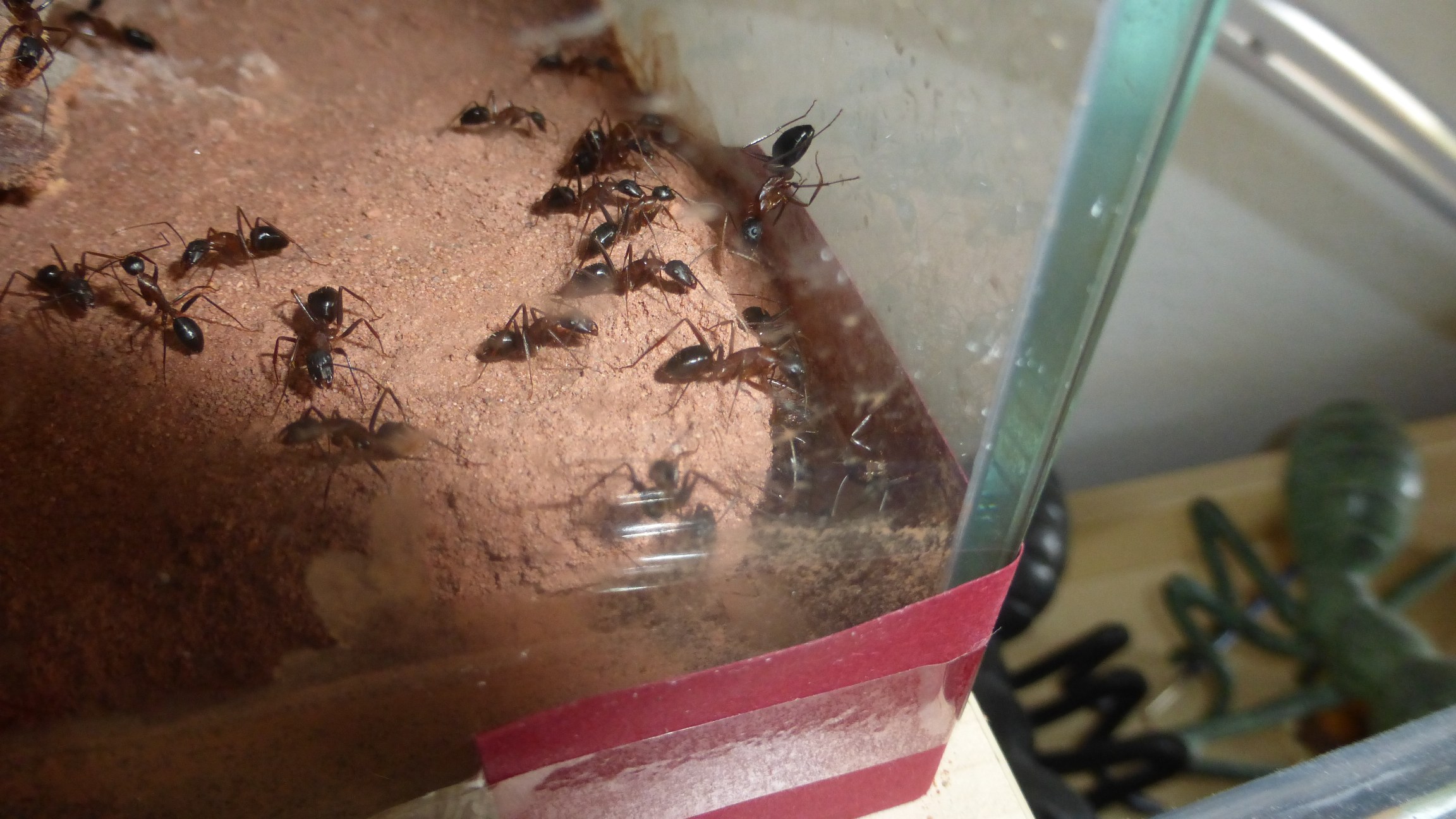 Thorax, dem hauptsächlich roten Kopf und den roten Mandiblen. Die ist auch definitiv keine Jungarbeiterin (die gehen normalerweise nicht aus dem Nest und allgemein schlüpfen die Arbeiterinnen bei mir sowieso immer fast vollständig ausgefärbt), sie rennt jetzt seit über einer Woche so in der Arena umher. Vermutlich eine etwas ungewöhnliche Farbvariante, mal sehen ob noch mehr von der Sorte auftauchen.