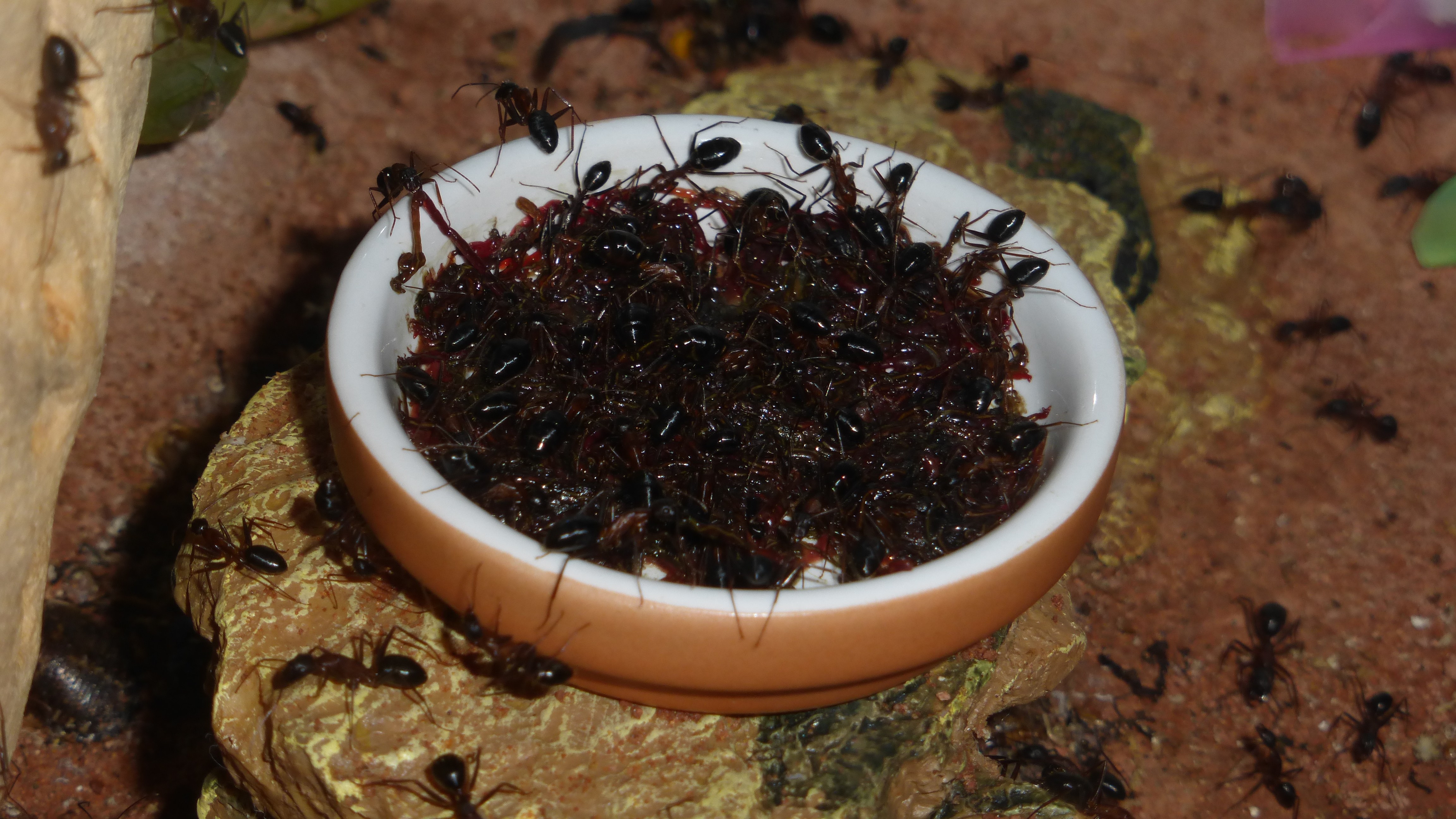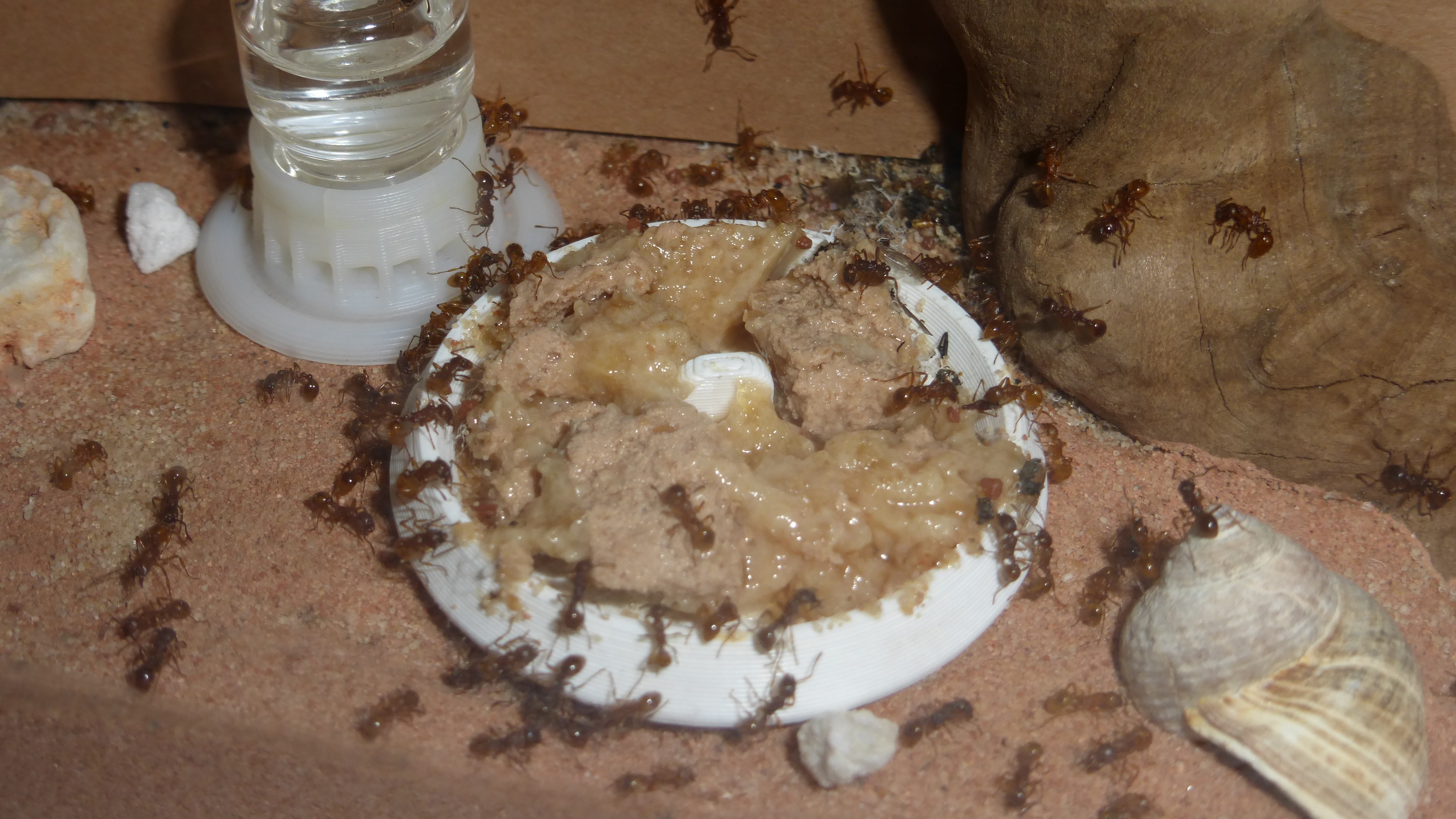 Beim Abtauen der Gefriertruhe sind die Blöcke mit gefrorenen Moskitolarven wieder aufgetaucht. Das letzte Mal waren die Ameisen nicht so begeistert davon, wahrscheinlich weil sich das ganze mit zunehmendem Austrocknen in zähen klebrigen Schleim verwandelt hat. Diese Mal hab ich die Mückenlarven mit einem Teesieb von der Algenmasse getrennt und dann in ein kleines Schälchen deponiert. Das ganze ist ne ziemliche Sauerei, aber das Ergebnis spricht für sich.
