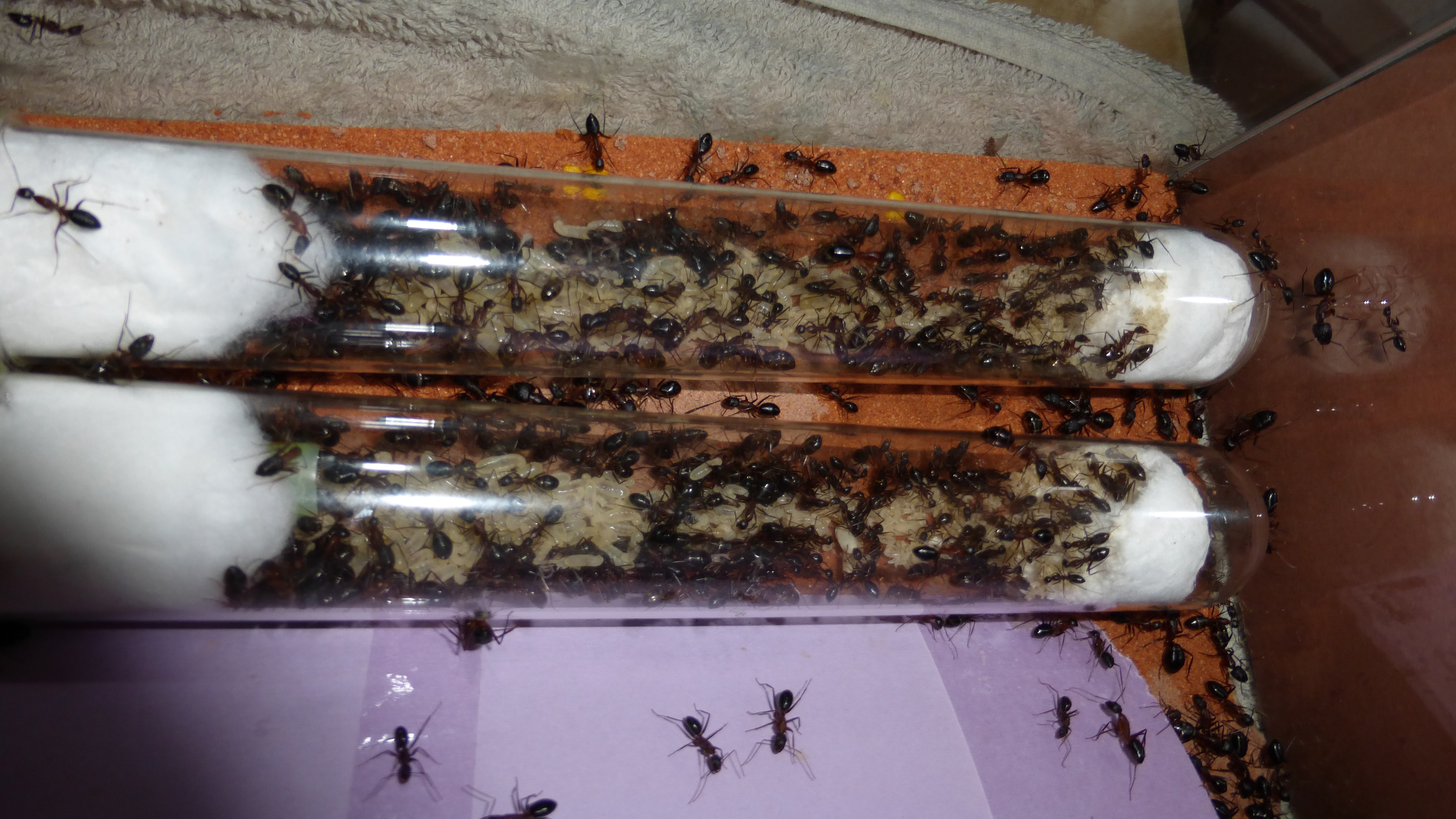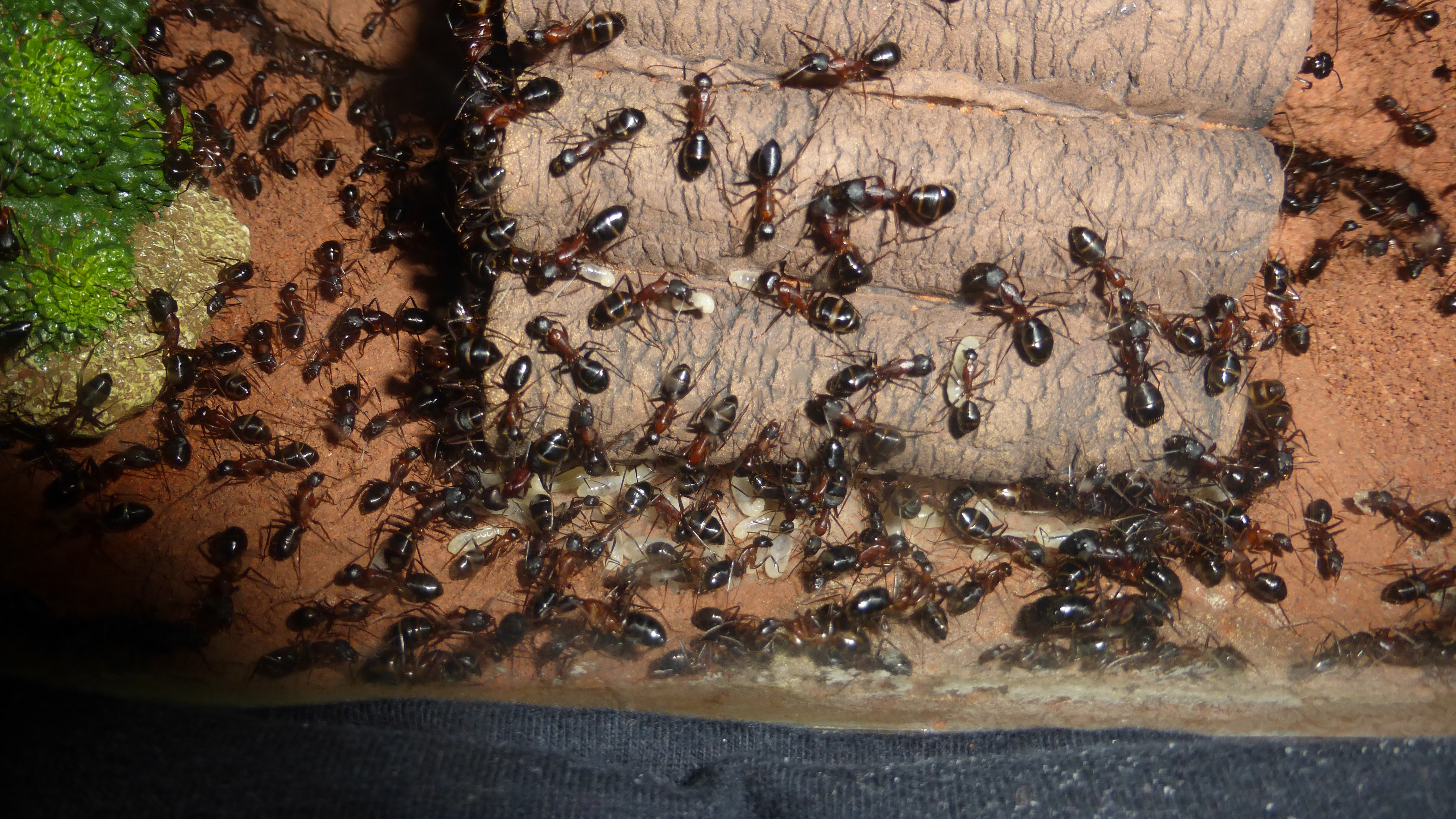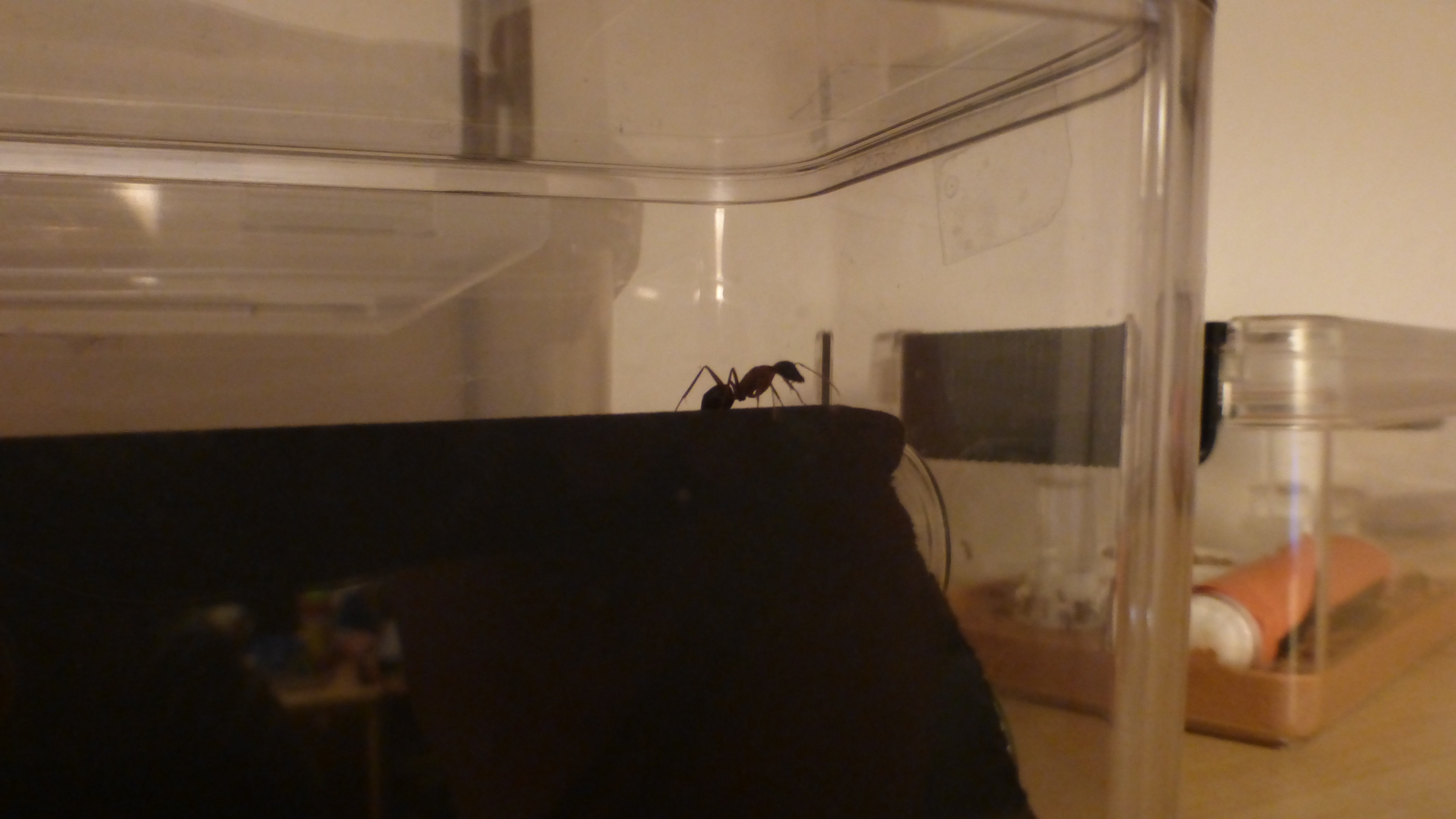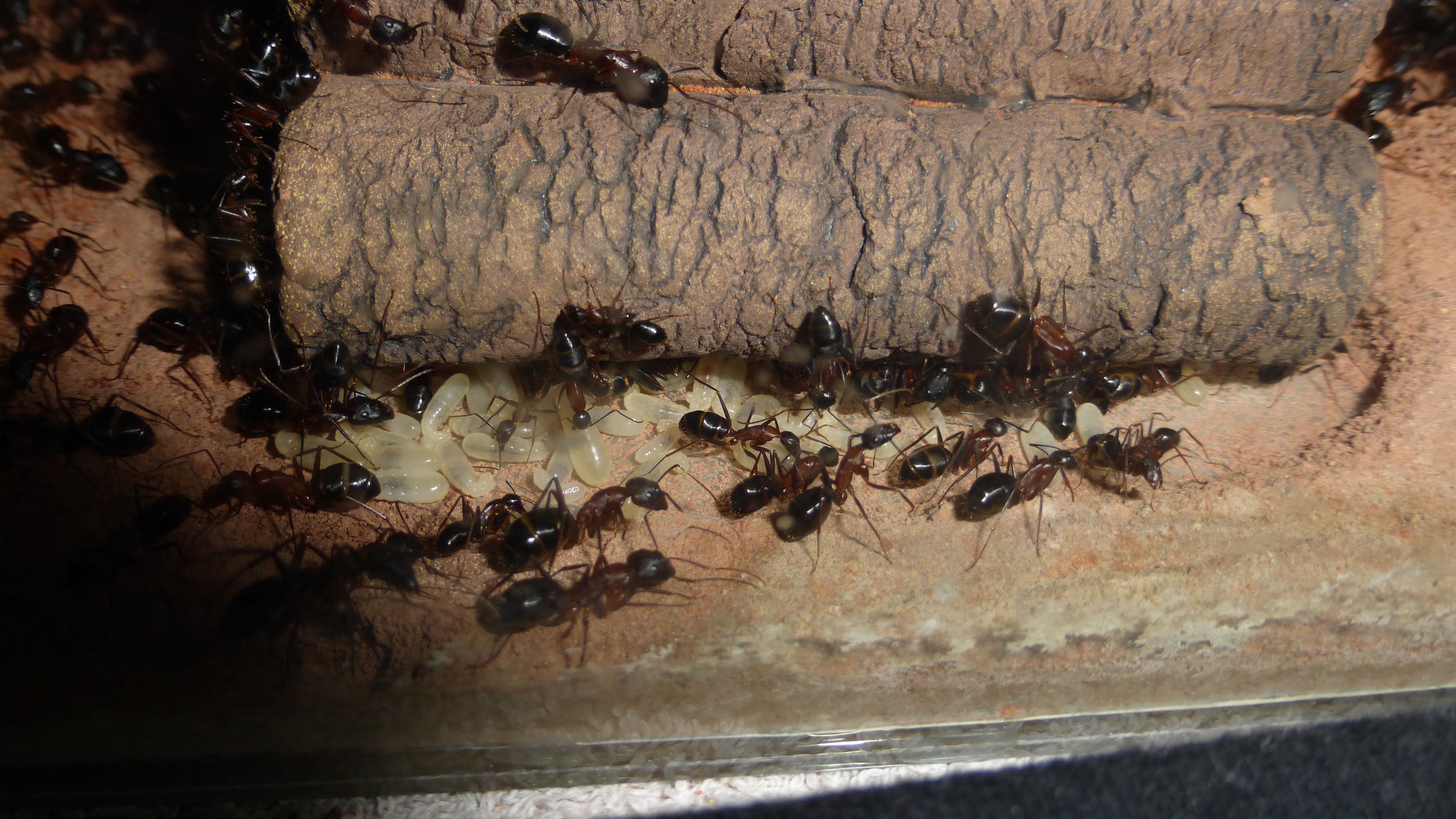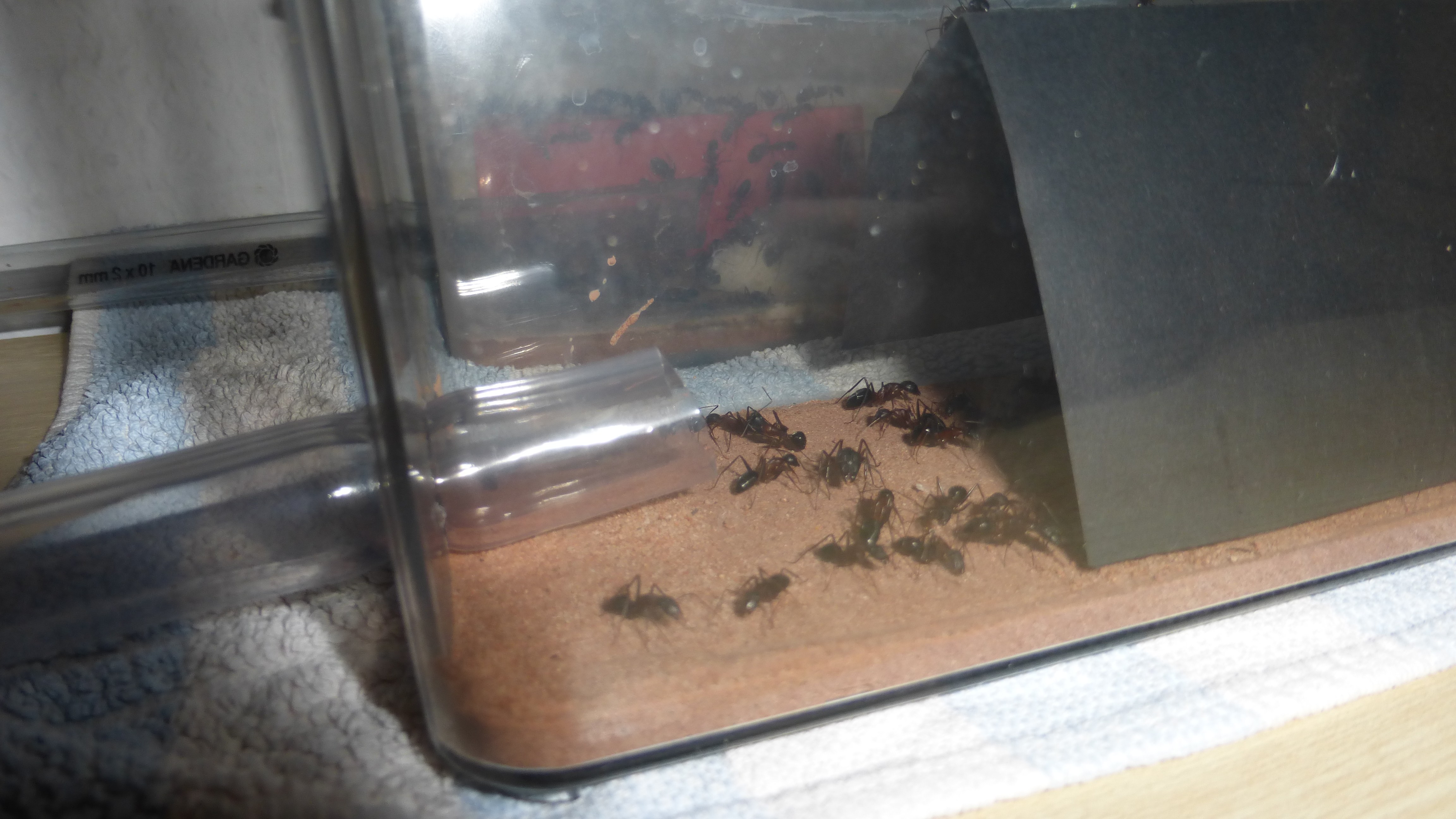 Die andere Box hat ein paar frische RGs bekommen. Es halten sich recht viele Ameisen drin auf, die man aber nicht sehen kann weil sie alle an der Zimmerwandseite sitzen.