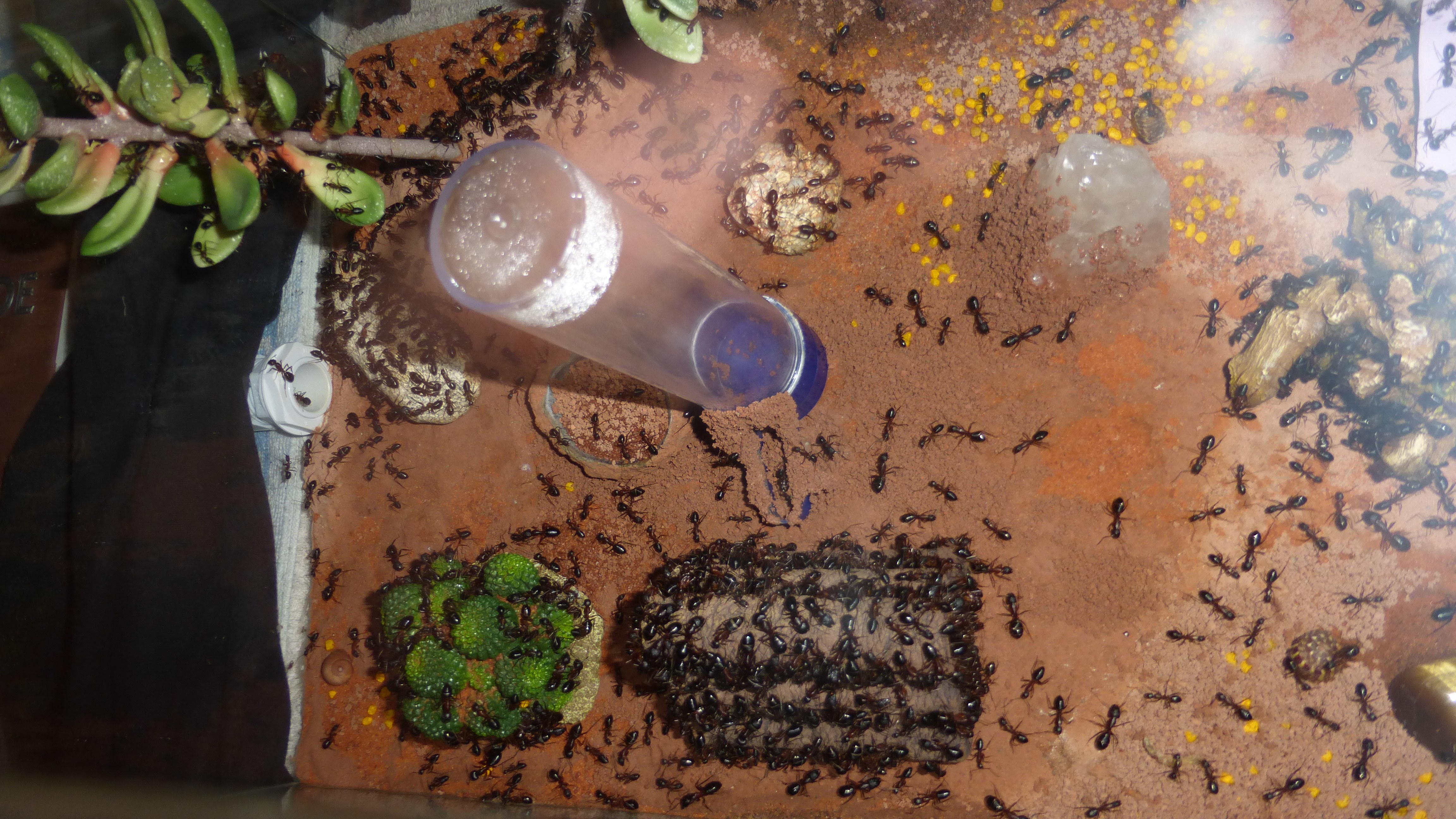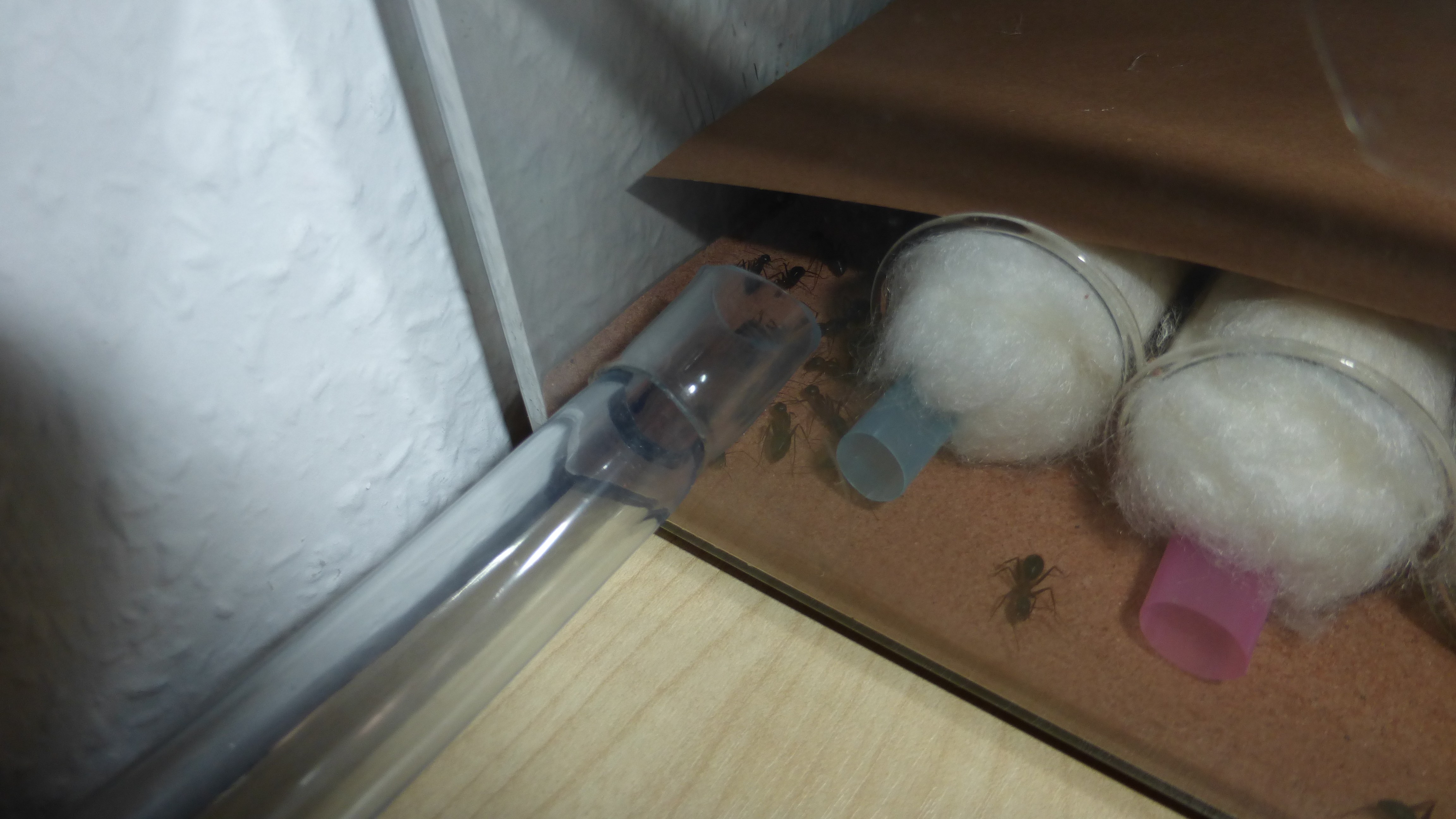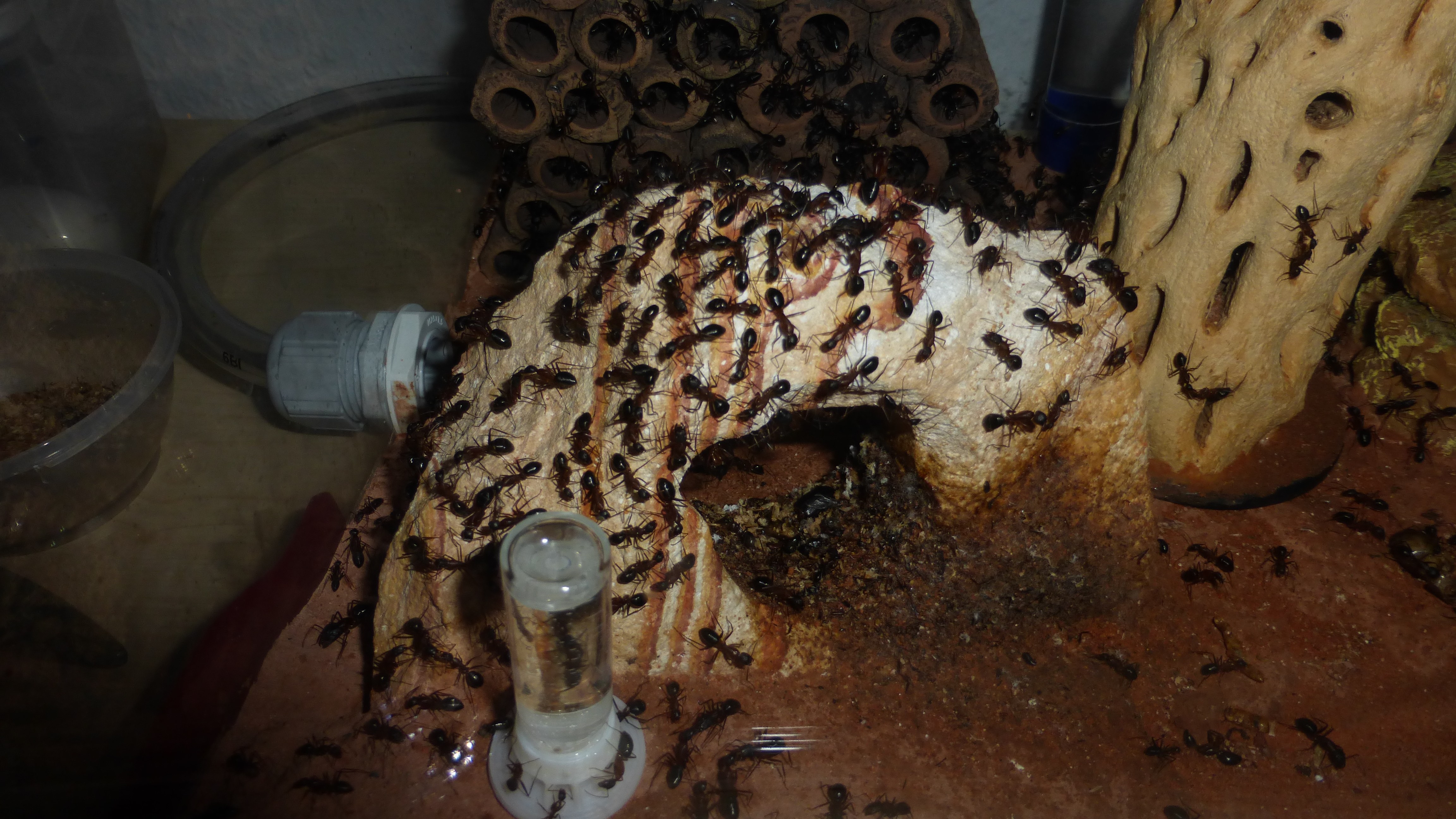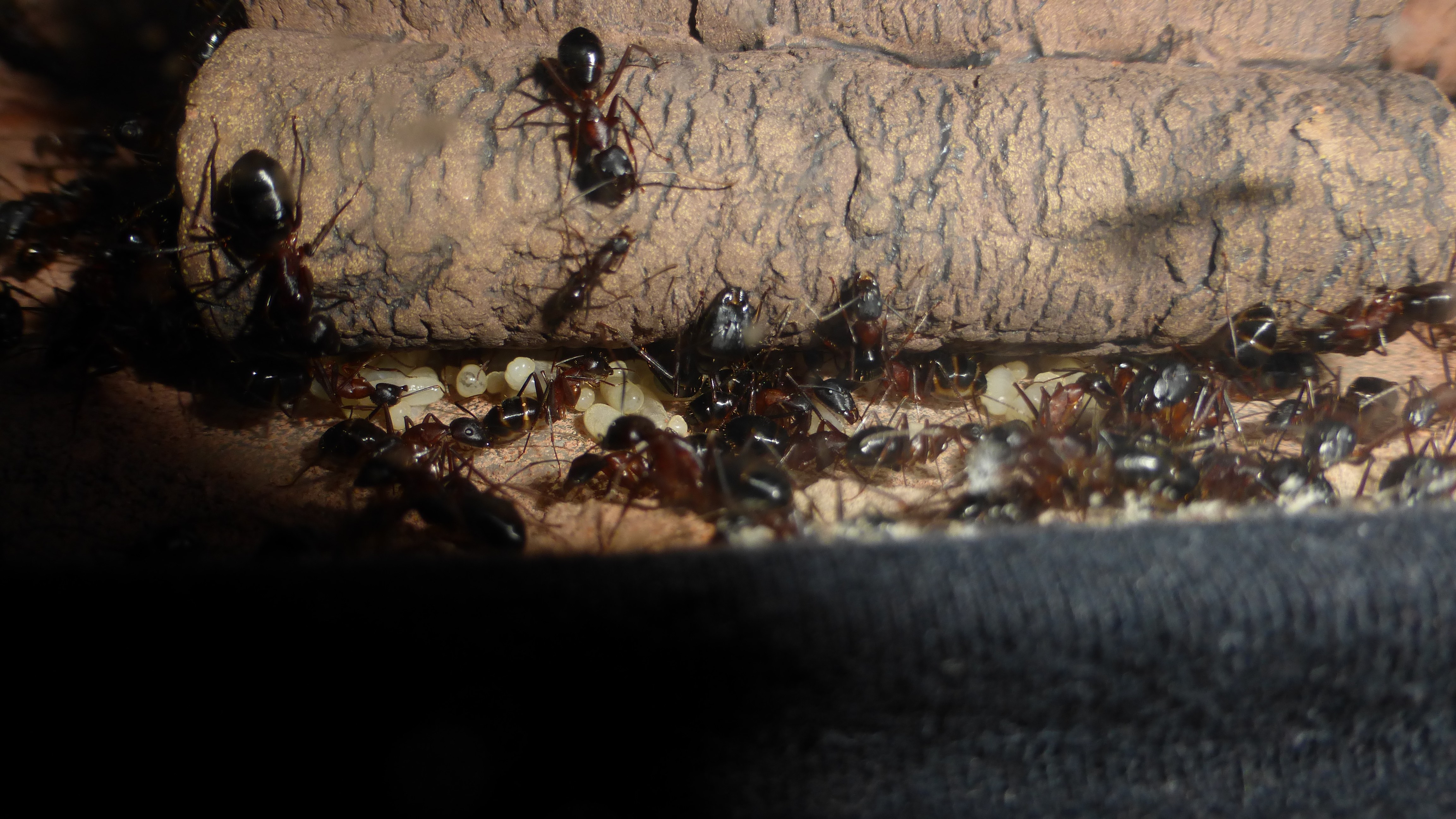 Die andere Box hat ein paar frische RGs bekommen. Es halten sich recht viele Ameisen drin auf, die man aber nicht sehen kann weil sie alle an der Zimmerwandseite sitzen.