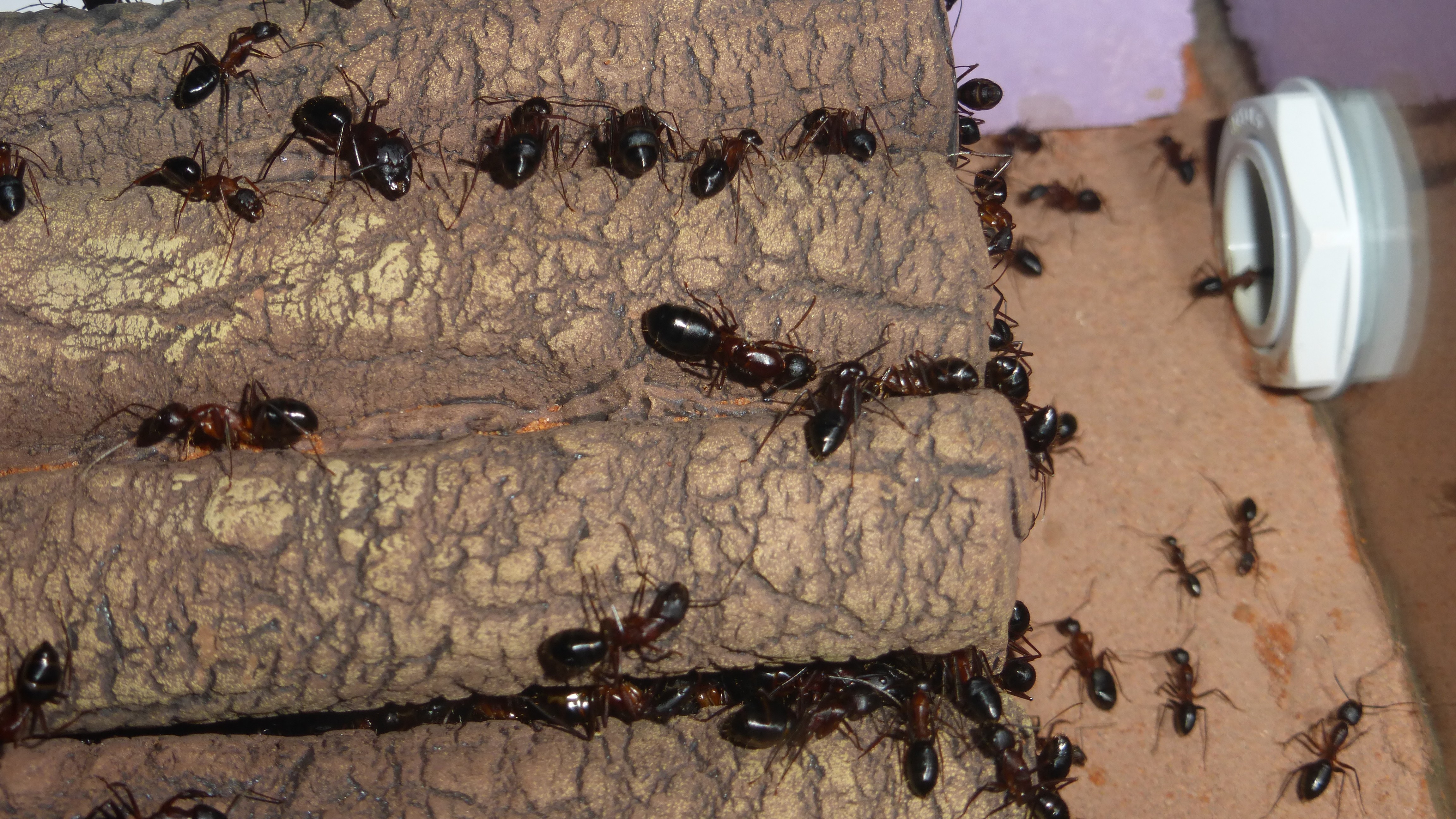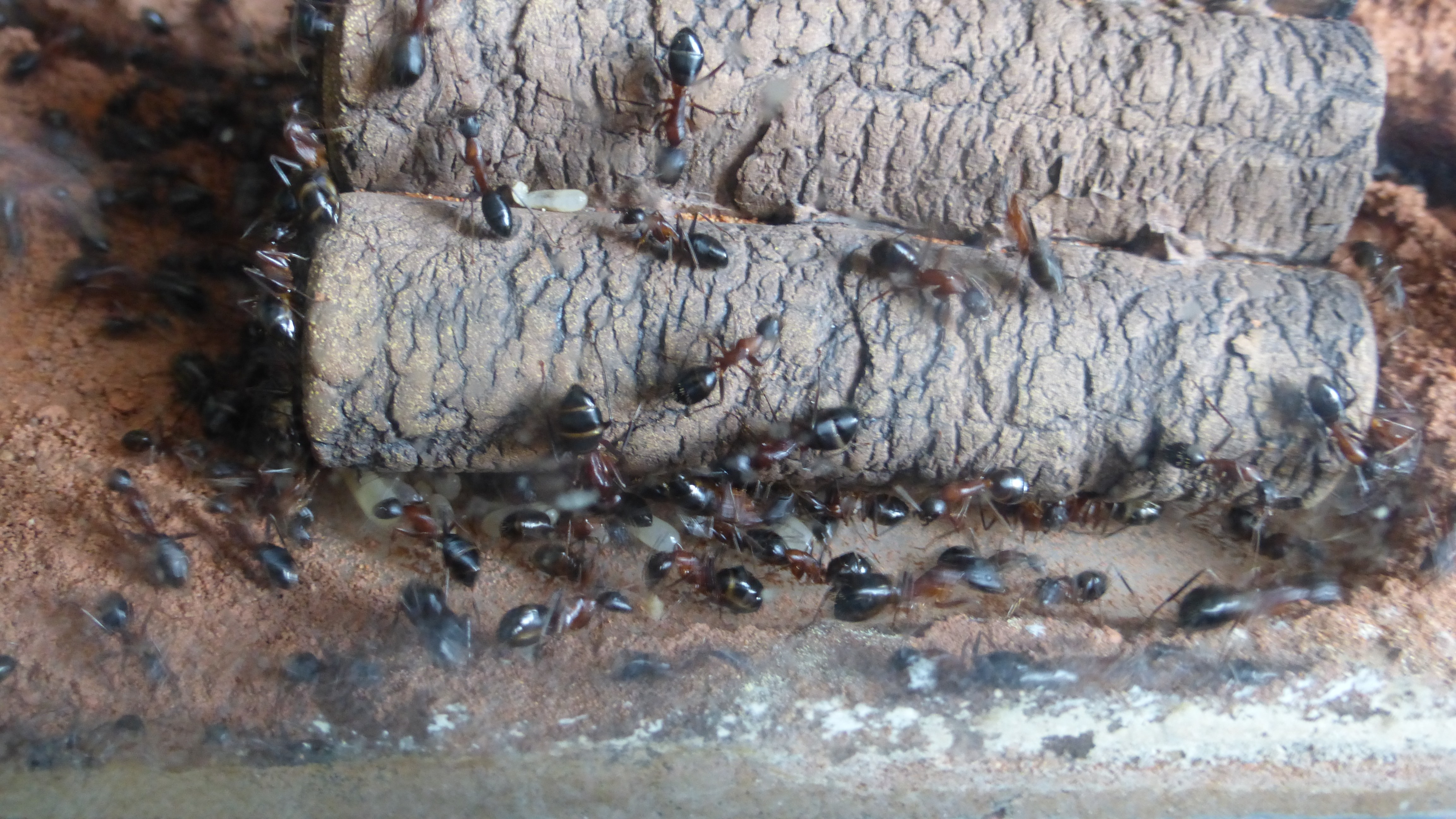 Hab ein paar Rindenstücke in die ersten Box gelegt, tagsüber halten sich darunter mittlerweile so 30-40 Ameisen auf.