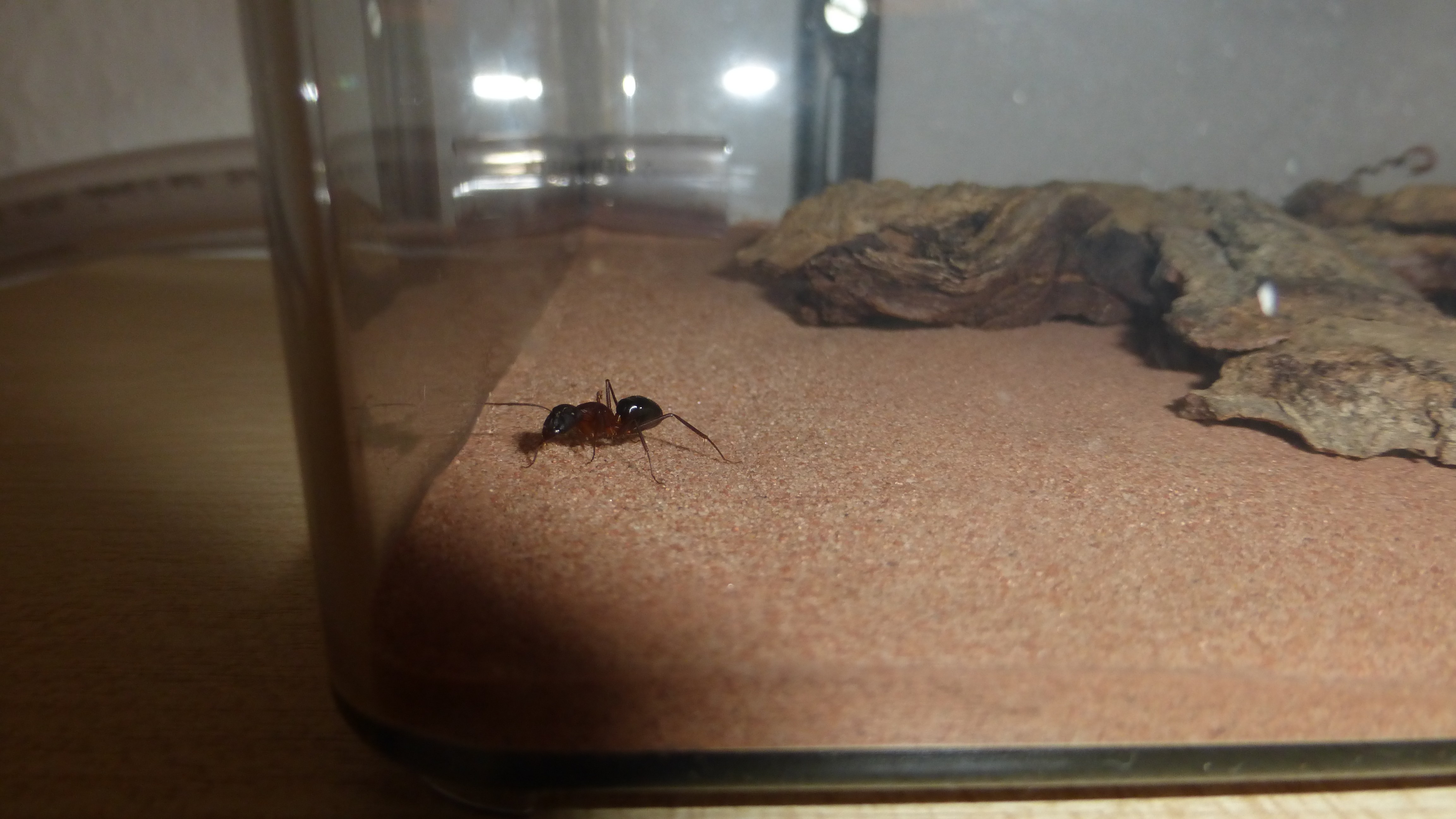 Eine der Arbeiterinnen fand sich außerhalb der Anlage wieder, vermutlich beim saubermachen mit dem Abfall rausgenommen oder unbemerkt auf die Hand gekrabbelt, und hat versucht zurück zur Kolonie zu kommen.