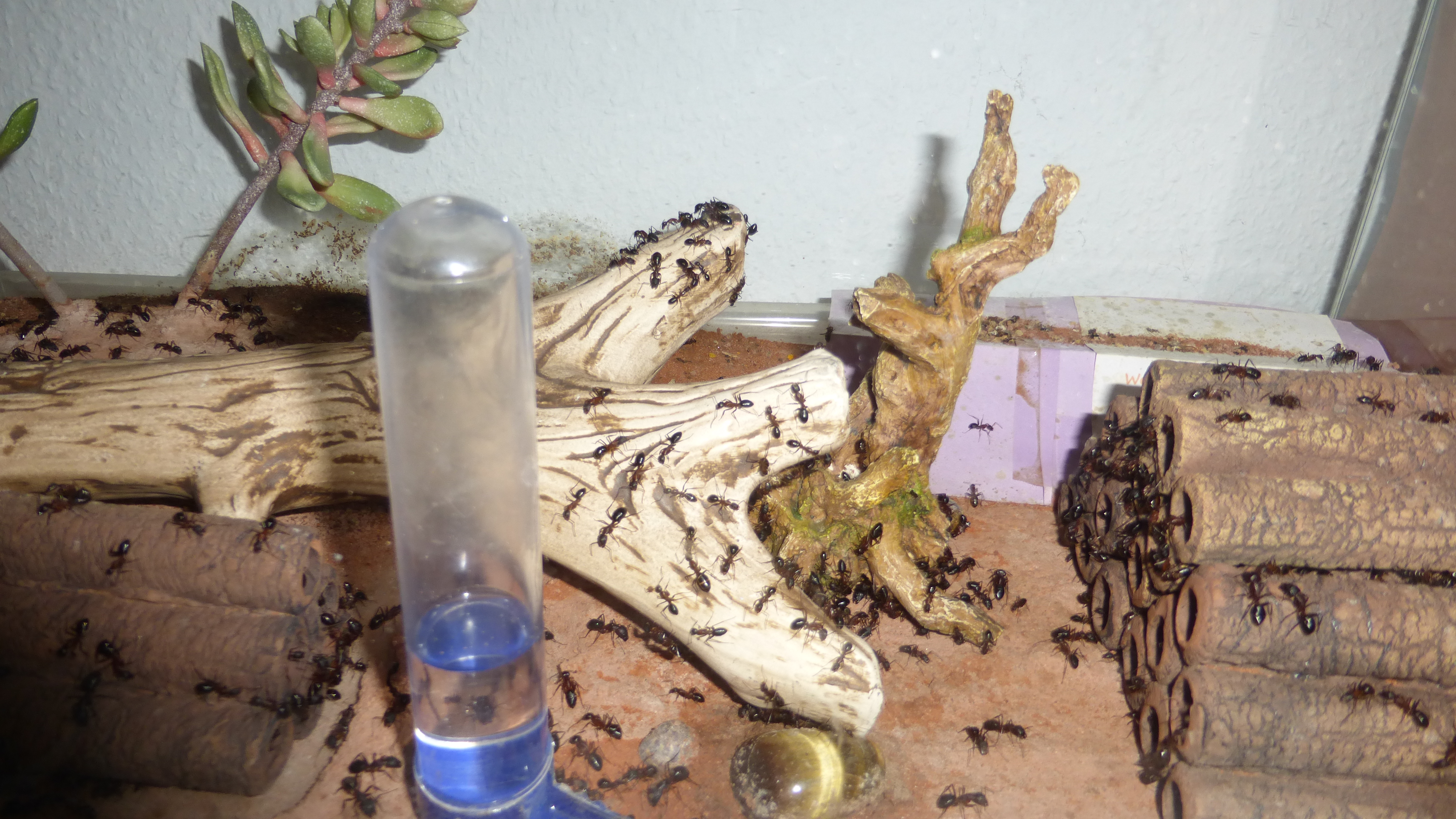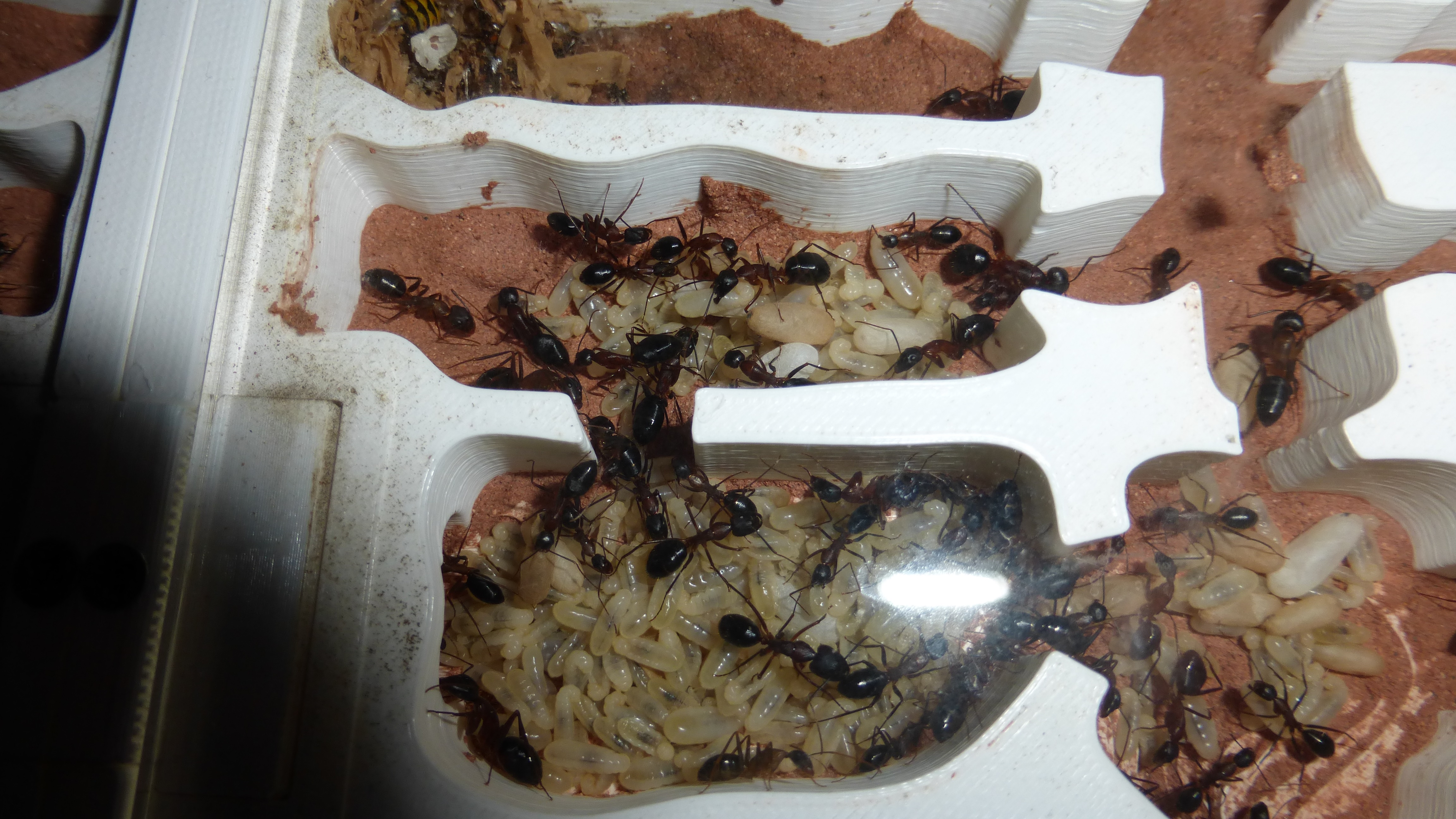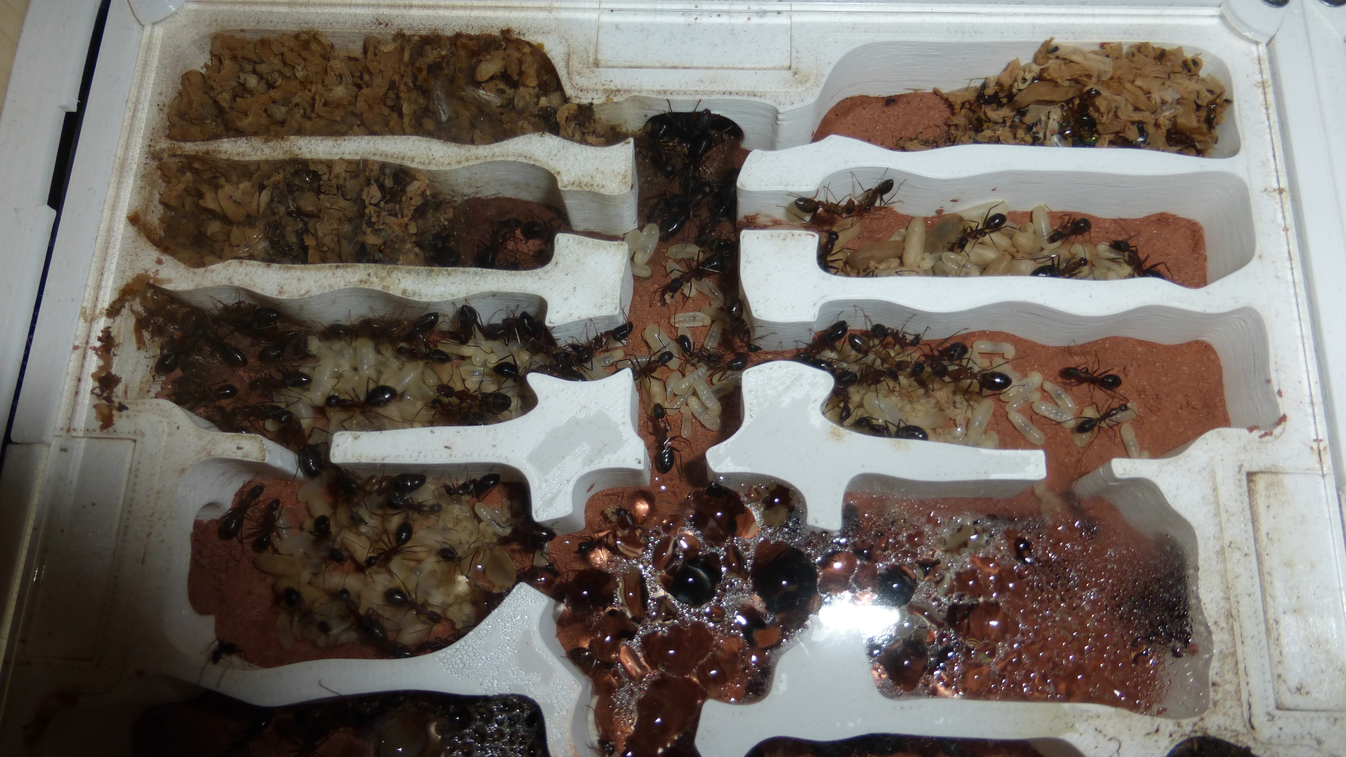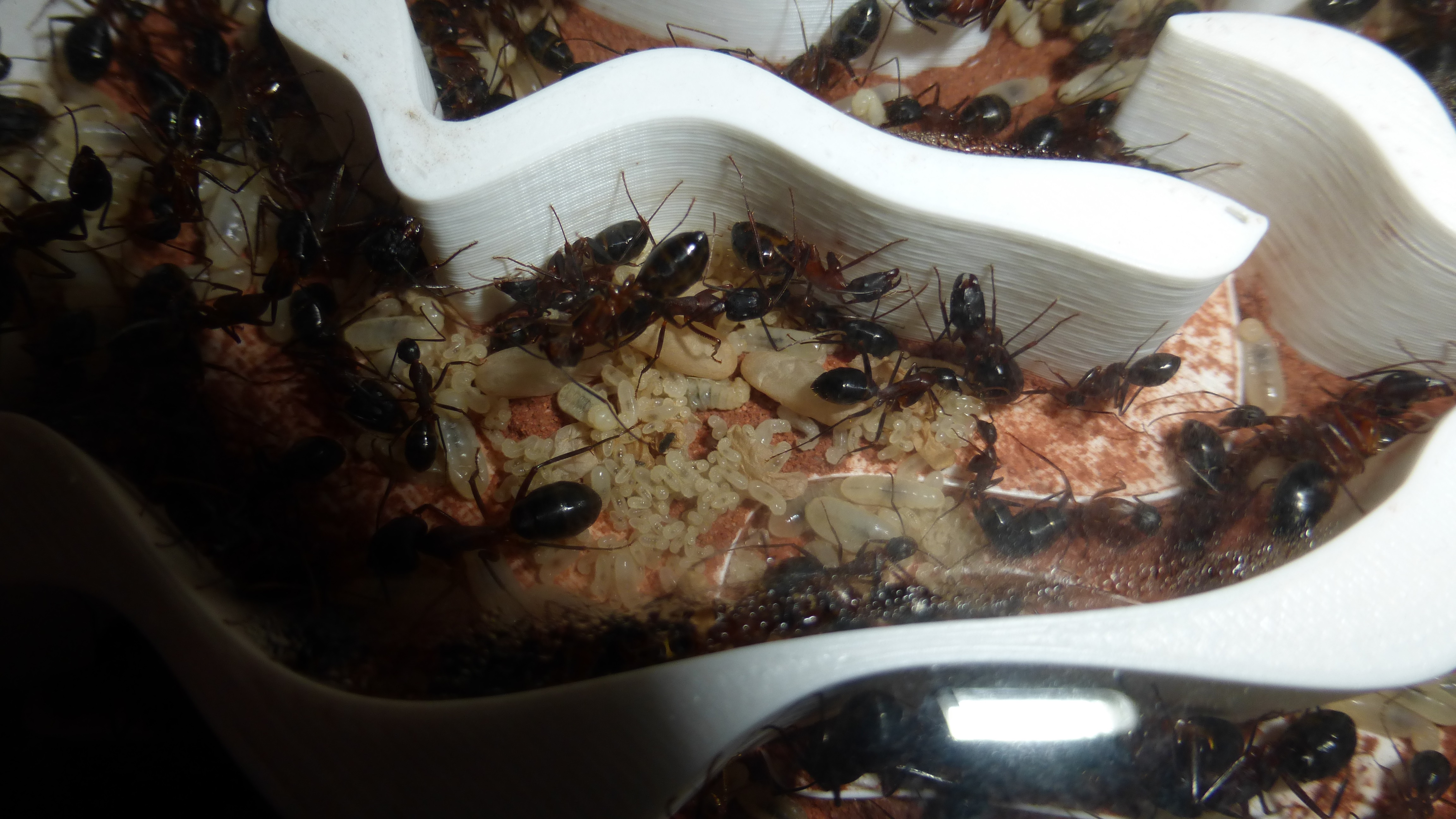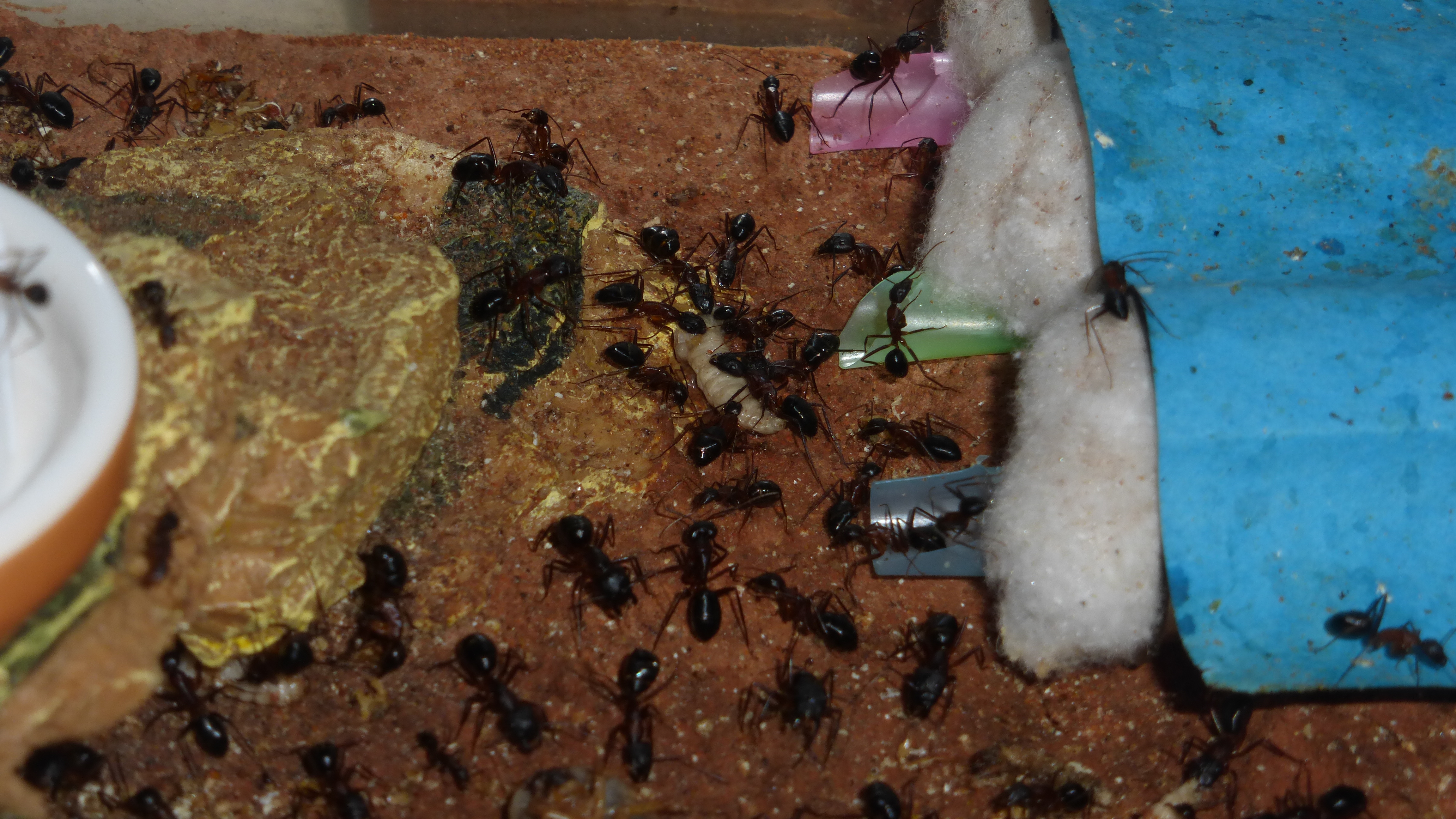 Den Ameisen hat das garnicht gefallen und nach einer Weile fingen sie an die Wattestöpsel ziemlich intensiv zu barbeiten (zum Glück hatte ich genug Stöpsel für die Simants-Nester übrig, so waren zumindest die kein Problem), was der ganzen Operation einen gewissen Zeitdruck verlieh. Nachdem ich schon ein paar Tage vorher die Abdeckung entfernt hatte befanden sich nicht mehr sehr viele Ameisen im Becken, das half.