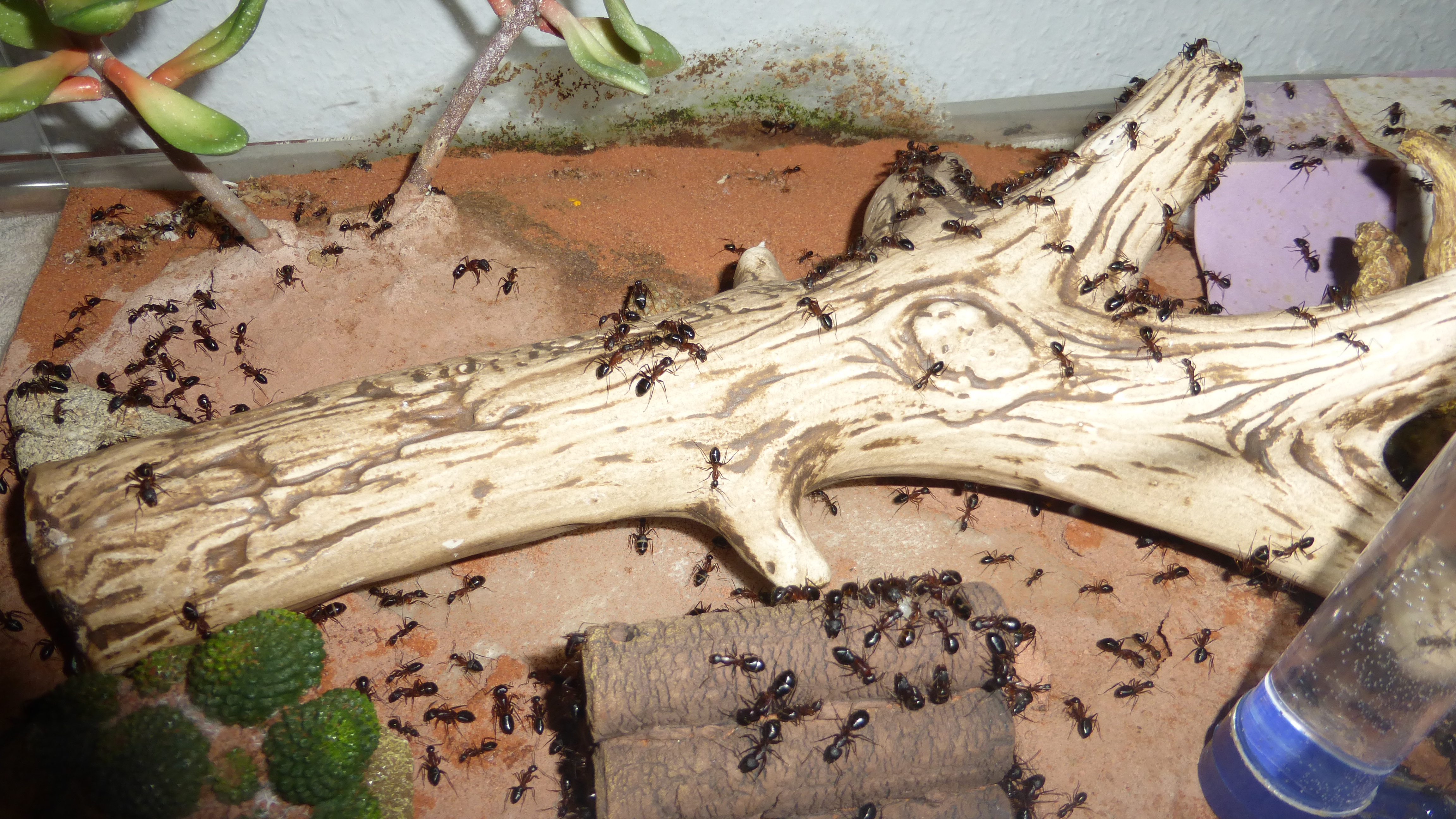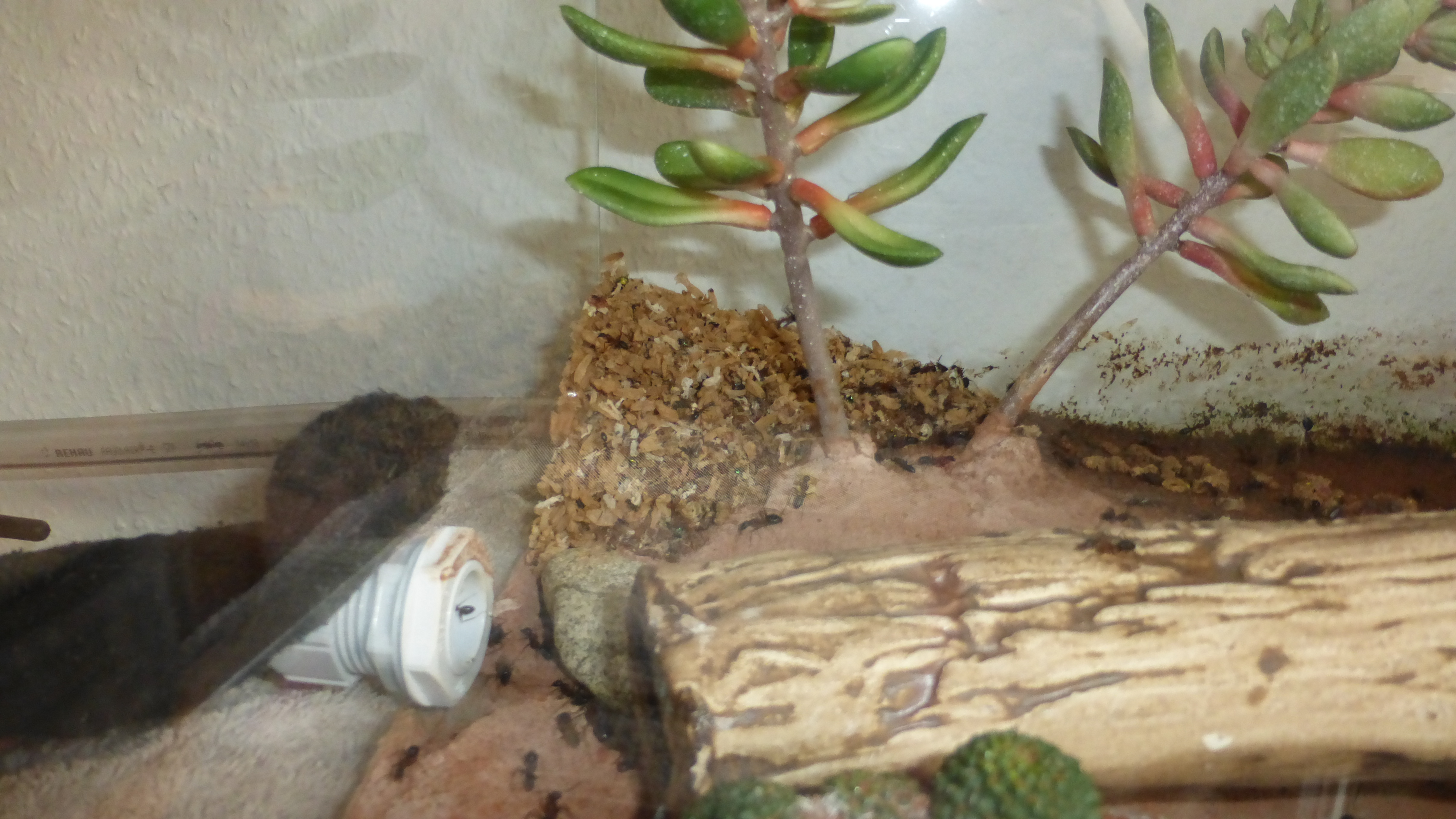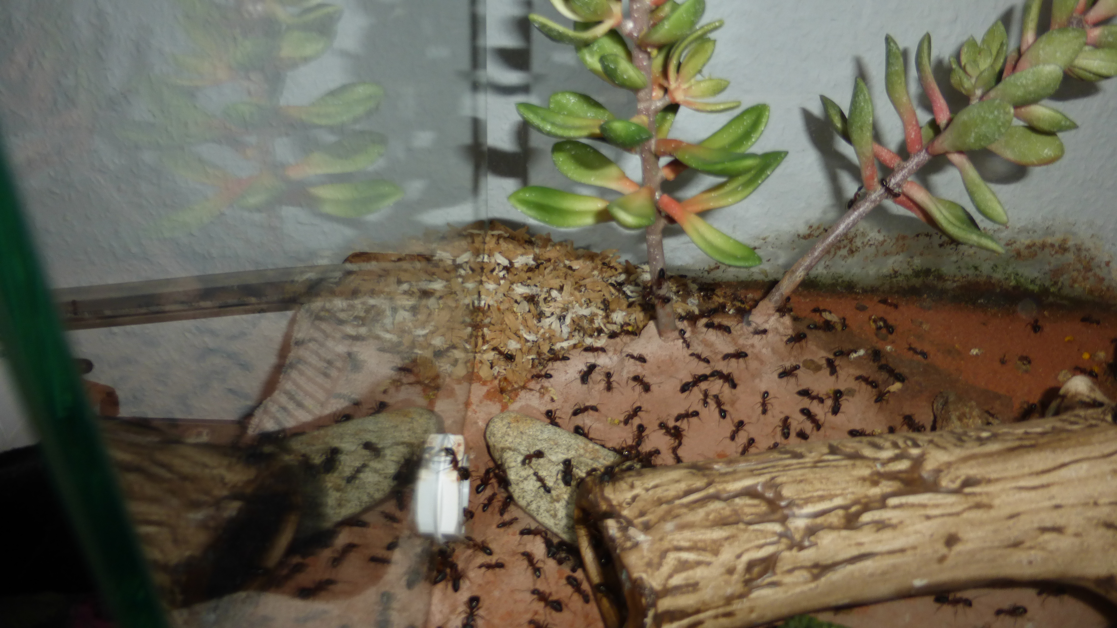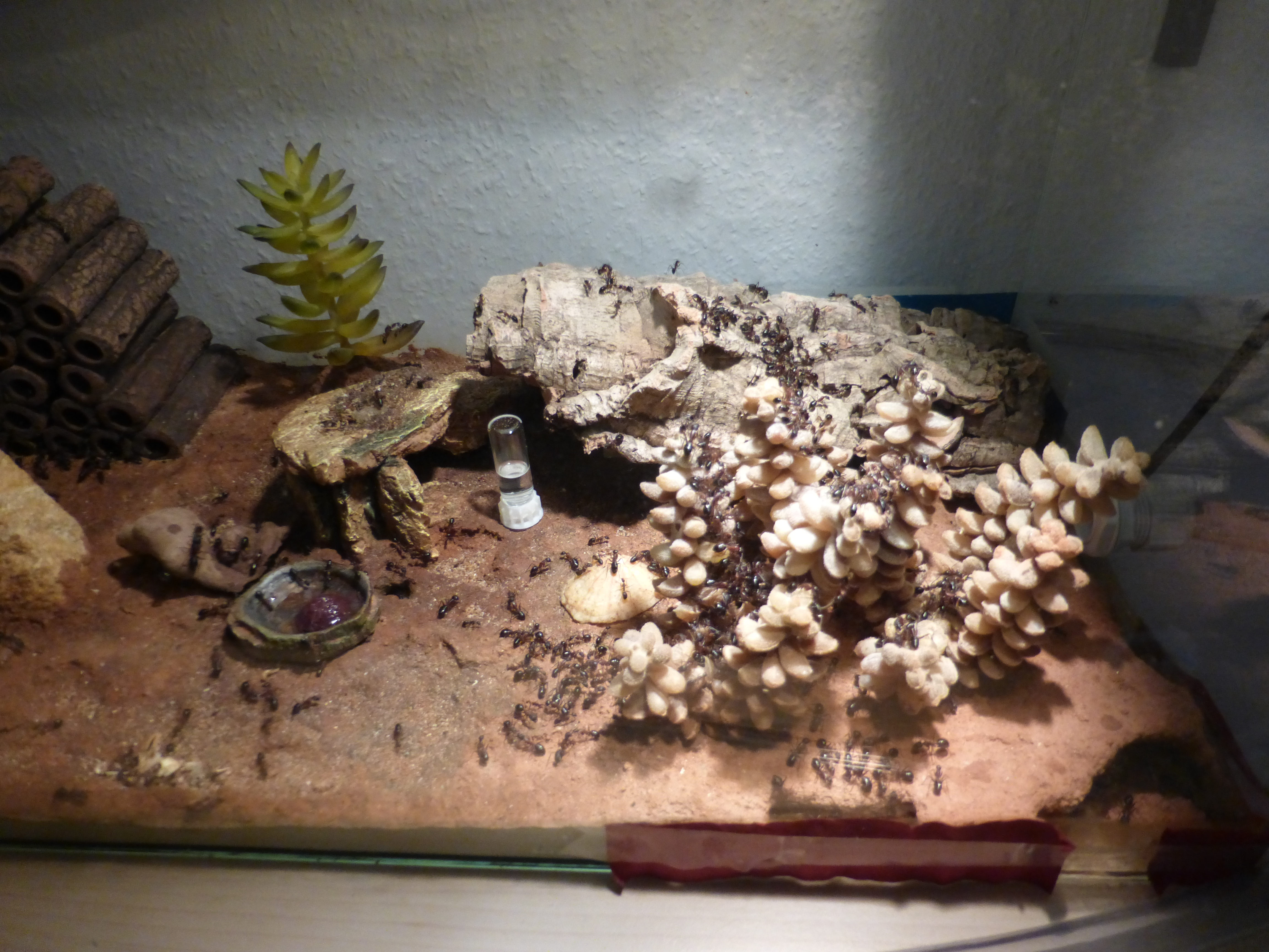 Hier ist ein interessanter Vergleich - Bild 1 zeigt die Ameisen im Becken bei Raumtemperatur, Bild 2 mit aktiver Wärmelampe (die hängt über der unteren rechten Ecke, ich schalte die so zweimal in der Woche für ne halbe Stunde an, um ein Minimum an winterlichem Sonnenschein zu simulieren.