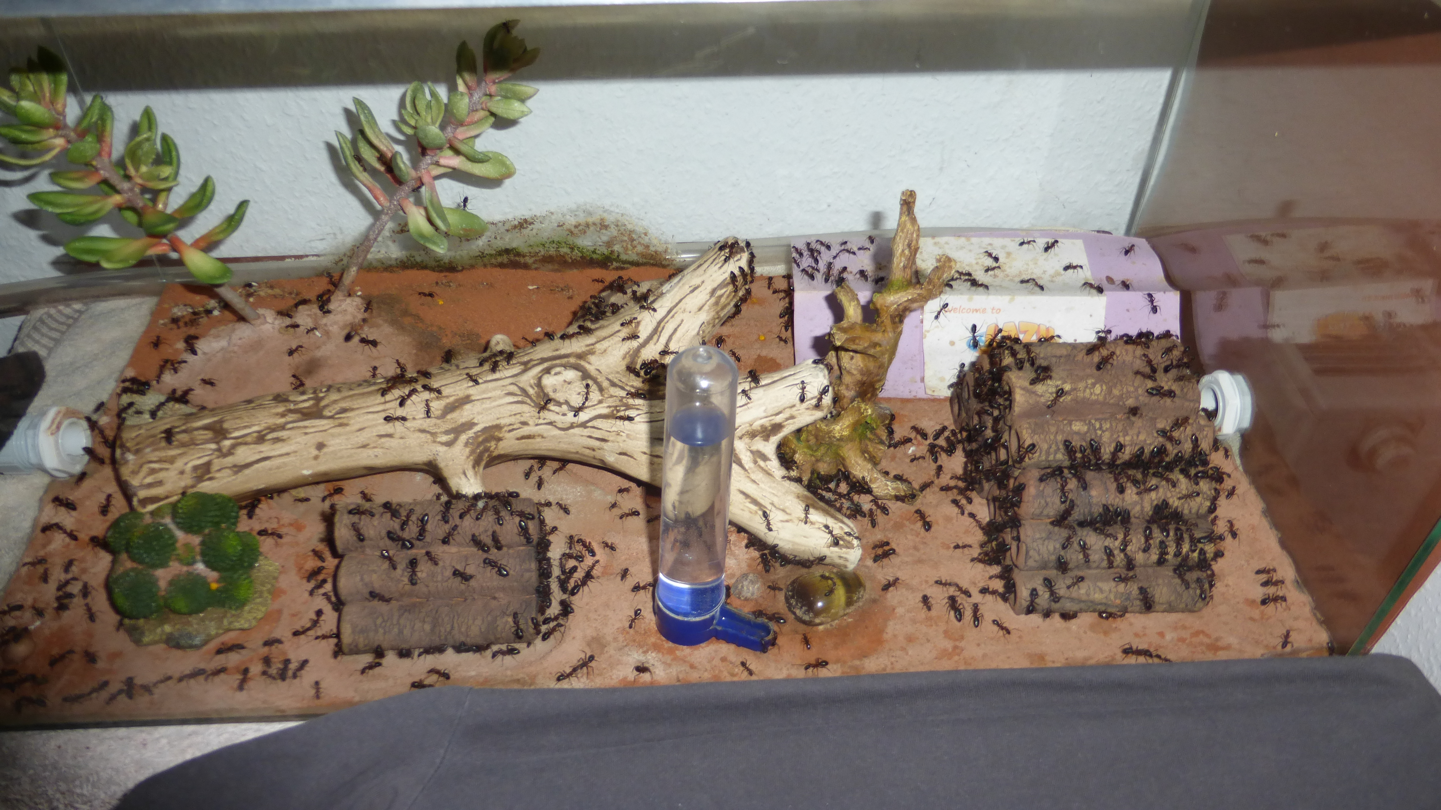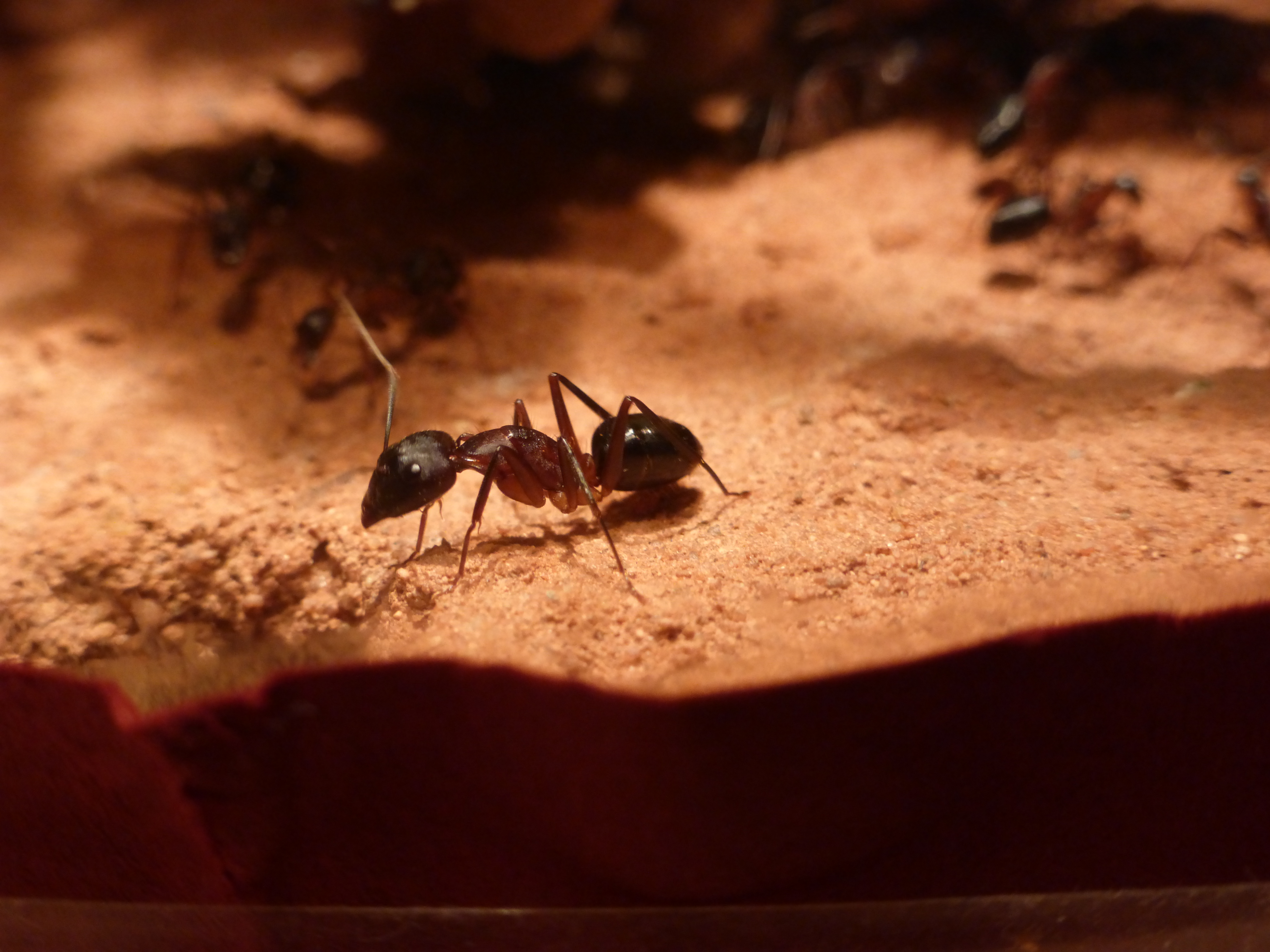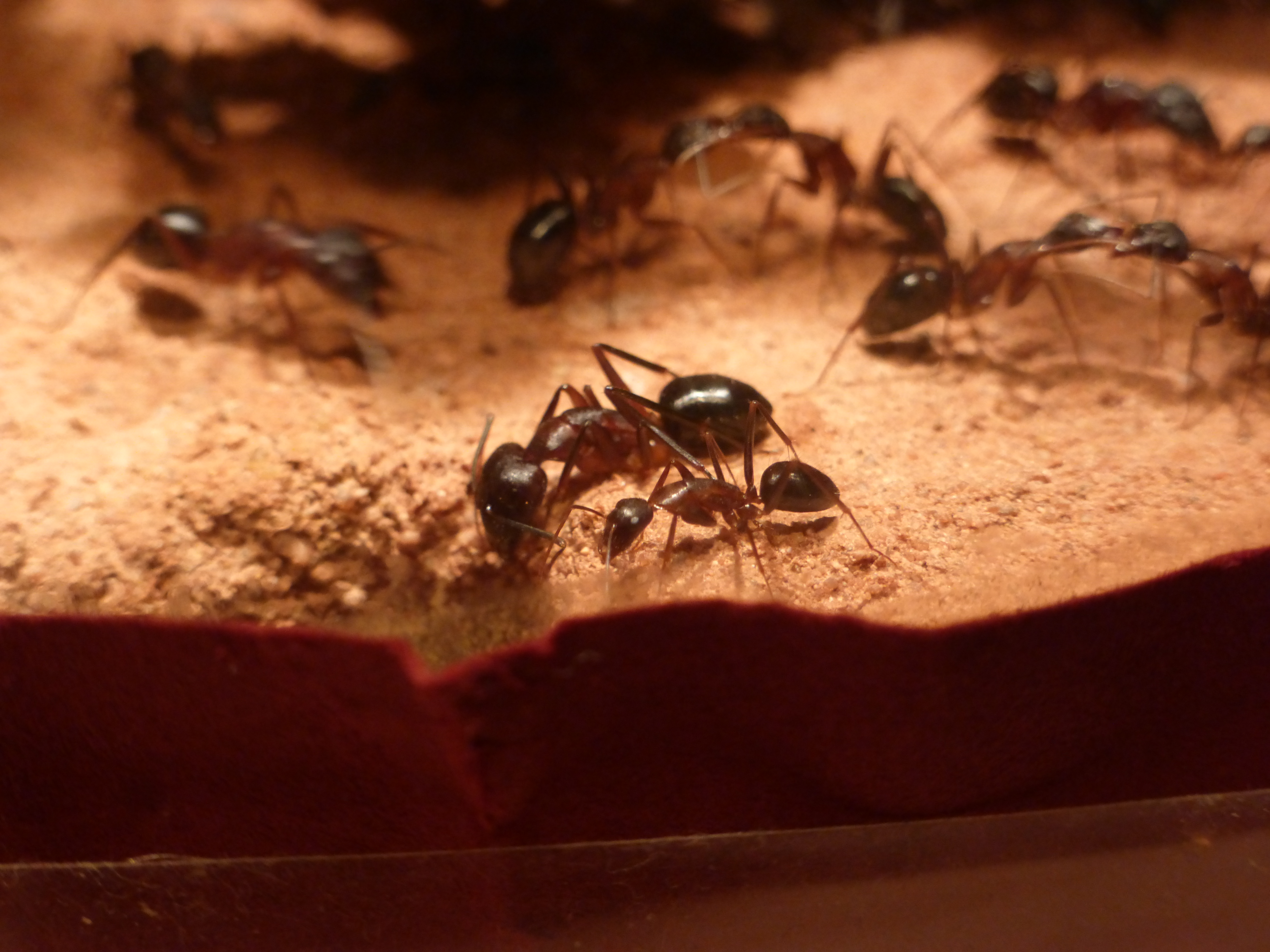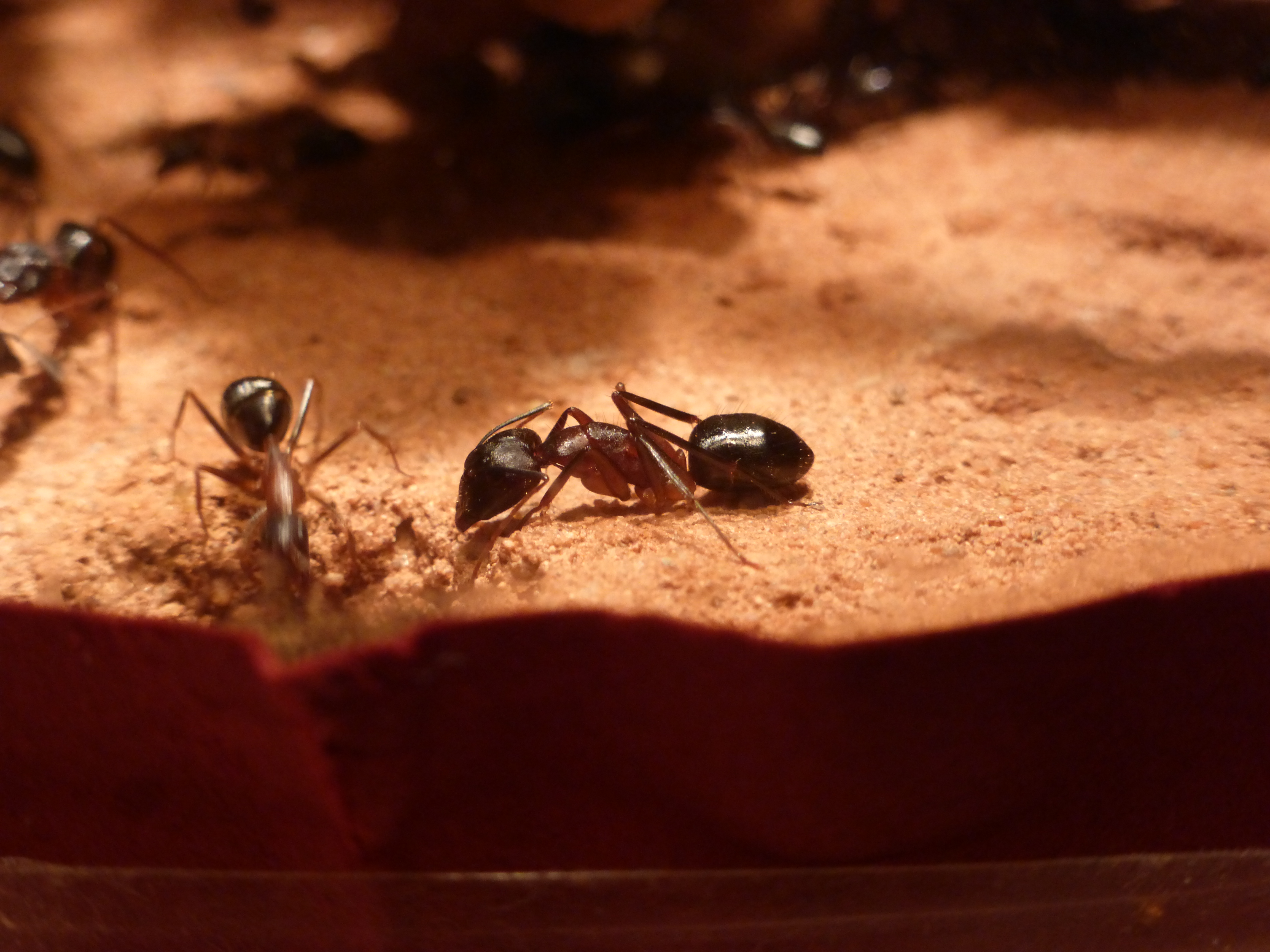 Hier ist ein interessanter Vergleich - Bild 1 zeigt die Ameisen im Becken bei Raumtemperatur, Bild 2 mit aktiver Wärmelampe (die hängt über der unteren rechten Ecke, ich schalte die so zweimal in der Woche für ne halbe Stunde an, um ein Minimum an winterlichem Sonnenschein zu simulieren.