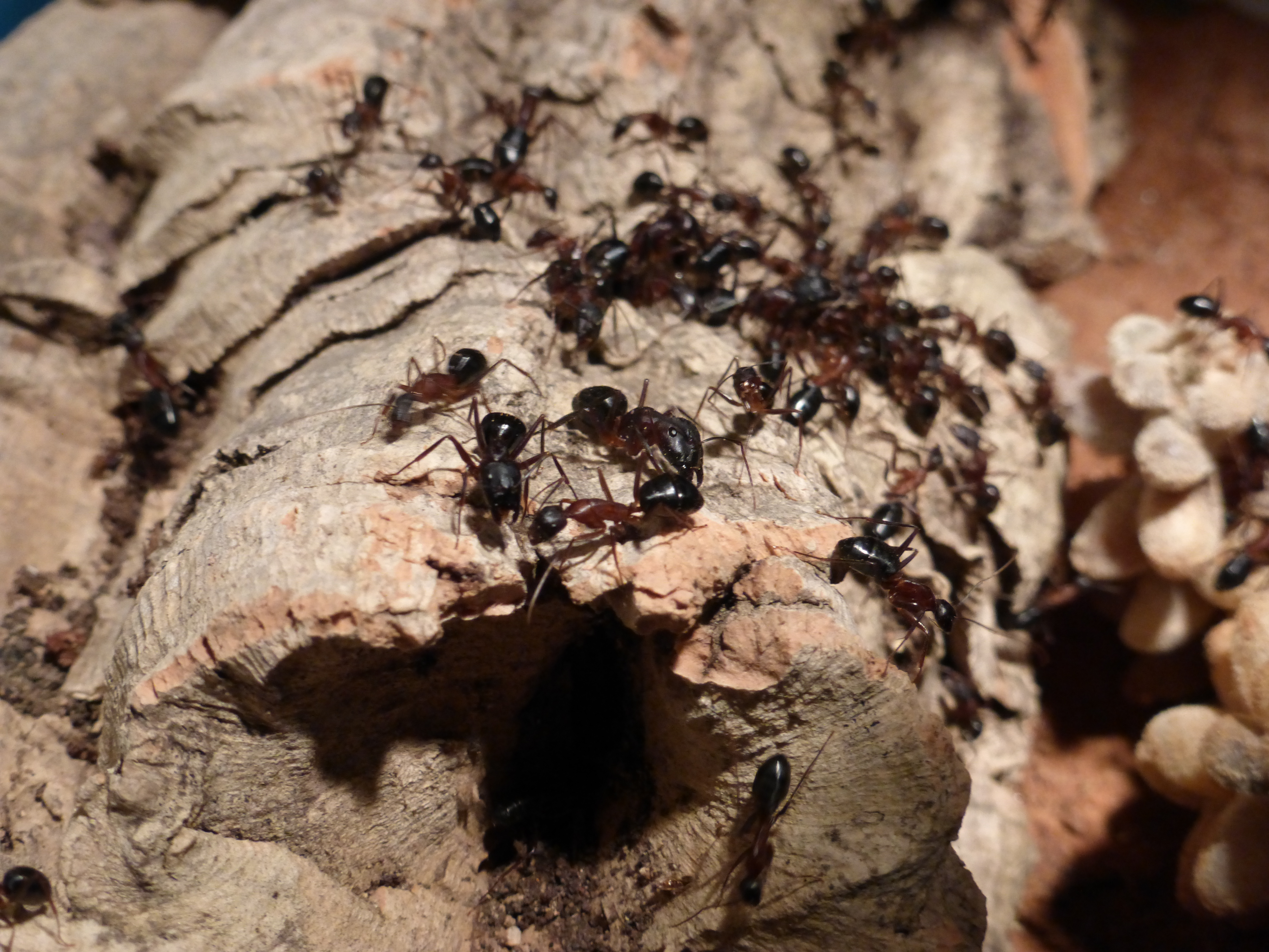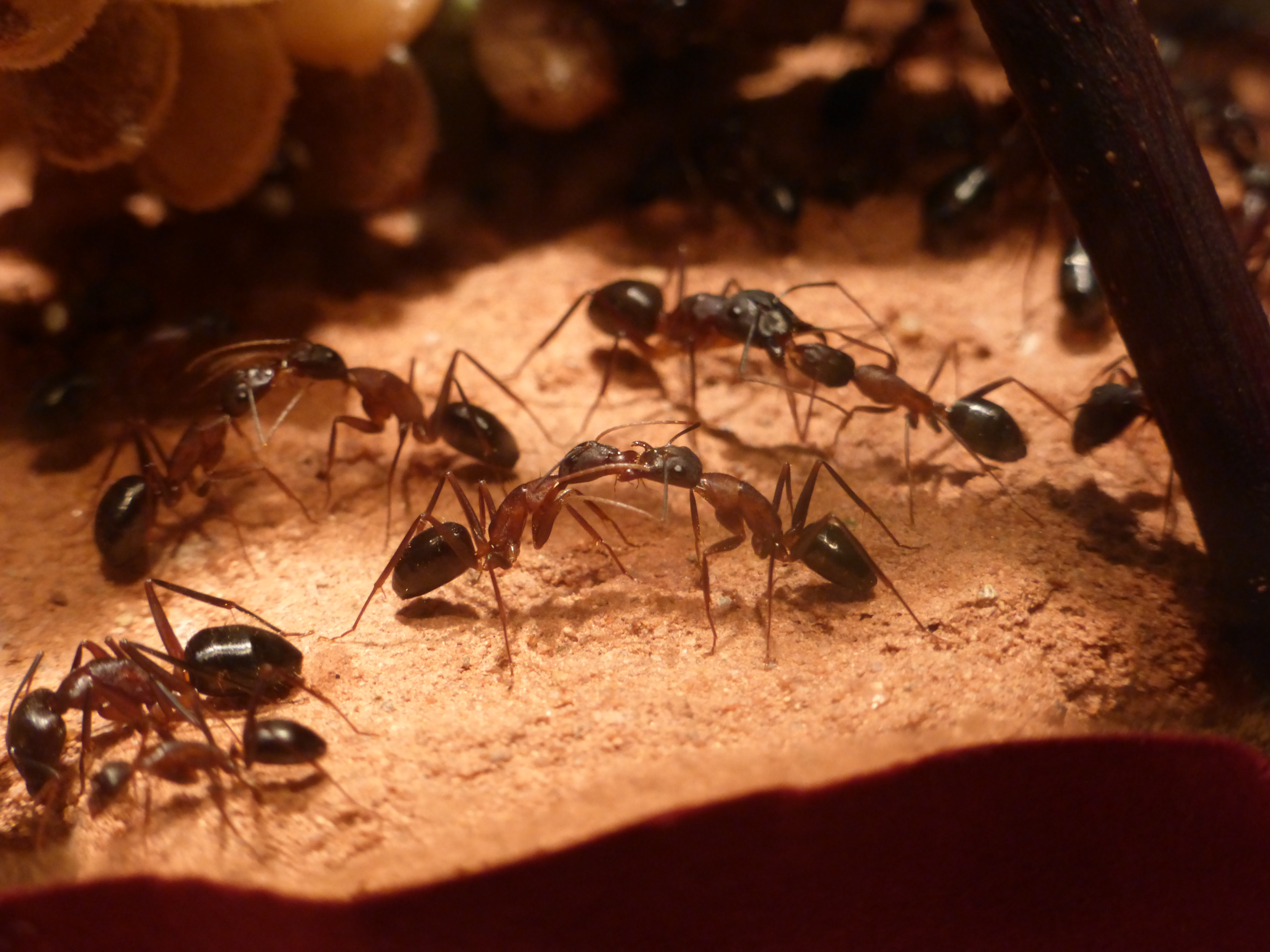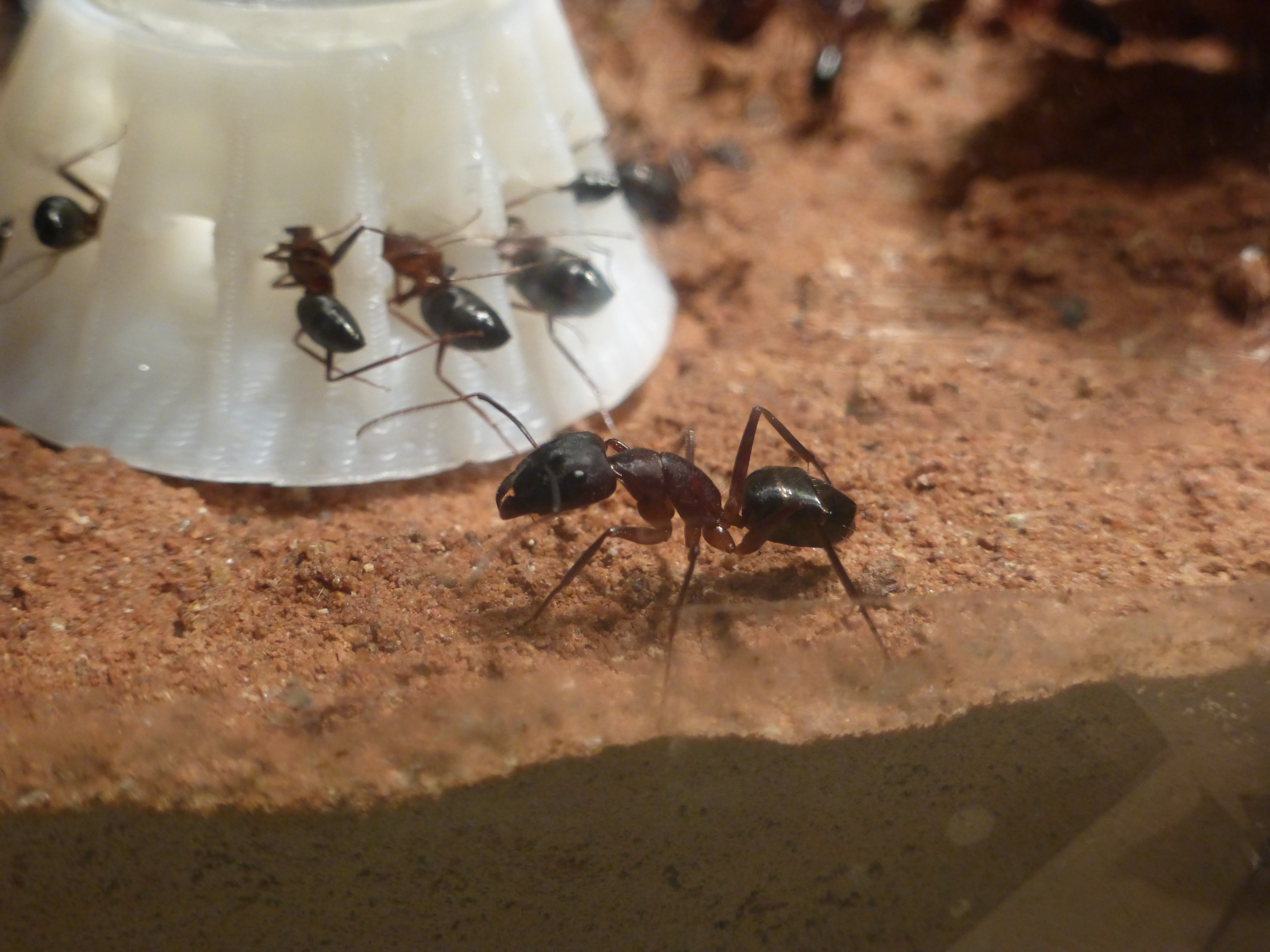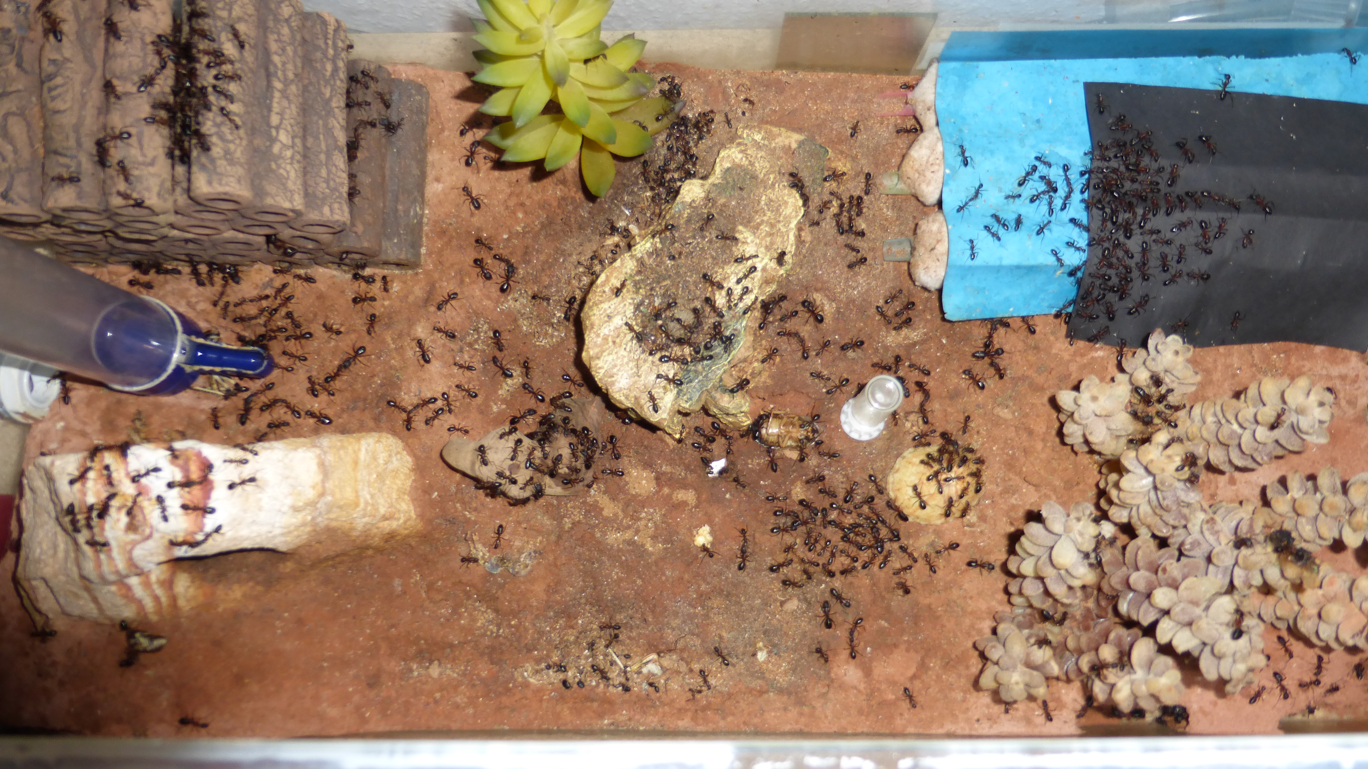 Hier ist ein interessanter Vergleich - Bild 1 zeigt die Ameisen im Becken bei Raumtemperatur, Bild 2 mit aktiver Wärmelampe (die hängt über der unteren rechten Ecke, ich schalte die so zweimal in der Woche für ne halbe Stunde an, um ein Minimum an winterlichem Sonnenschein zu simulieren.
