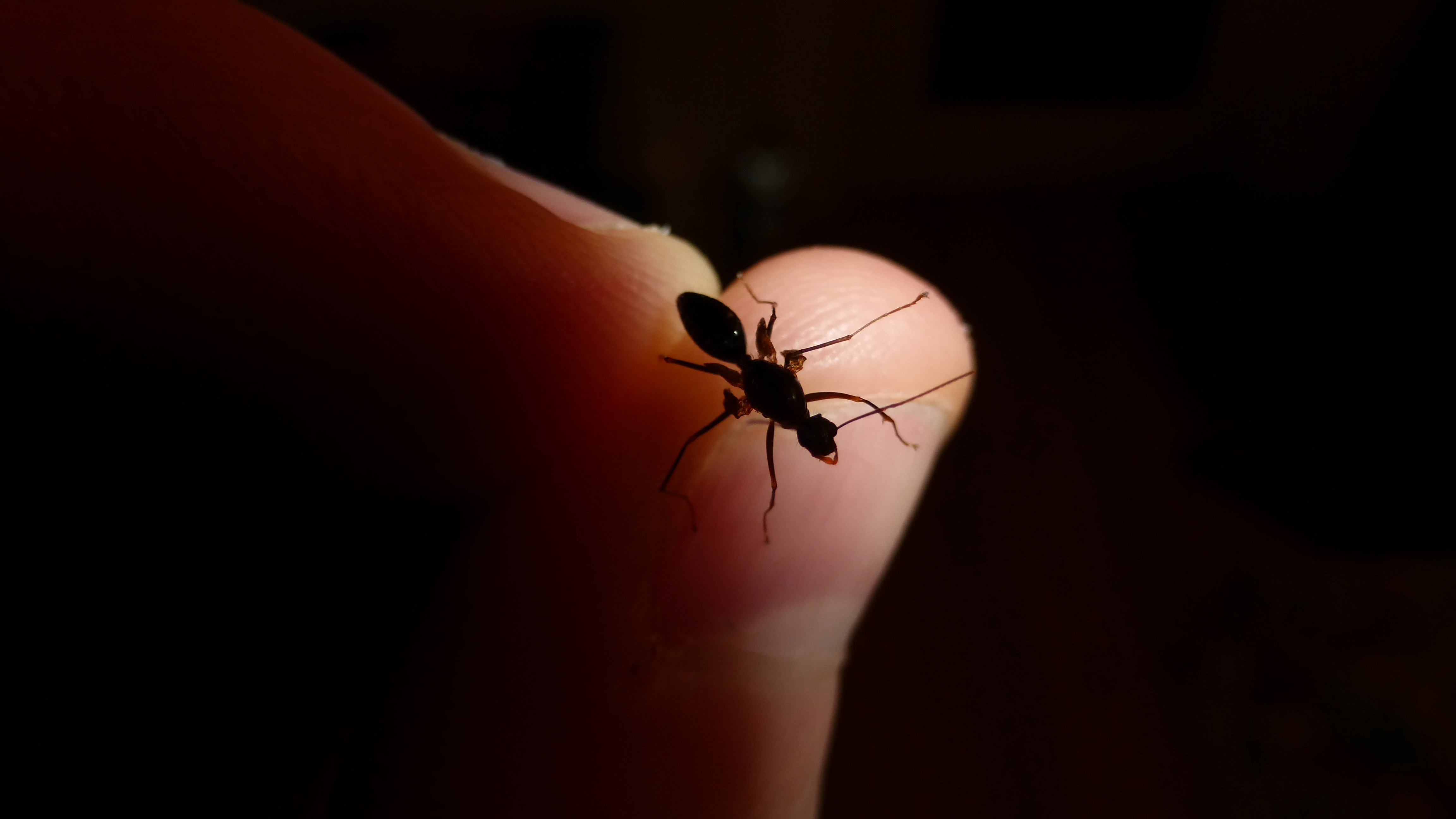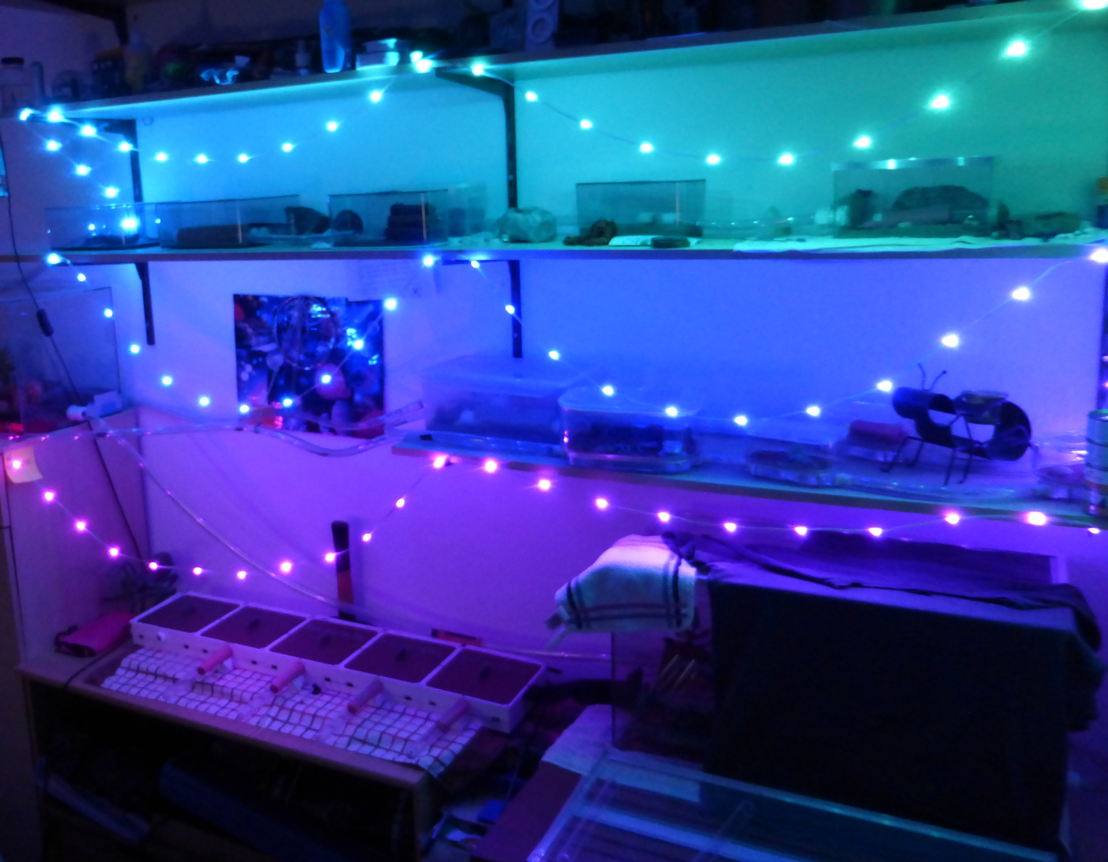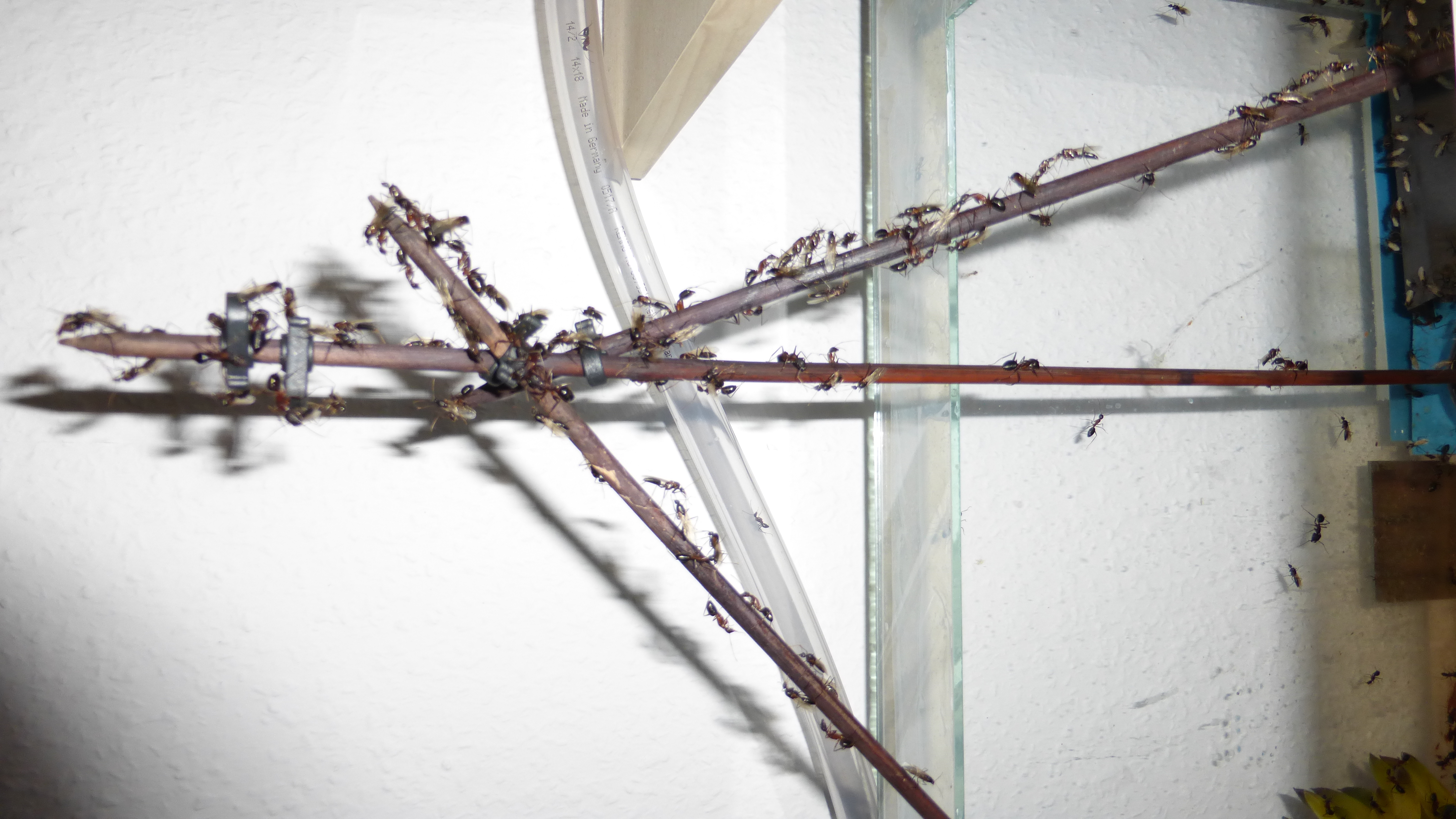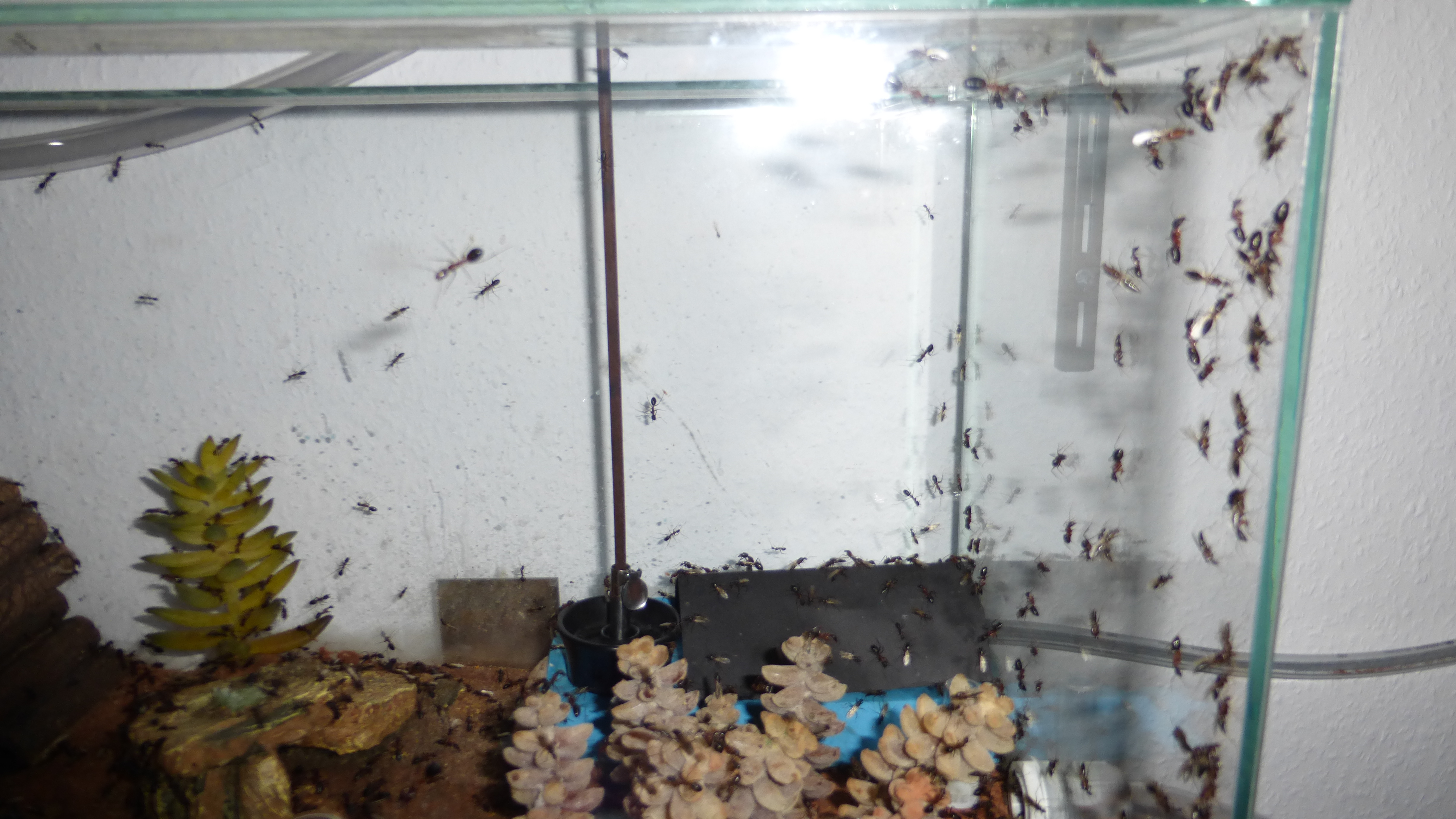 Hier ist ein interessanter Vergleich - Bild 1 zeigt die Ameisen im Becken bei Raumtemperatur, Bild 2 mit aktiver Wärmelampe (die hängt über der unteren rechten Ecke, ich schalte die so zweimal in der Woche für ne halbe Stunde an, um ein Minimum an winterlichem Sonnenschein zu simulieren.