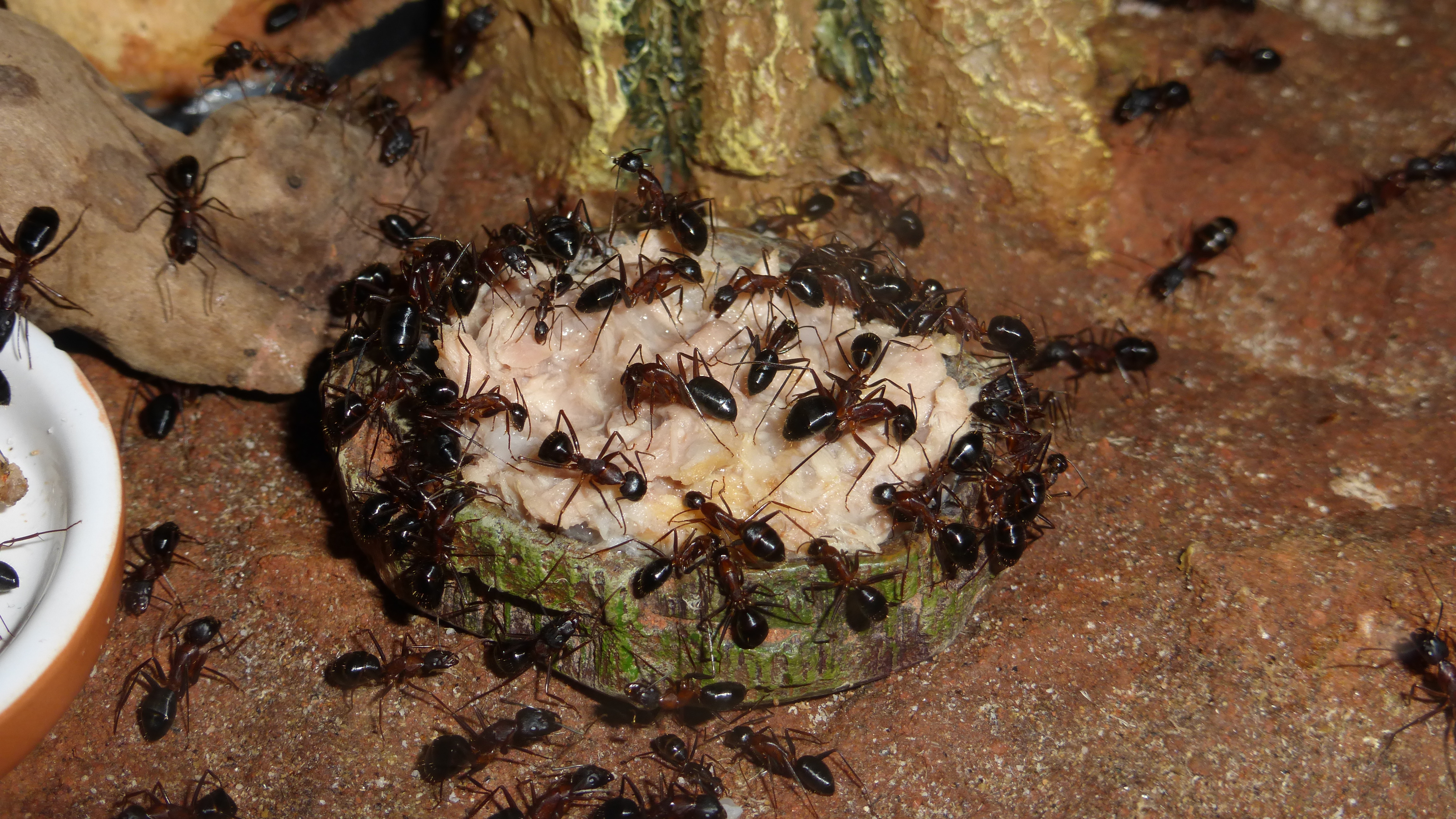 Futtertest mit einem rohen StĂĽck Schweinegeschnetzeltem, wurde ĂĽberraschend gut angenommen. Im zweiten Bild transportiert eine der Arbeiterinnen gerade ein StĂĽck ab.