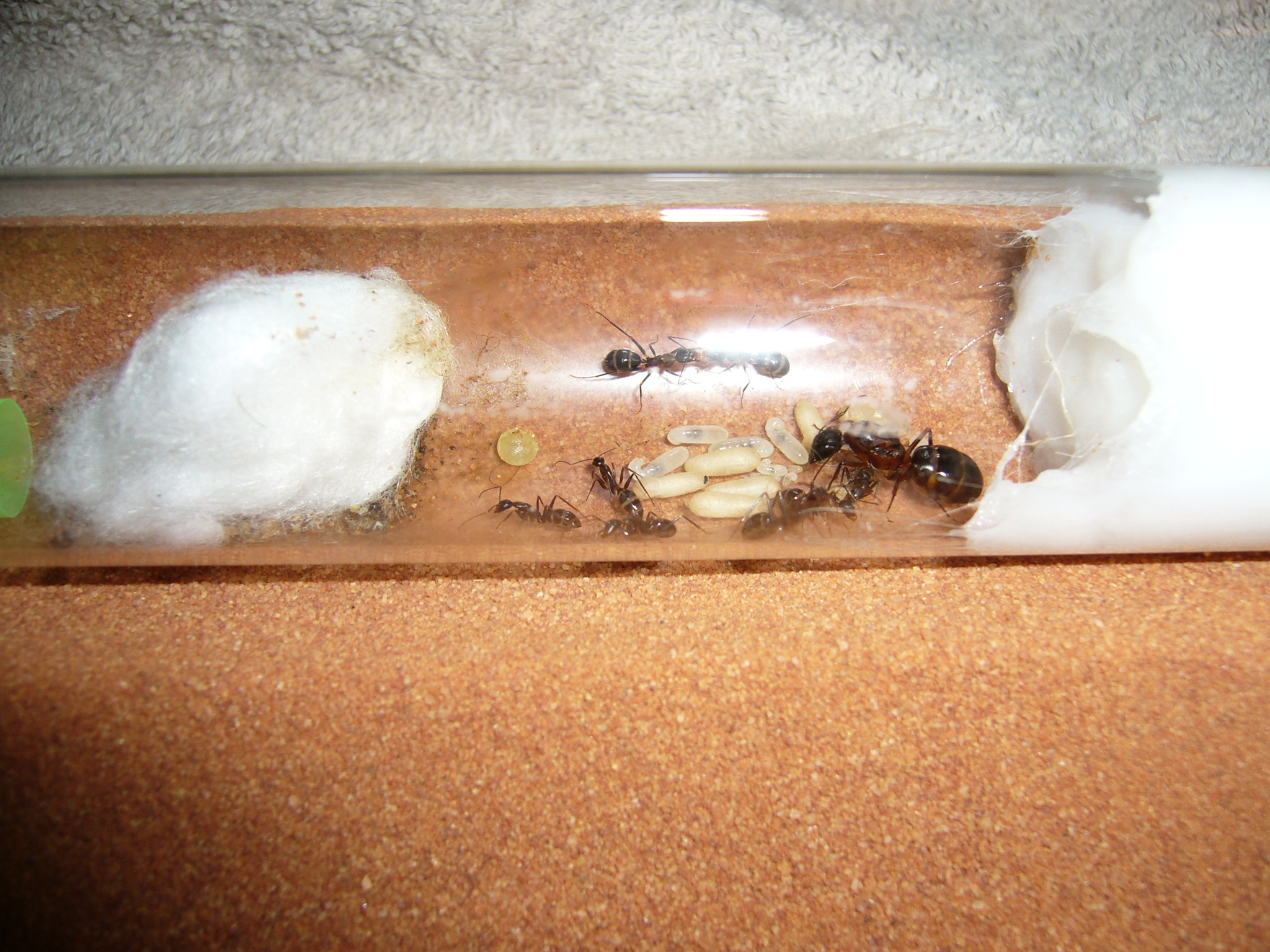 Wollte ihnen ein neues Glas anbieten, das war aber nicht ganz dicht und der gesamte Inhalt (30x200mm RG) floss in die Arena. Hat zwei Tage mit der Wärmelampe gebraucht um die Luftfeuchtigkeit von 70% auf den Normalwert von 40-50% runterzubekommen. Die Ameisen hats nicht gestört.