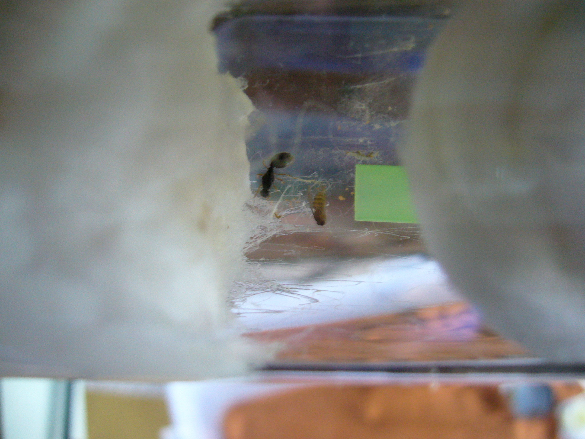 Und ein Update zu den Solenopsis fugax (muss ebenfalls separaten HB anlegen). Diese winzigen Damen entwickeln sich zu echt gefräßigen kleinen Monstern. Jede Fruchtfliege wird sofort zum Nesteingang gezerrt und bearbeitet und bei einer kleinen Bienenlarve sind sie total ausgeflippt.