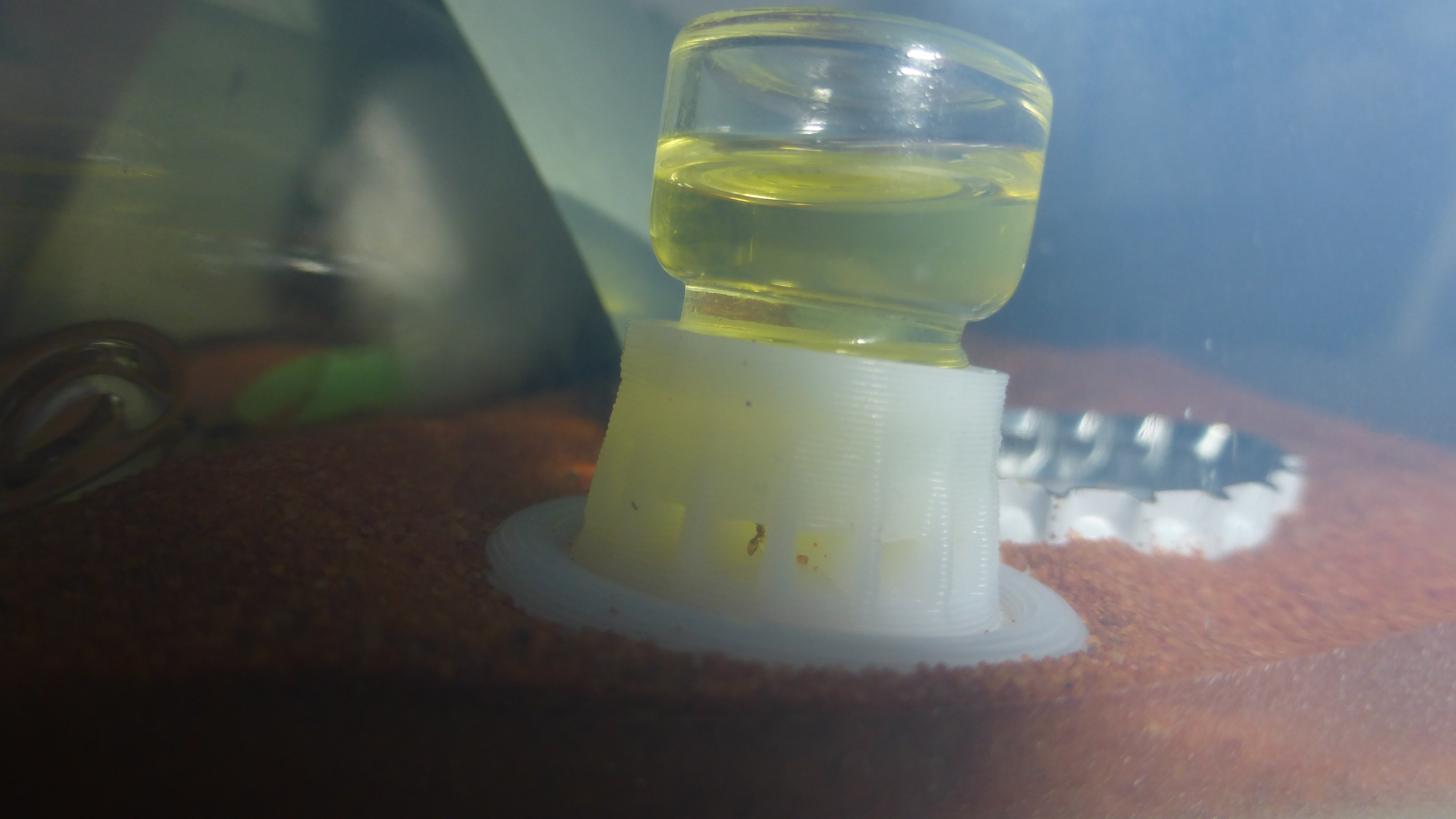 Zuckerwasser wird auch fleißig angenommen, auch wenn das am Pegel in der Tränke nicht wirklich was ändert - die Ameisen sind einfach zu winzig. Muss an dieser Stelle auch noch mal eine Lanze für die byFormica Galileo feeders brechen, diese Tränken sind wirklich sicher, selbst so mikroskopisch kleine Ameisen wie Solenopsis fugax können darin nicht ertrinken.